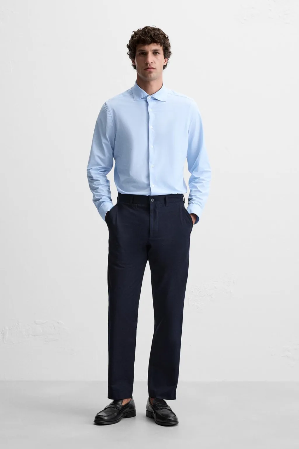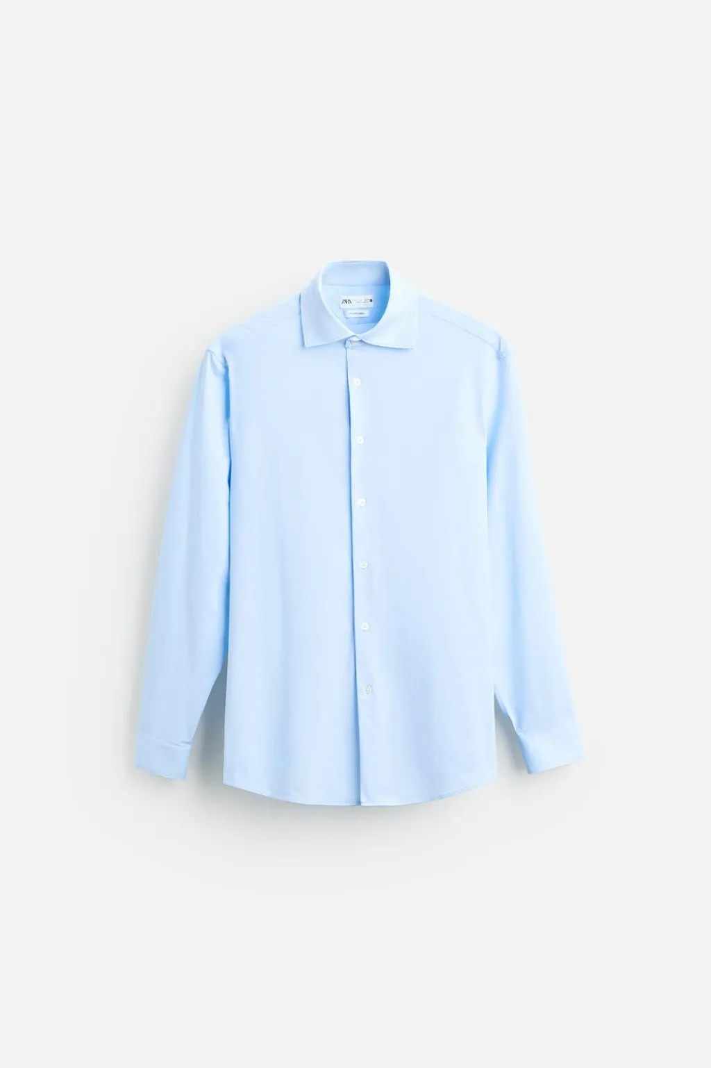 Camisa slim fit confeccionada en un tejido que minimiza la necesidad de plancha después del lavado. Cuello italiano abierto y manga larga acabada en puño con botón. Cierre frontal de botonadura.