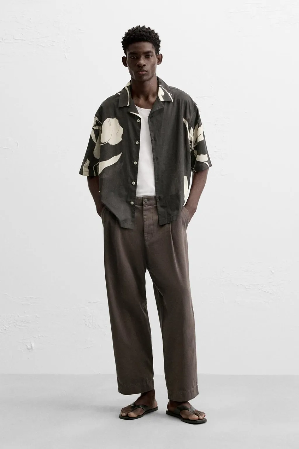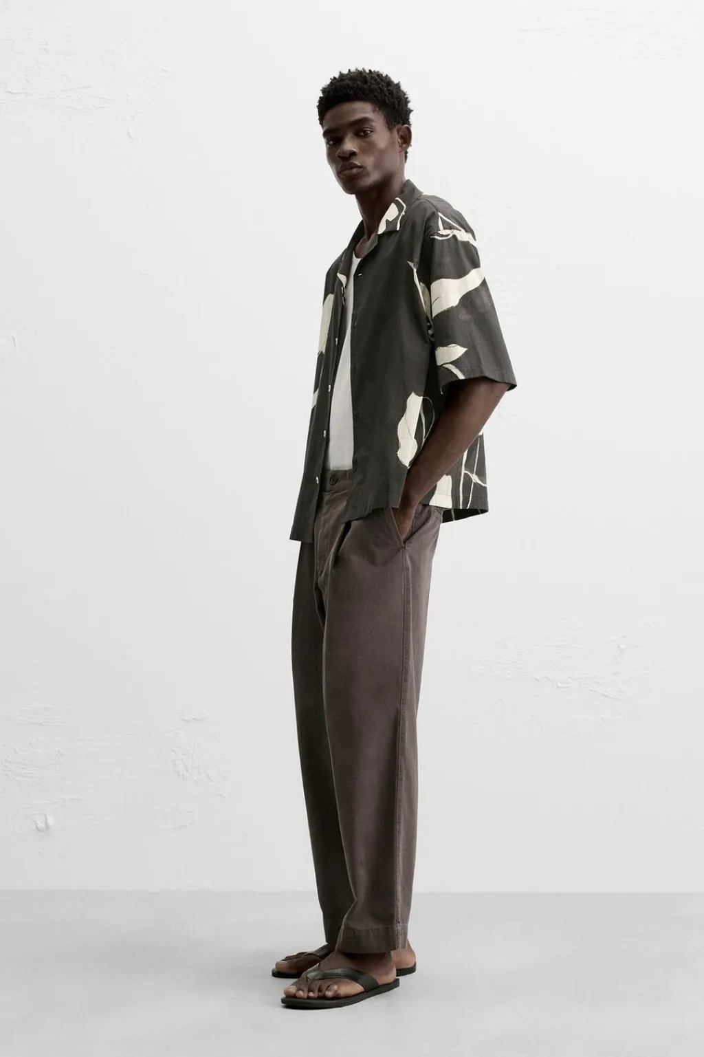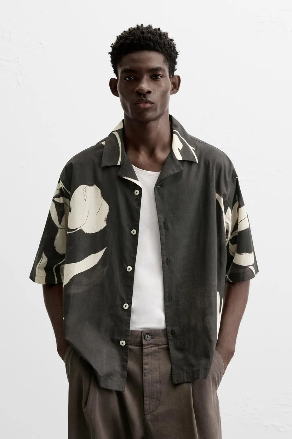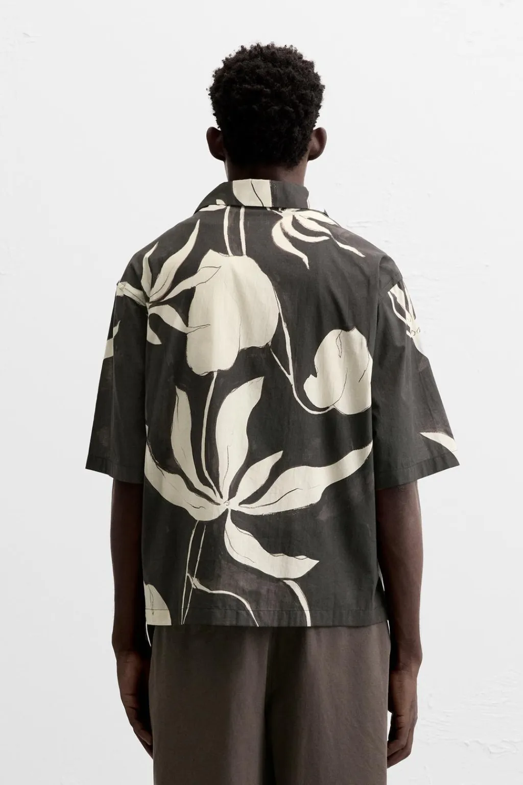 Camisa relaxed fit confeccionada en algodón ligero. Cuello bowling y manga corta. Bajo con aberturas laterales. Cierre frontal de botonadura.