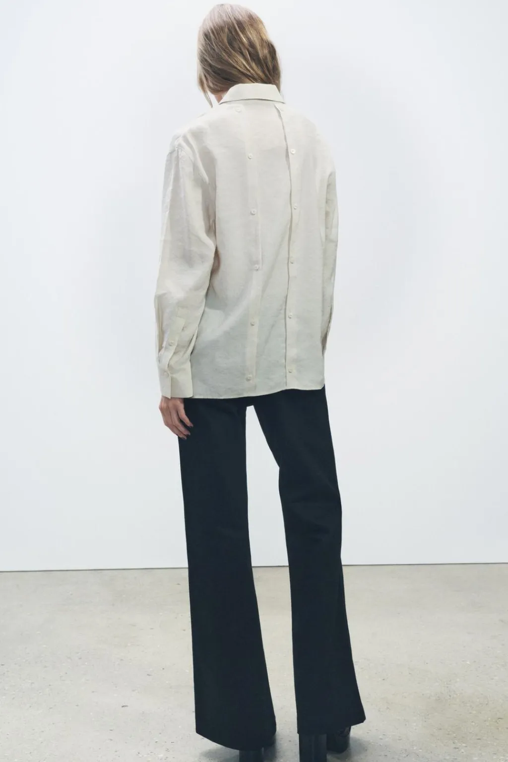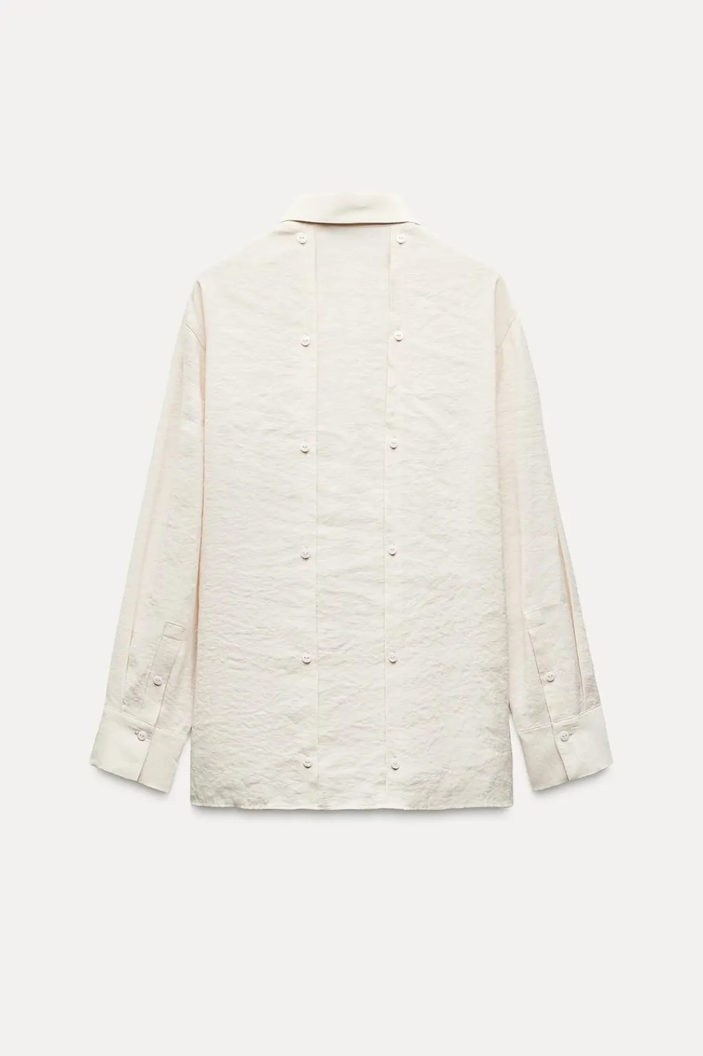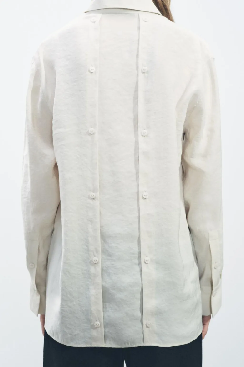 Camisa fluida confeccionada en hilatura con mezcla de modal. Cuello solapa y manga larga acabada en puño. Detalle de botones en espalda. Cierre frontal con botones ocultos por solapa.