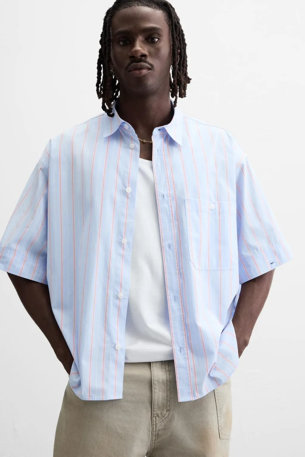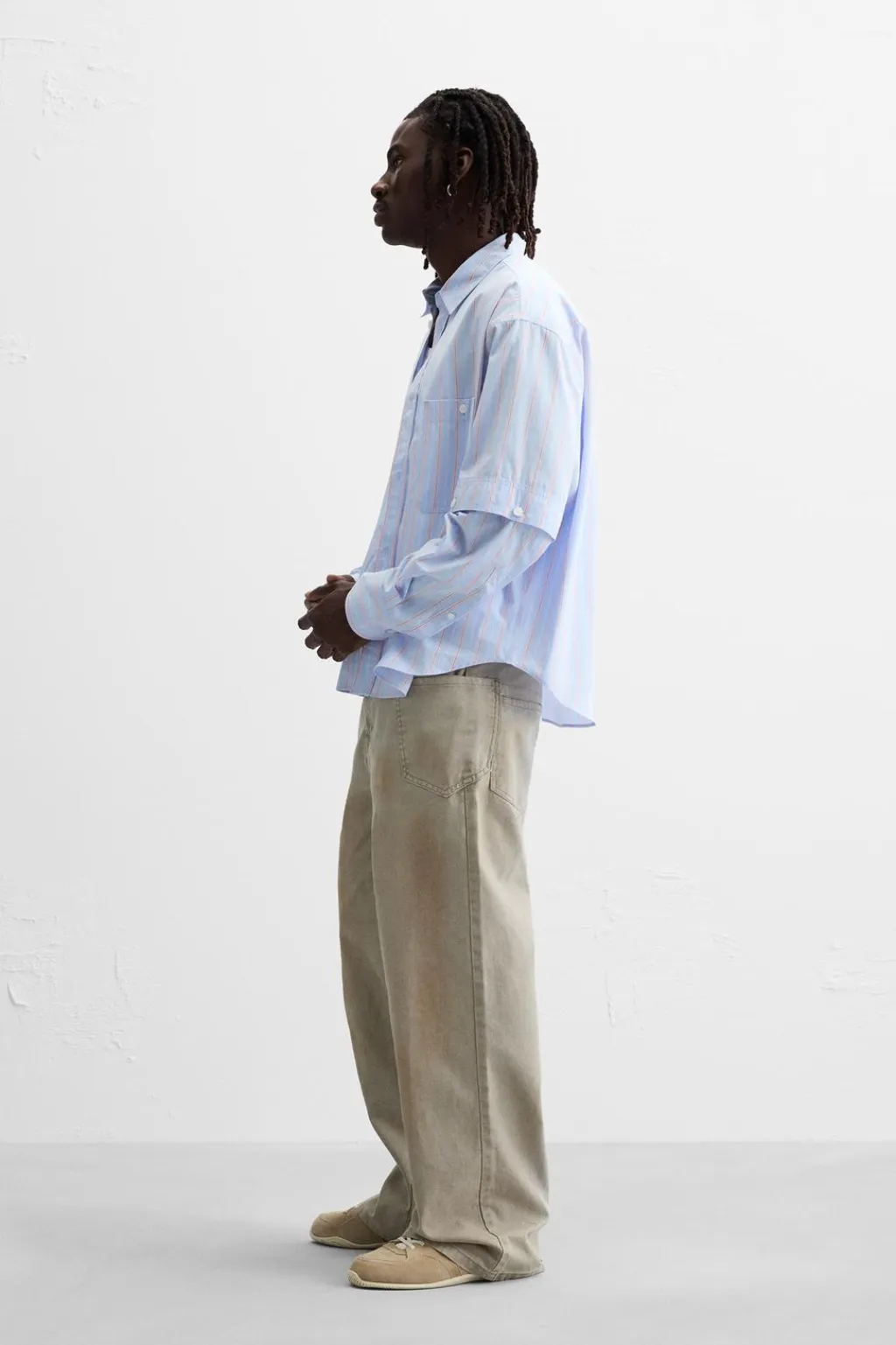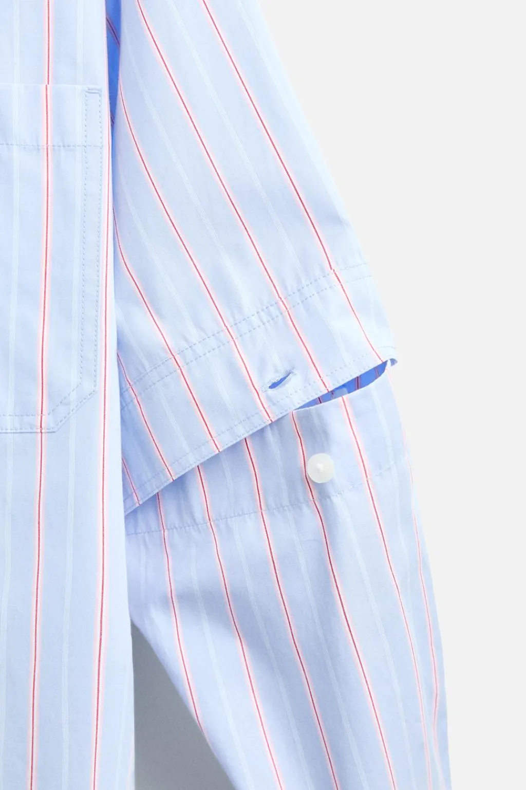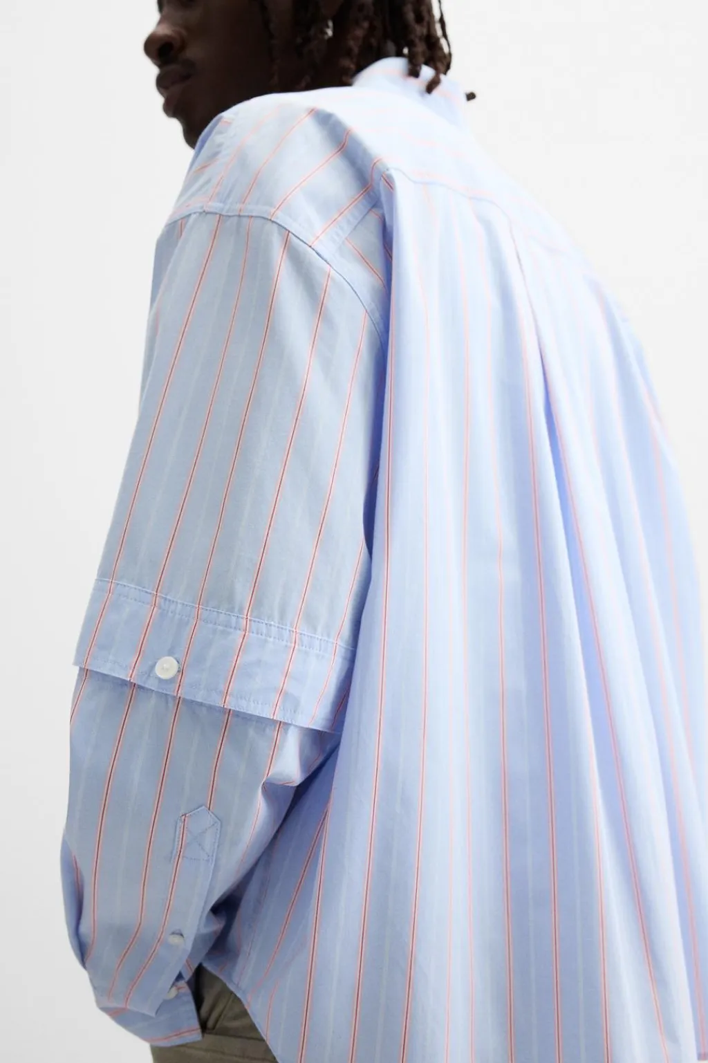 Camisa relaxed fit confeccionada en tejido de algodón. Cuello solapa y manga larga desmontable mediante botones. Bolsillo plastrón en pecho. Cierre frontal de botonadura.