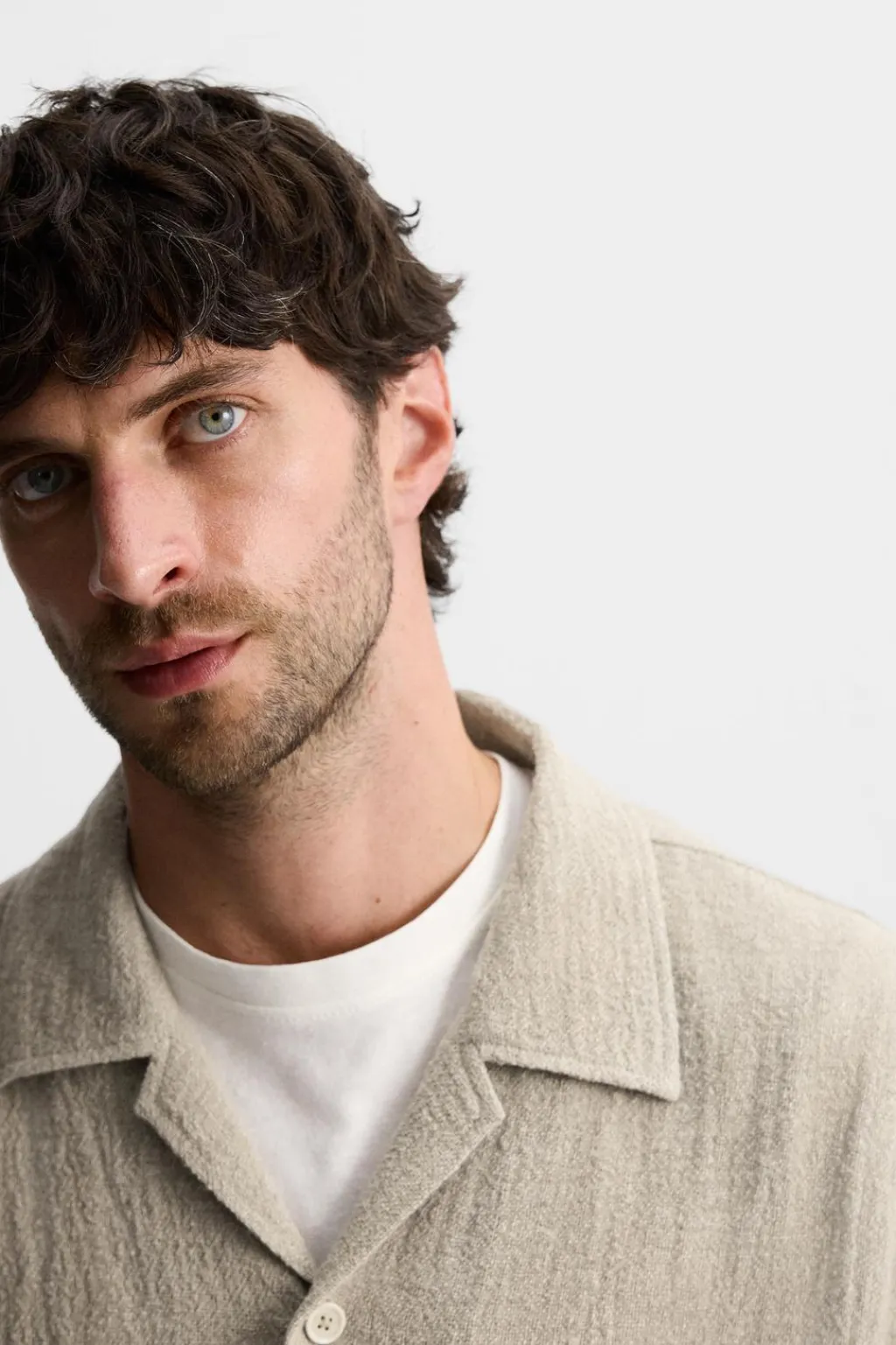 Camisa oversize fit confeccionada en tejido de lino. Cuello bowling y manga corta. Cierre frontal de botonadura.