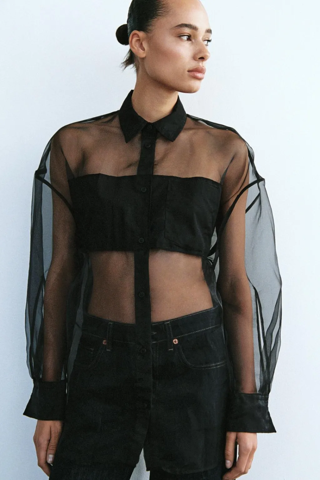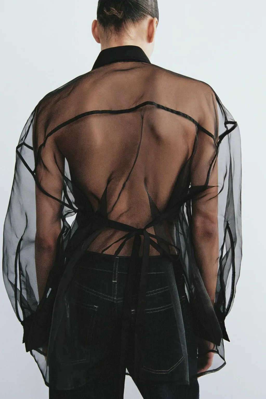 Camisa oversize semitransparente de cuello solapa. Manga larga con hombro caído y abertura acabada en puño. Bolsillo de plastrón en delantero. Detalle de tejido y lazadas combinadas a tono. Cierre frontal con botones.