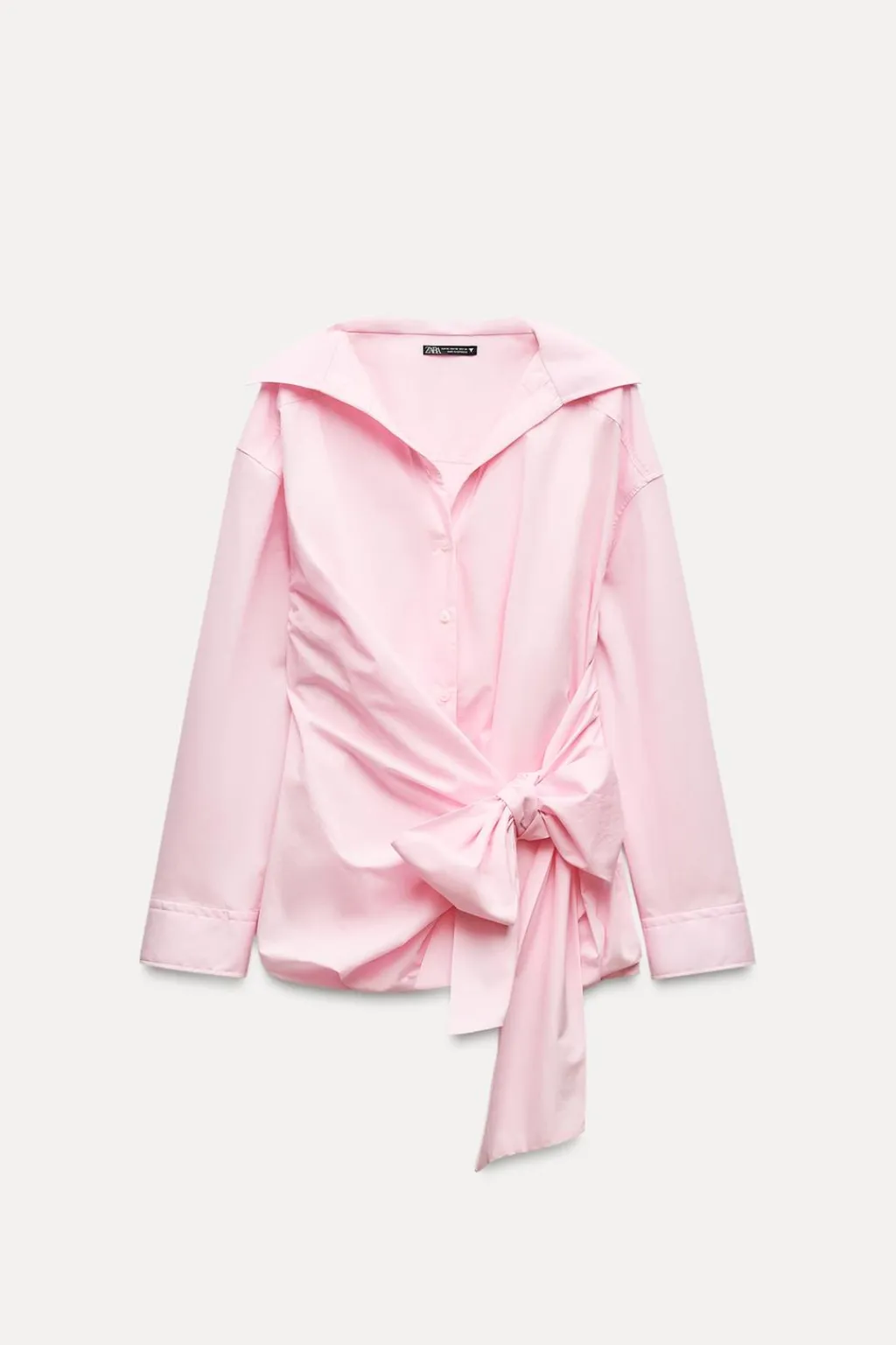 Camisa oversize de cuello solapa y manga larga con hombro caído acabada en puño. Detalle de lazo en delantero. Bajo acabado abullonado con pliegues. Cierre frontal con botones.
