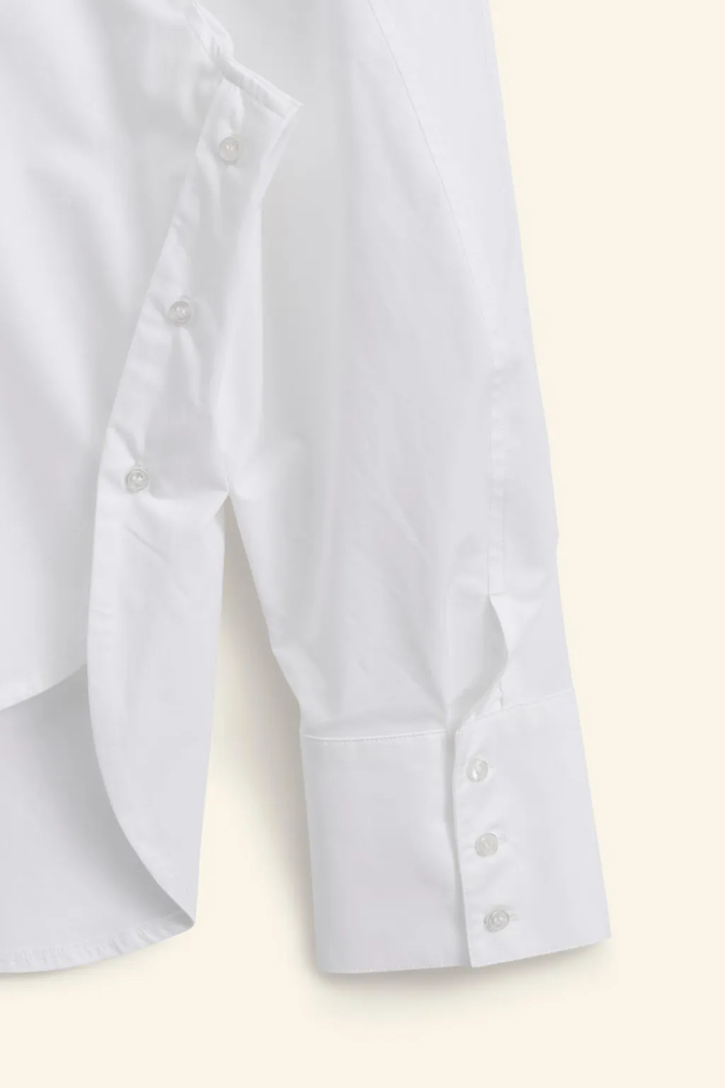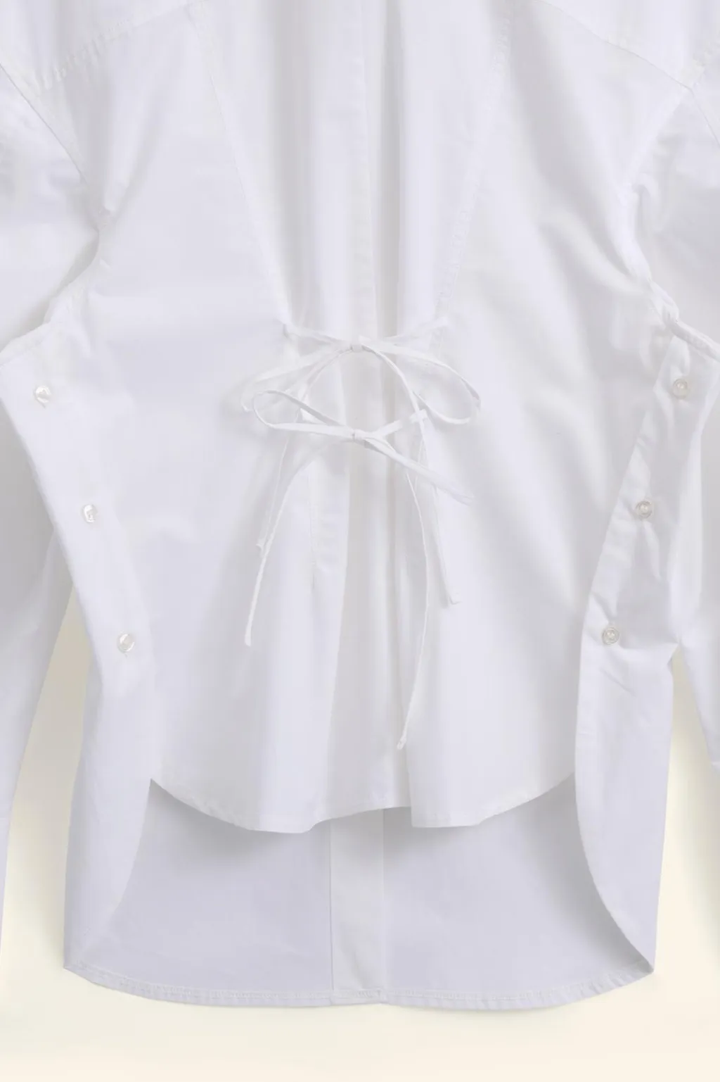 Camisa confeccionada en hilatura de algodón 100%. Cuello solapa y manga larga acabada en puño con abertura y botones. Bajo asimétrico con botones laterales. Espalda con lazadas en mismo tejido. Cierre frontal con botones.