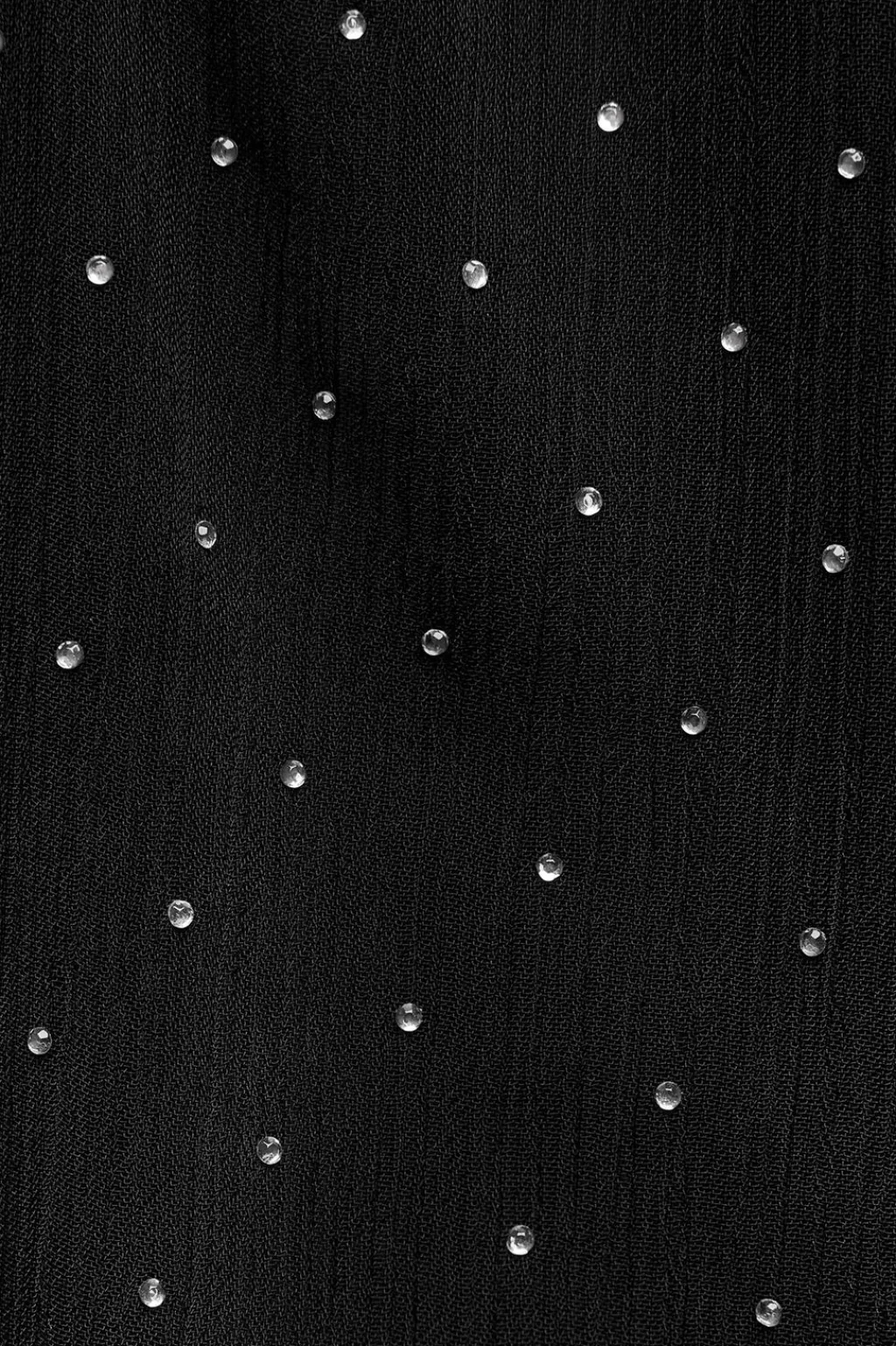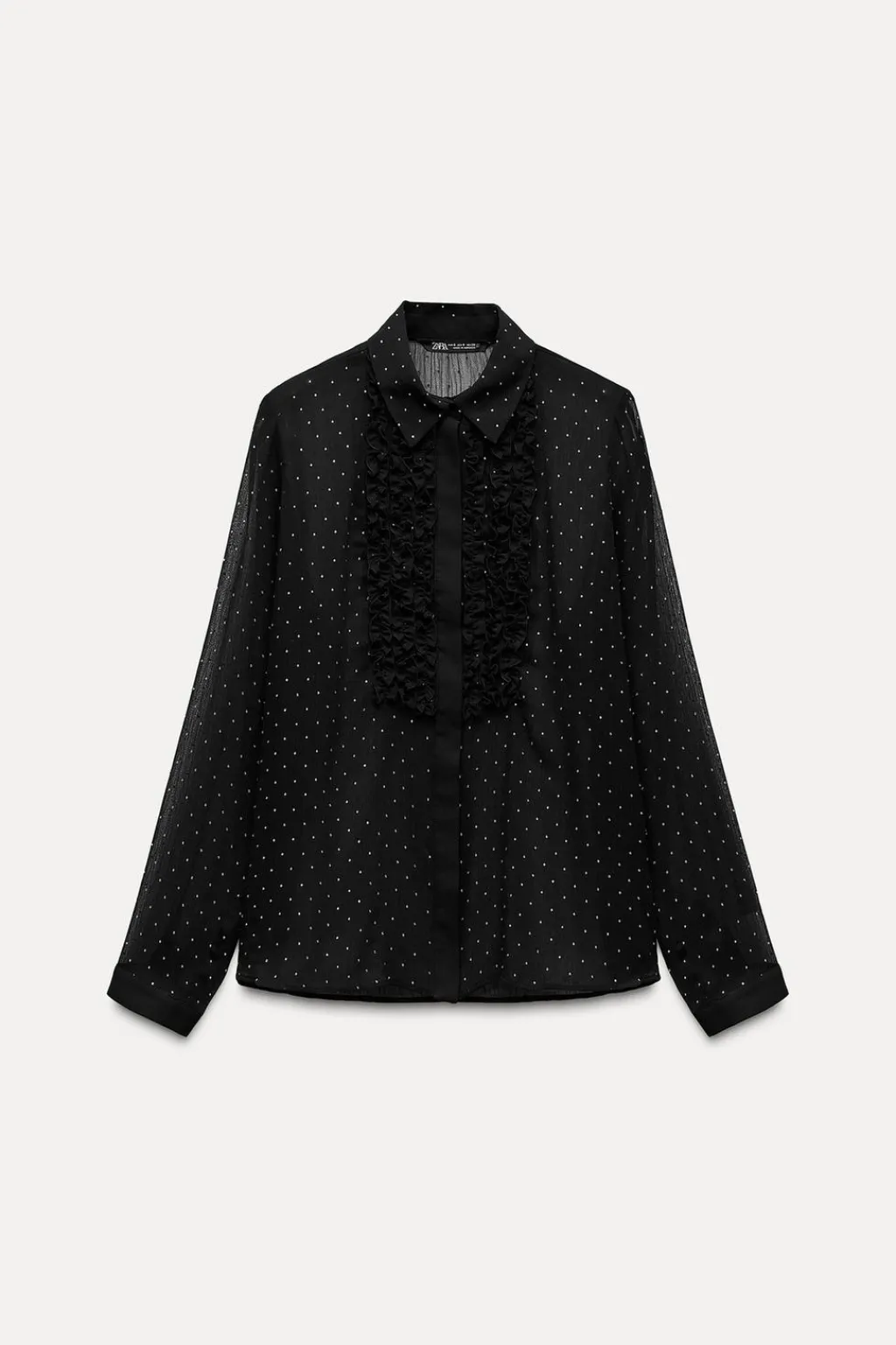 Camisa de cuello solapa y manga larga. Detalle de jaretas delanteras y aplicación de abalorios con brillos. Cierre frontal con botones ocultos por solapa.