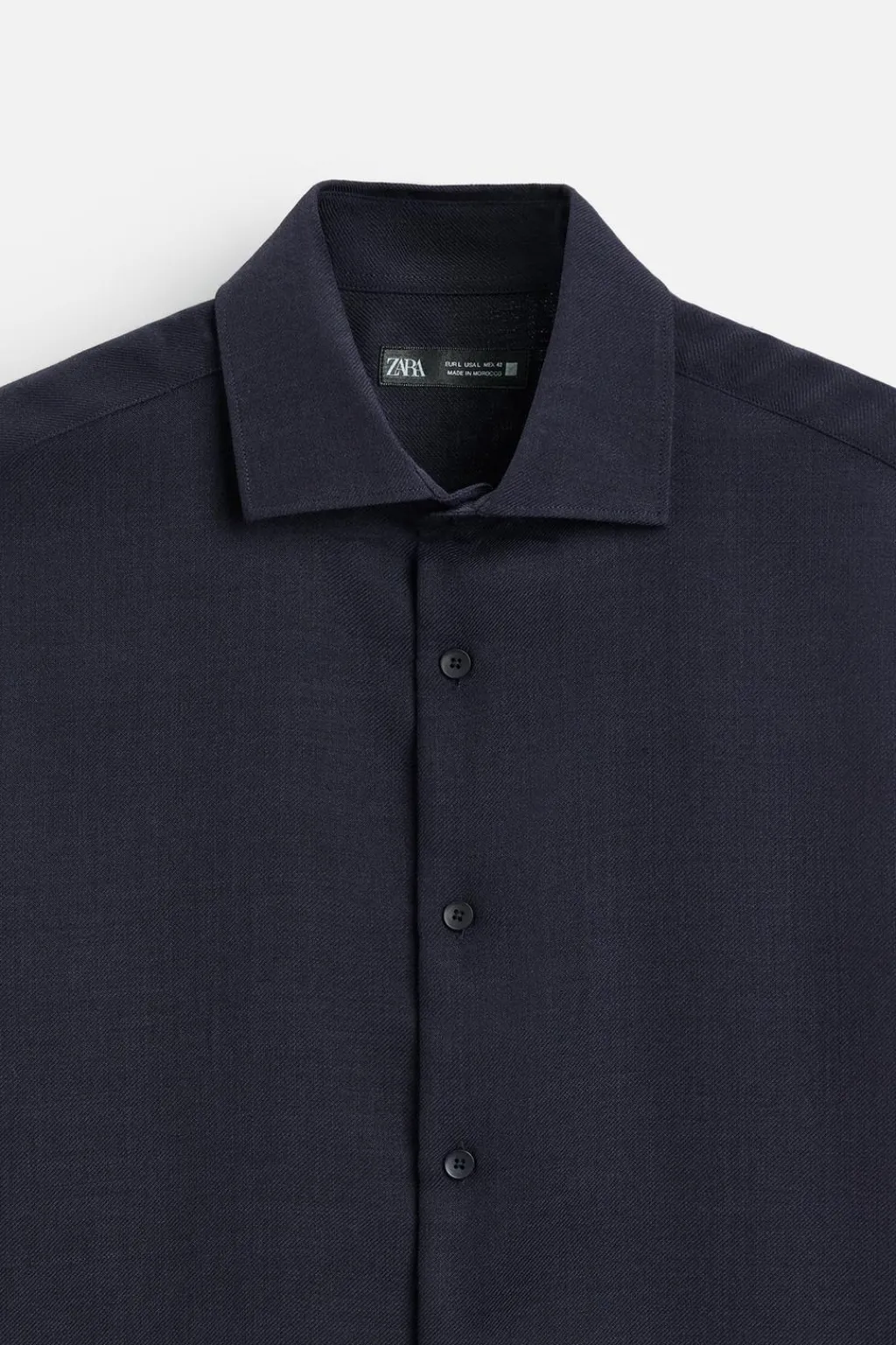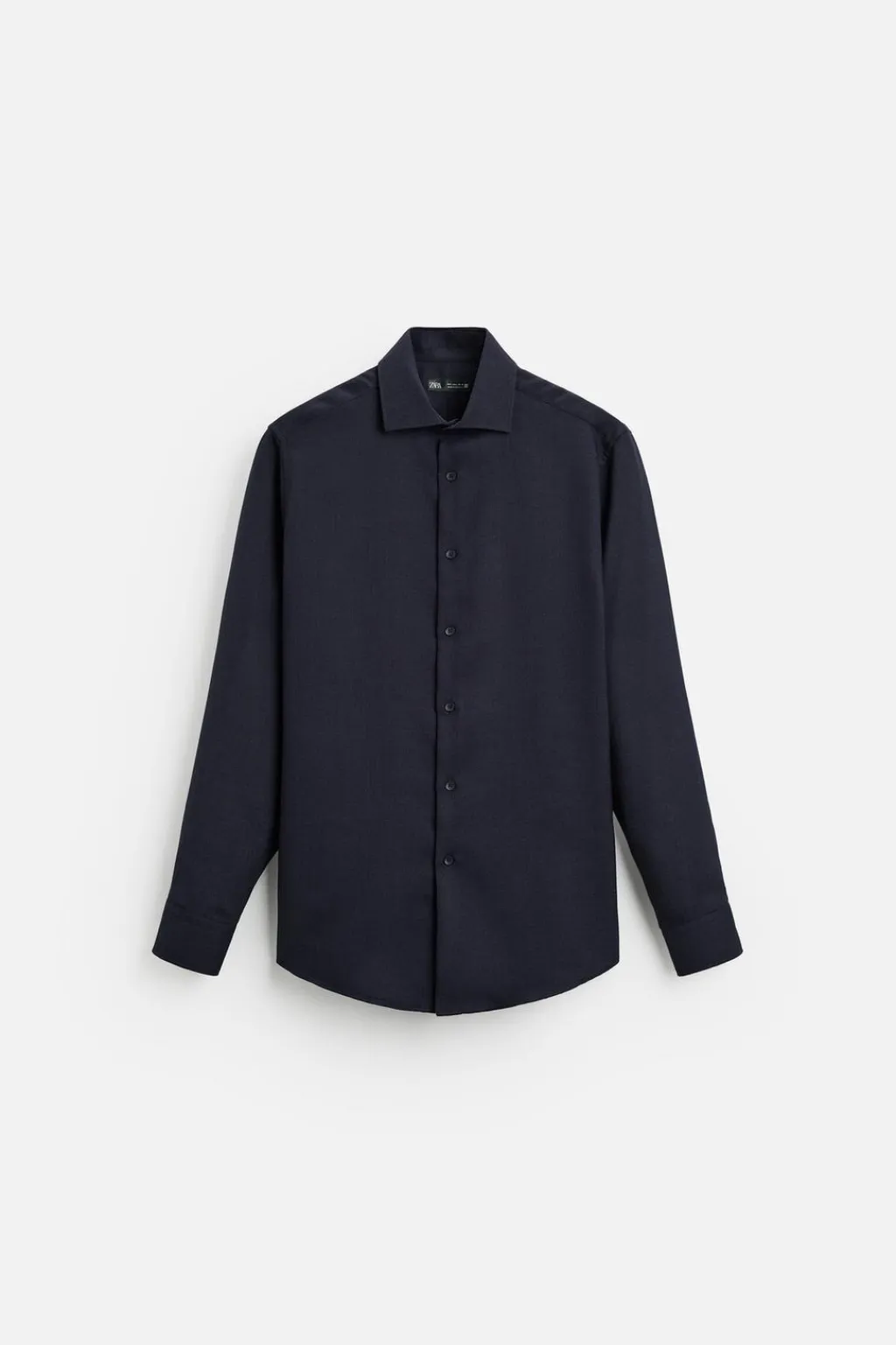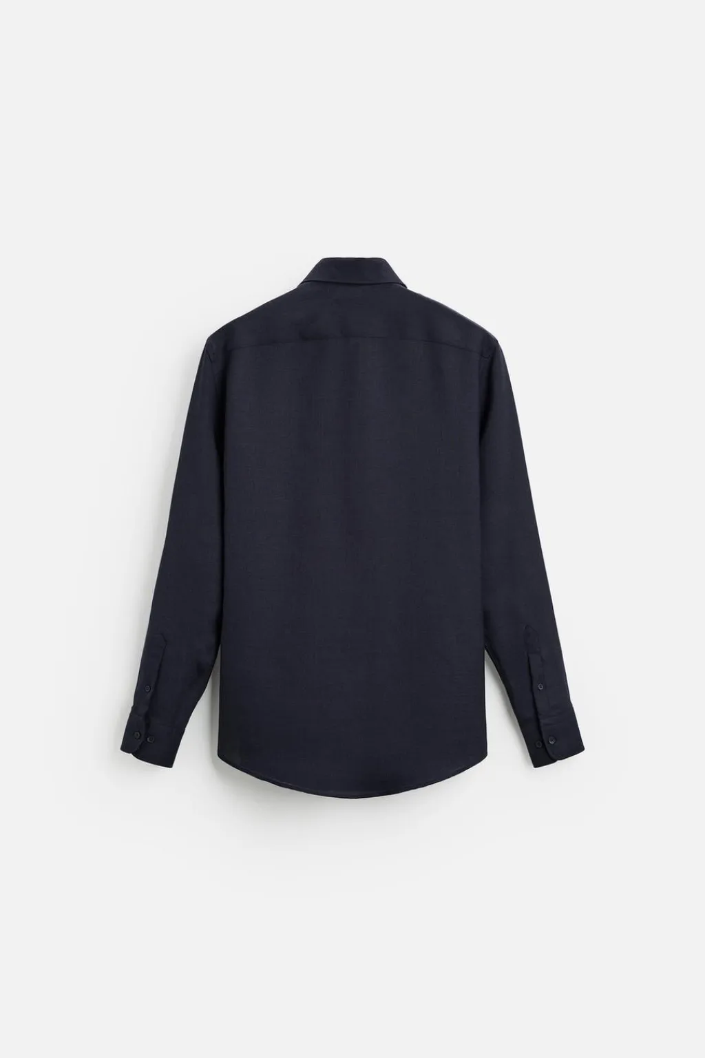 Camisa slim fit confeccionada en tejido twill con lana. Cuello italiano abierto y manga larga acabada en puño con botón. Cierre frontal de botonadura.
