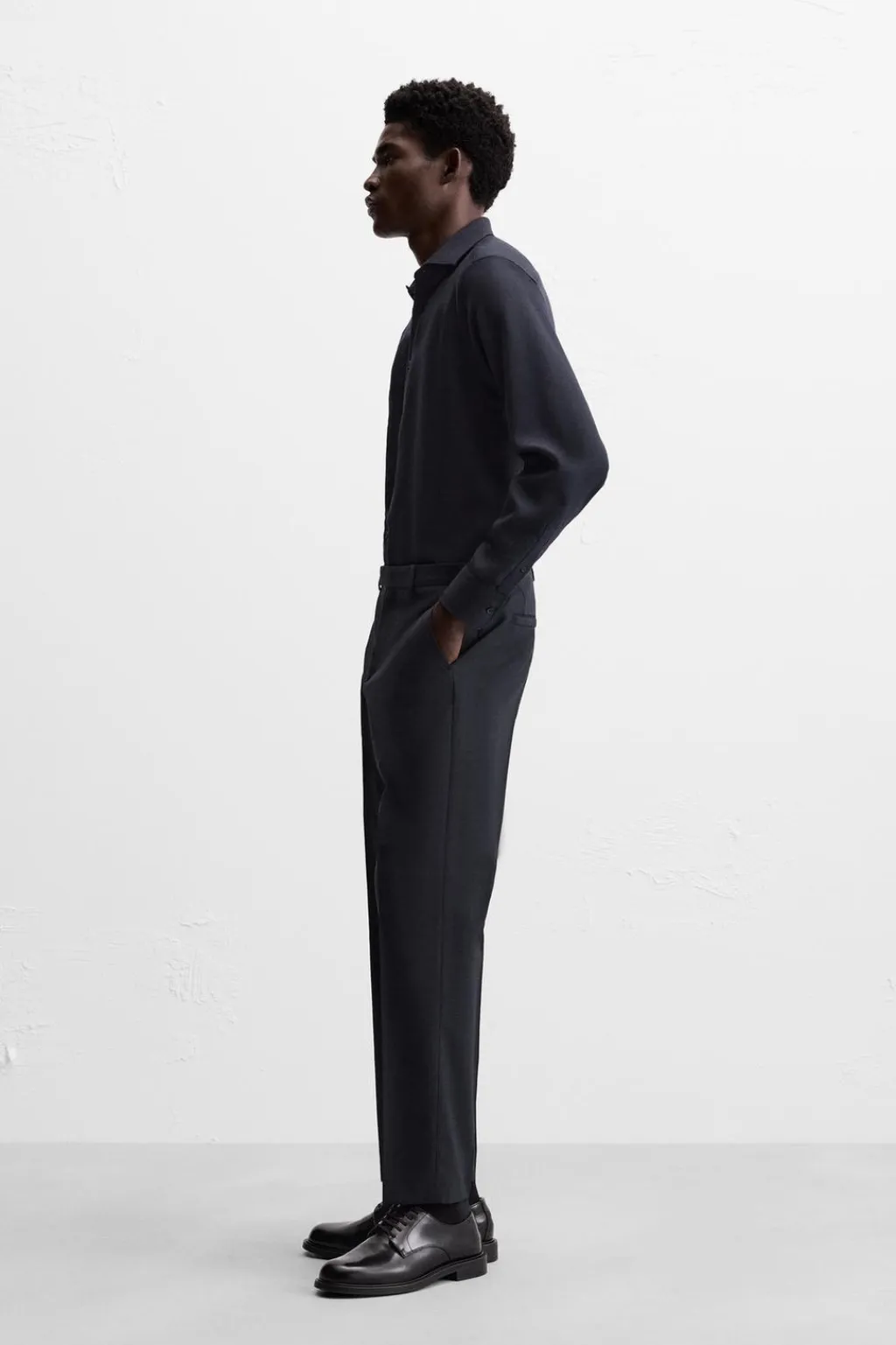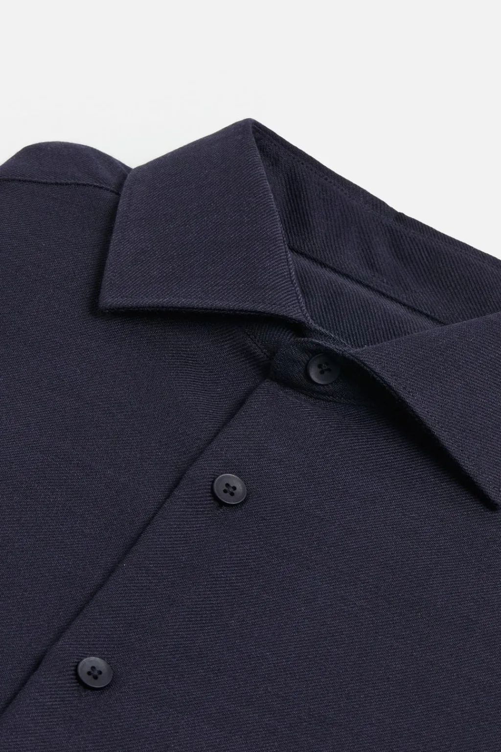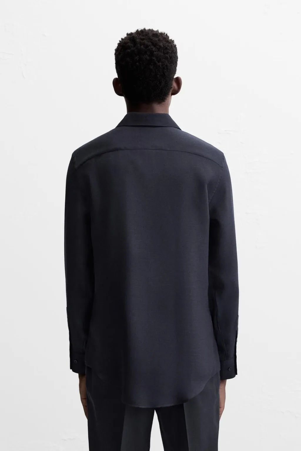 Camisa slim fit confeccionada en tejido twill con lana. Cuello italiano abierto y manga larga acabada en puño con botón. Cierre frontal de botonadura.