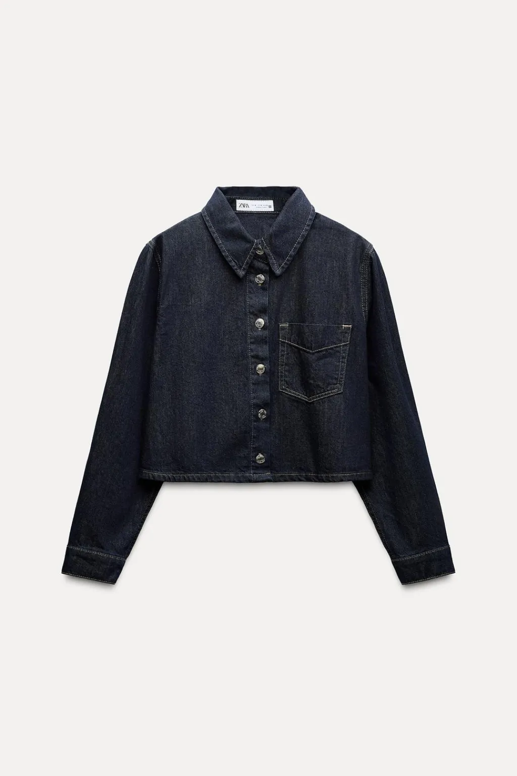 Camisa confeccionada en denim de cuello solapa y manga larga acabada en puño. Bolsillo de plastrón en pecho. Cierre frontal con botones metálicos.