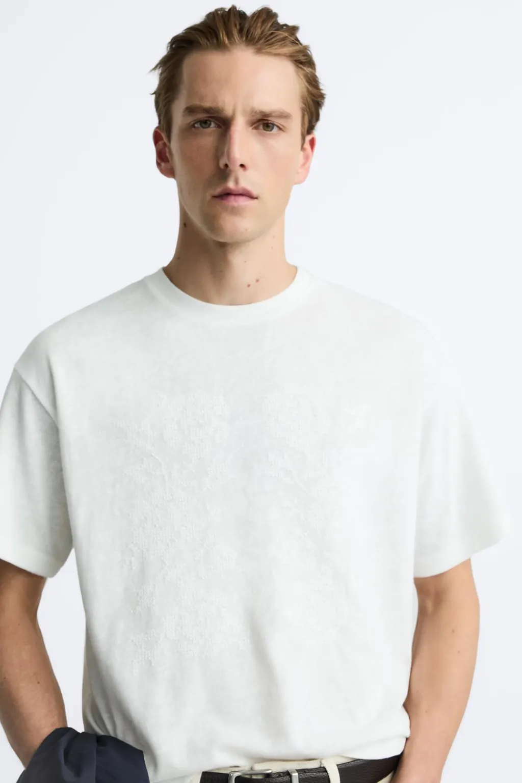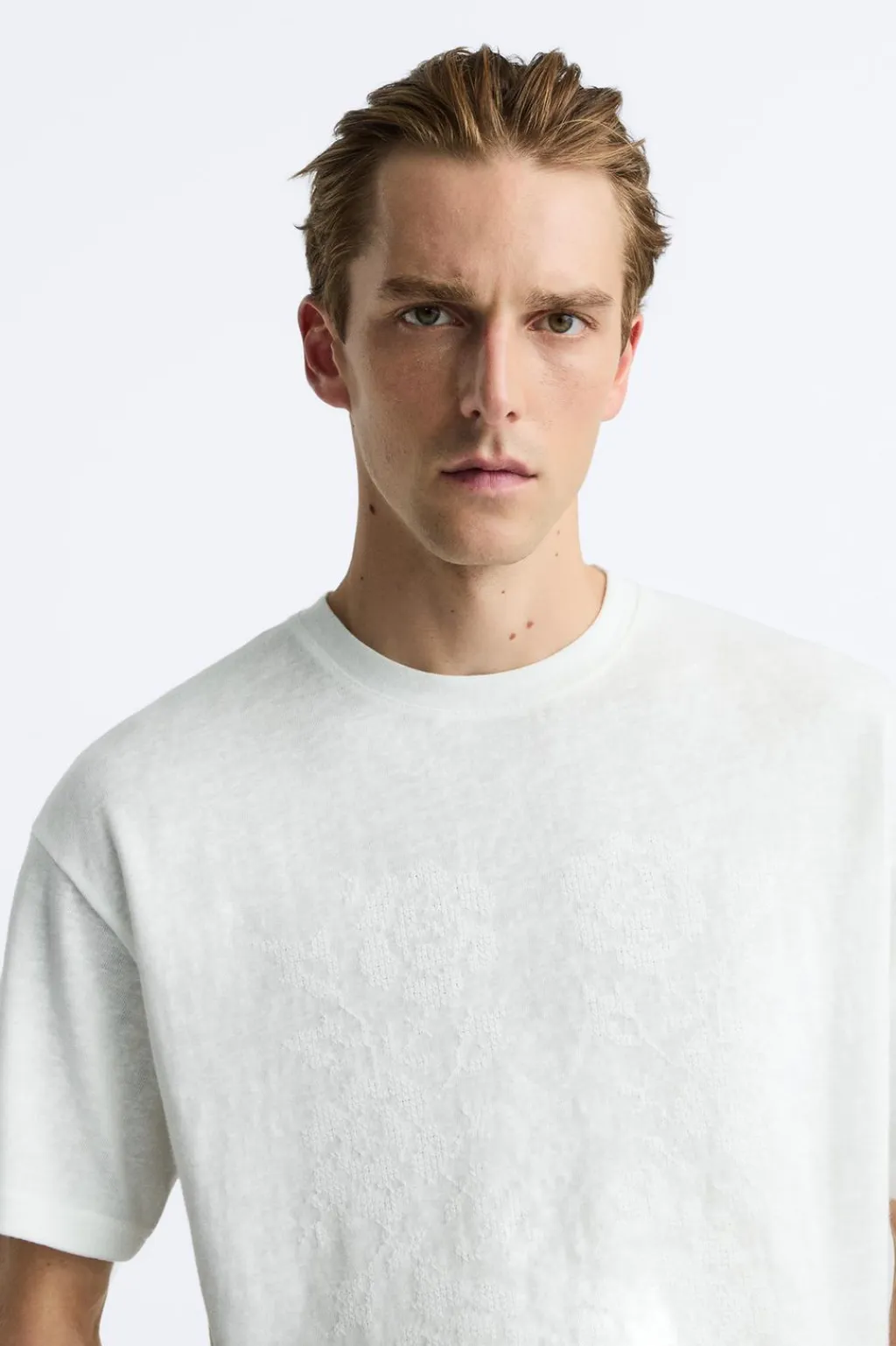 Camiseta regular fit. Cuello redondo y manga corta. Detalle de bordado frontal combinado a tono.