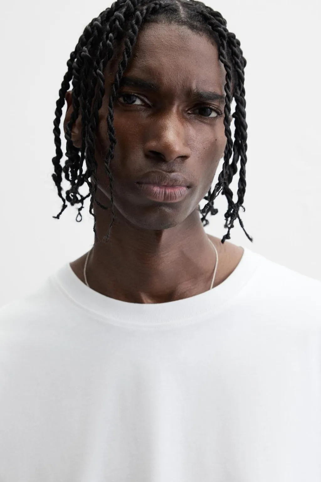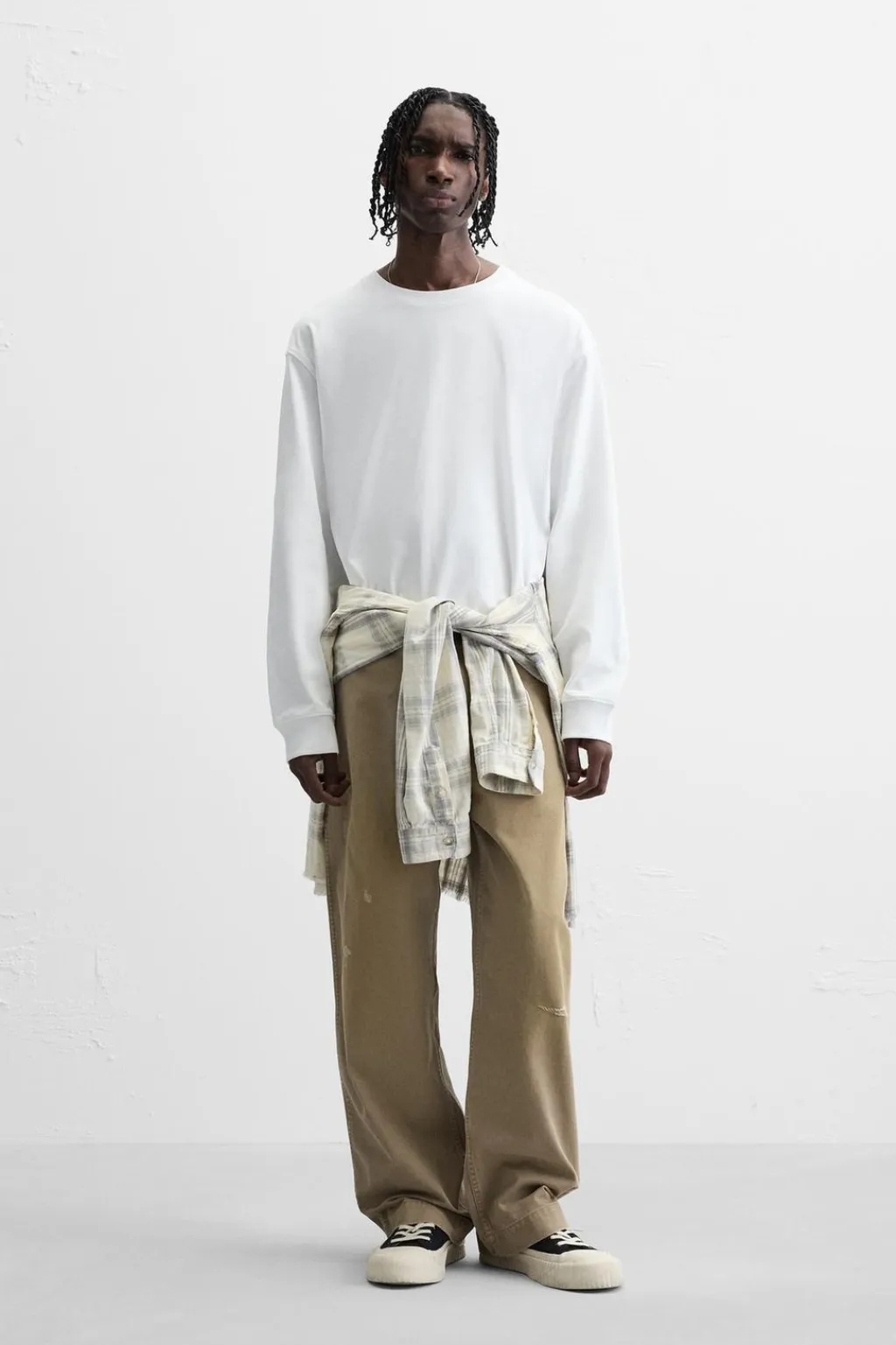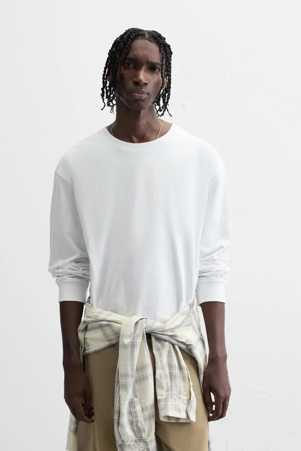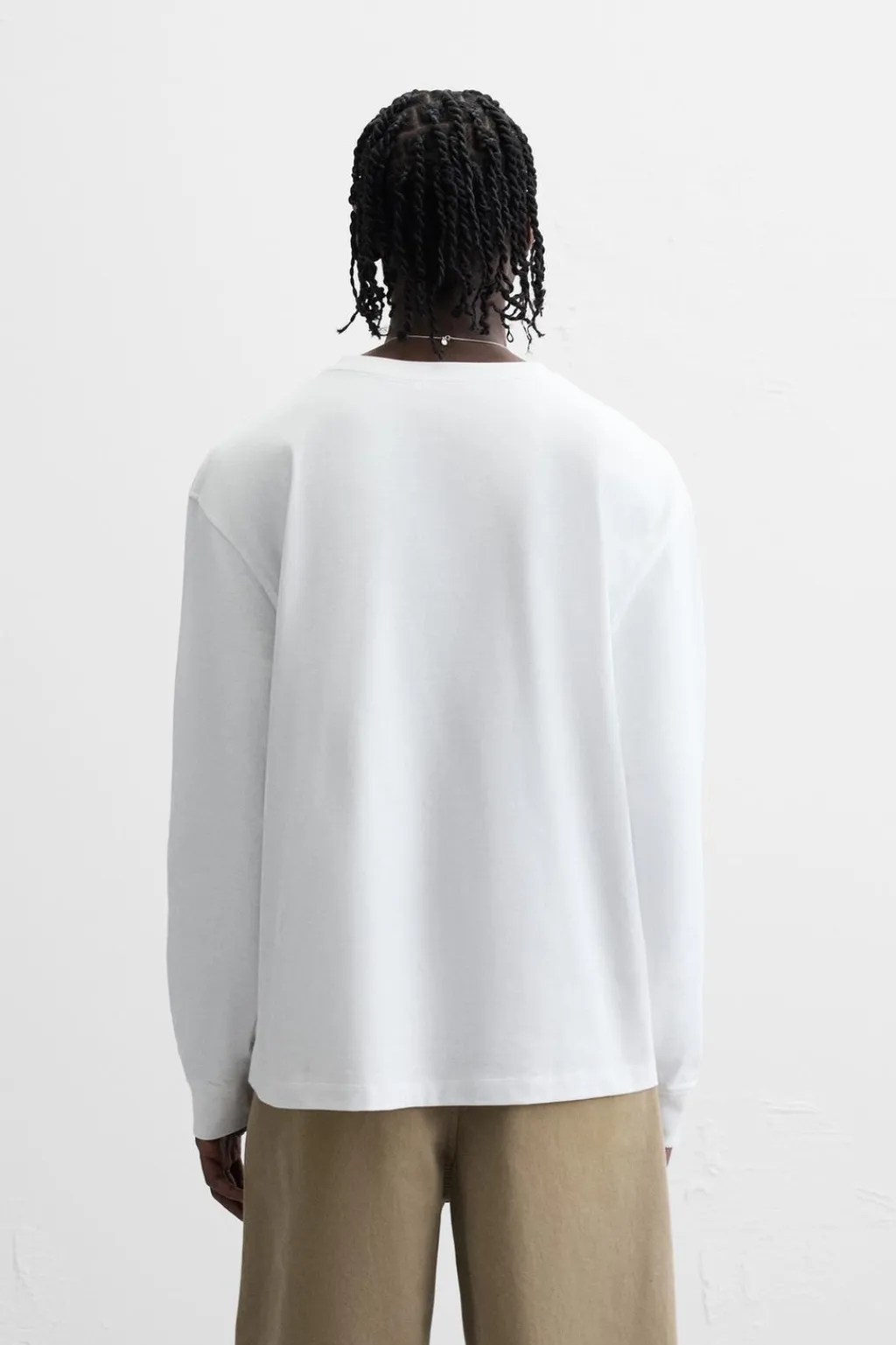 Camiseta relaxed fit confeccionada en tejido de algosón compacto. Cuello redondo y manga larga acabada en puño de rib.