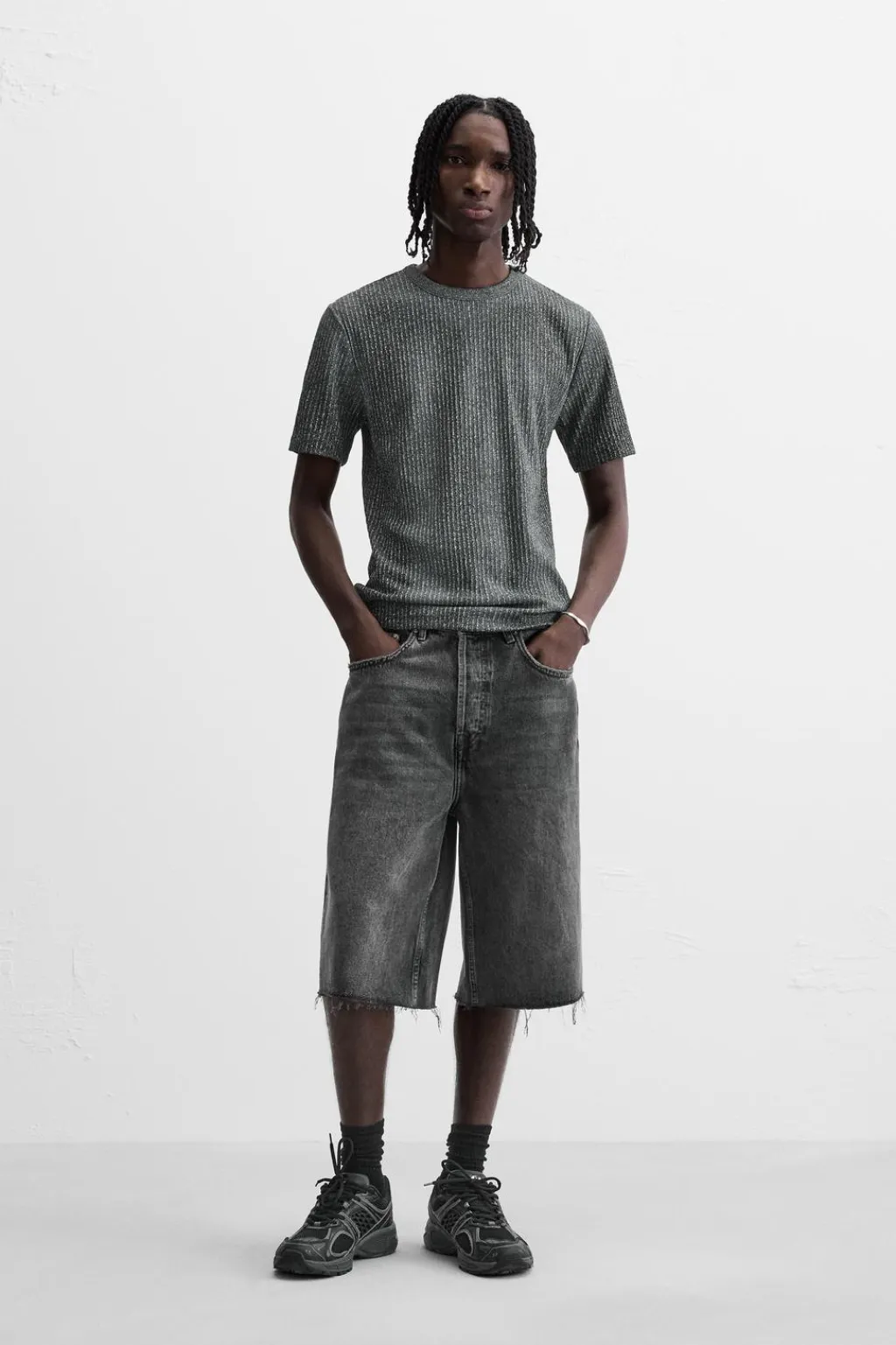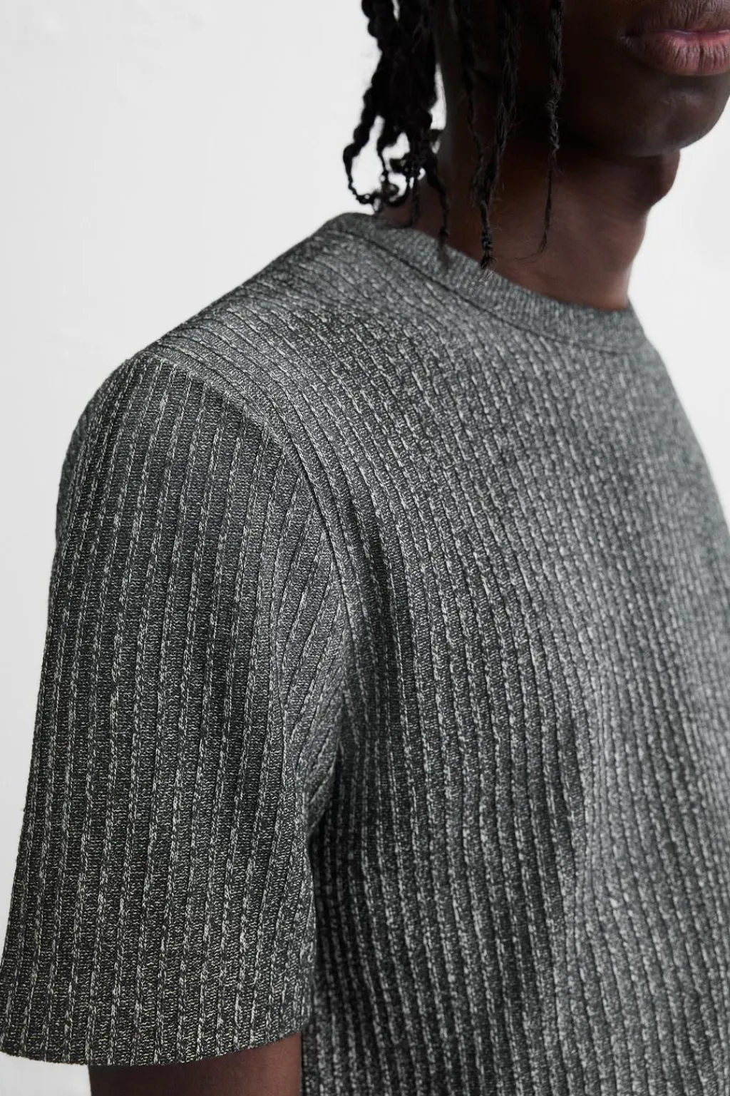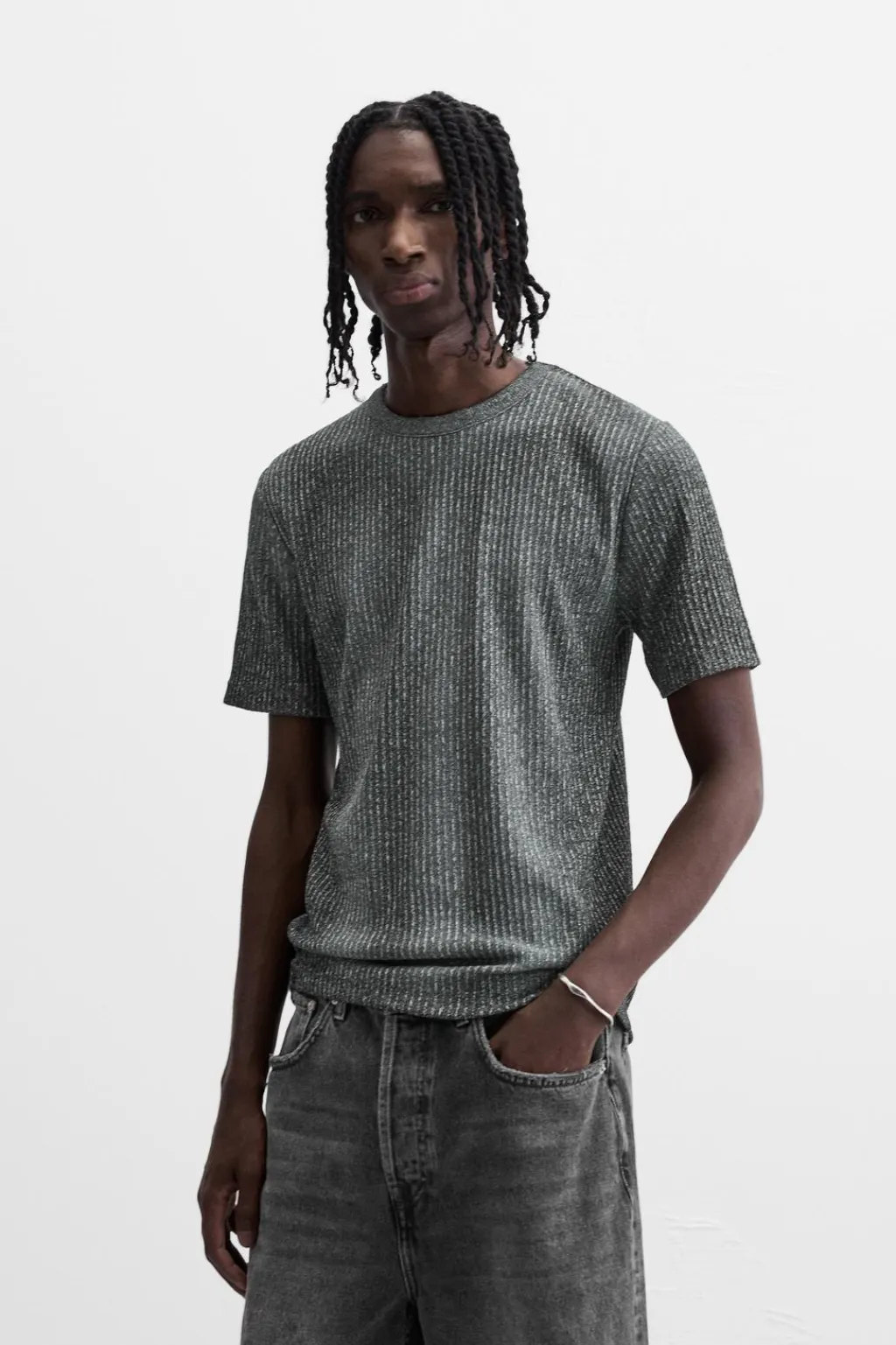 Camiseta relaxed fit de punto tejida en hilatura con mezcla de algodón. Cuello redondo y manga corta. Efecto lavado. Estampación efecto spray en toda la prenda.