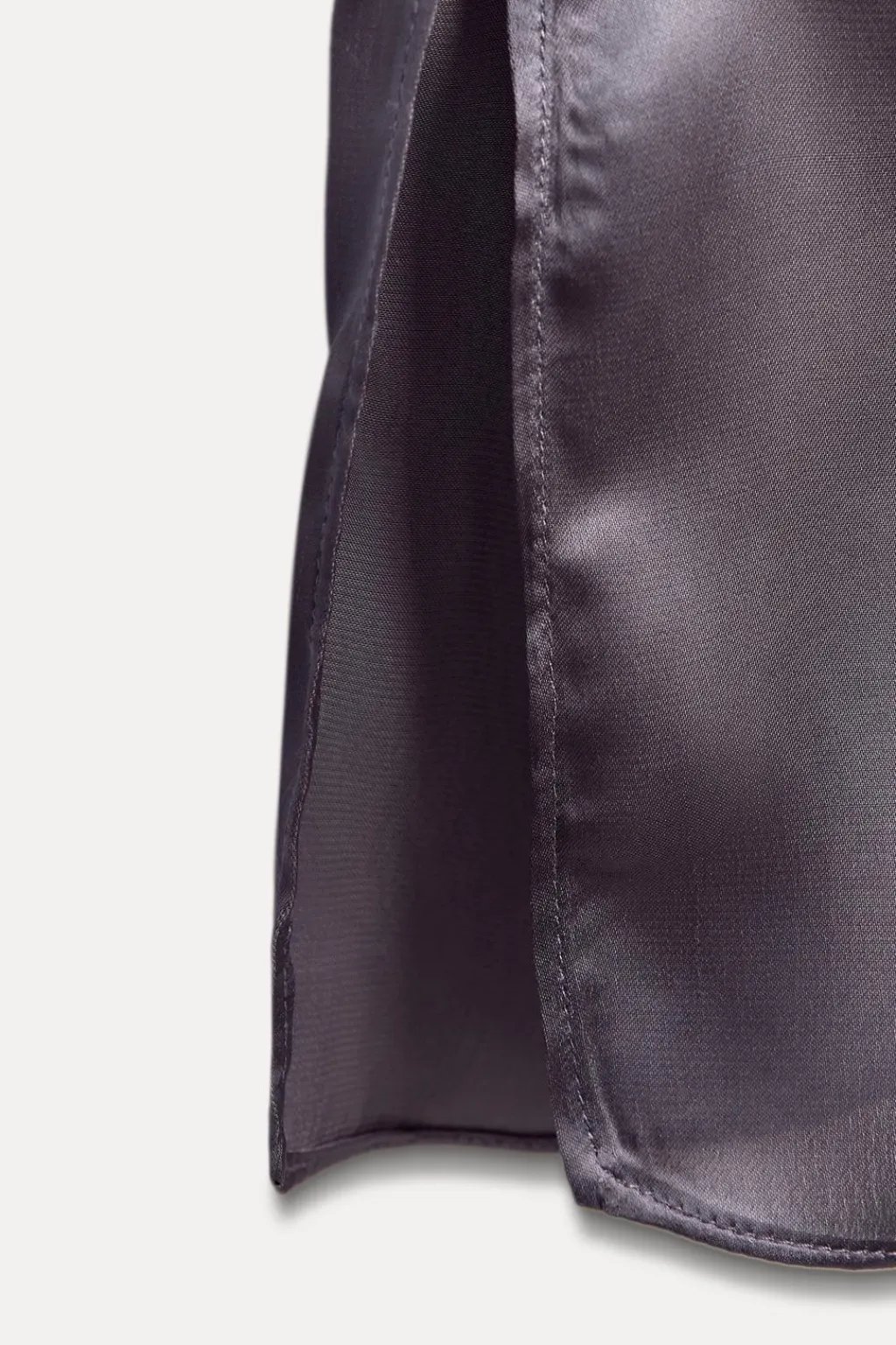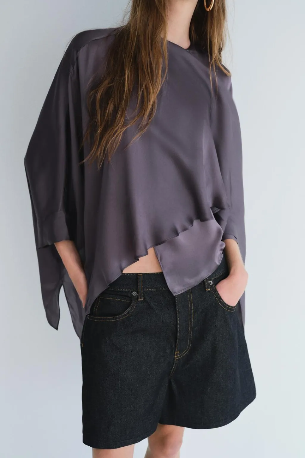 Capa fluida confeccionada en hilatura con viscosa. Cuello redondo y manga por debajo del codo. Bajo asimétrico.