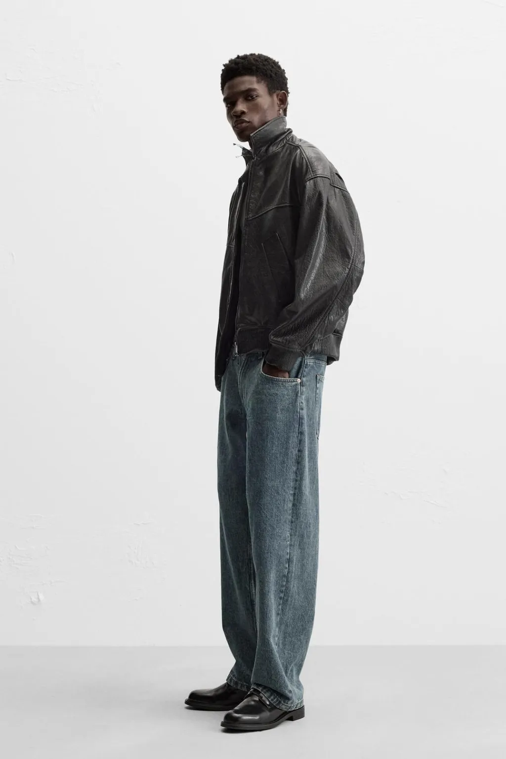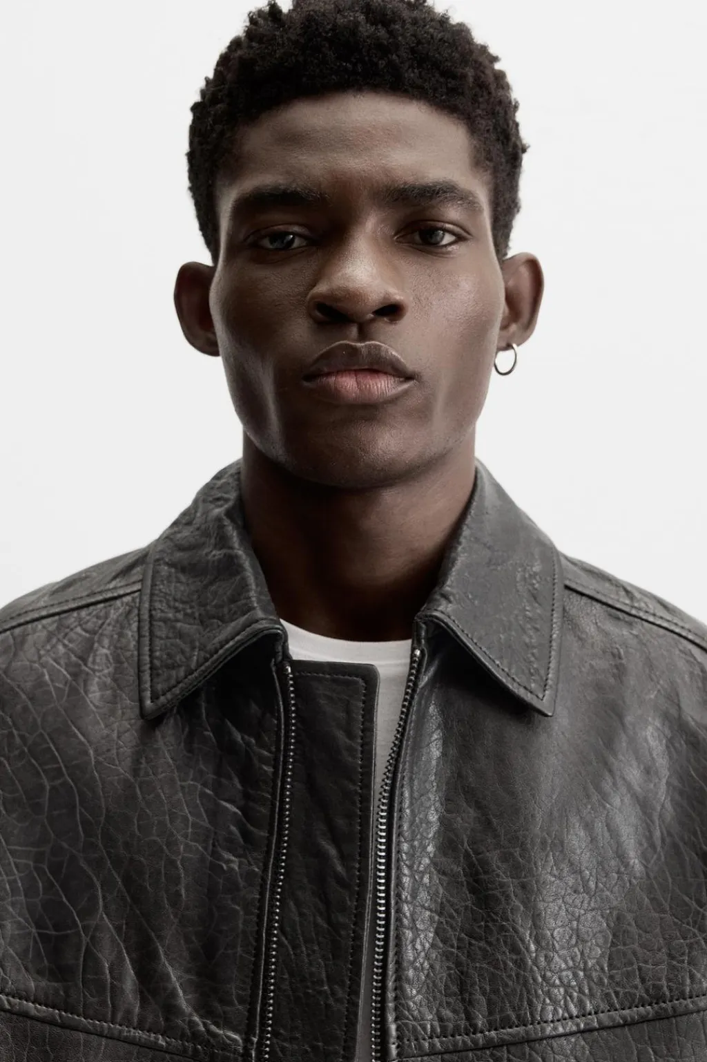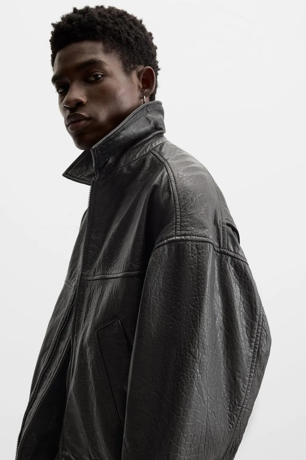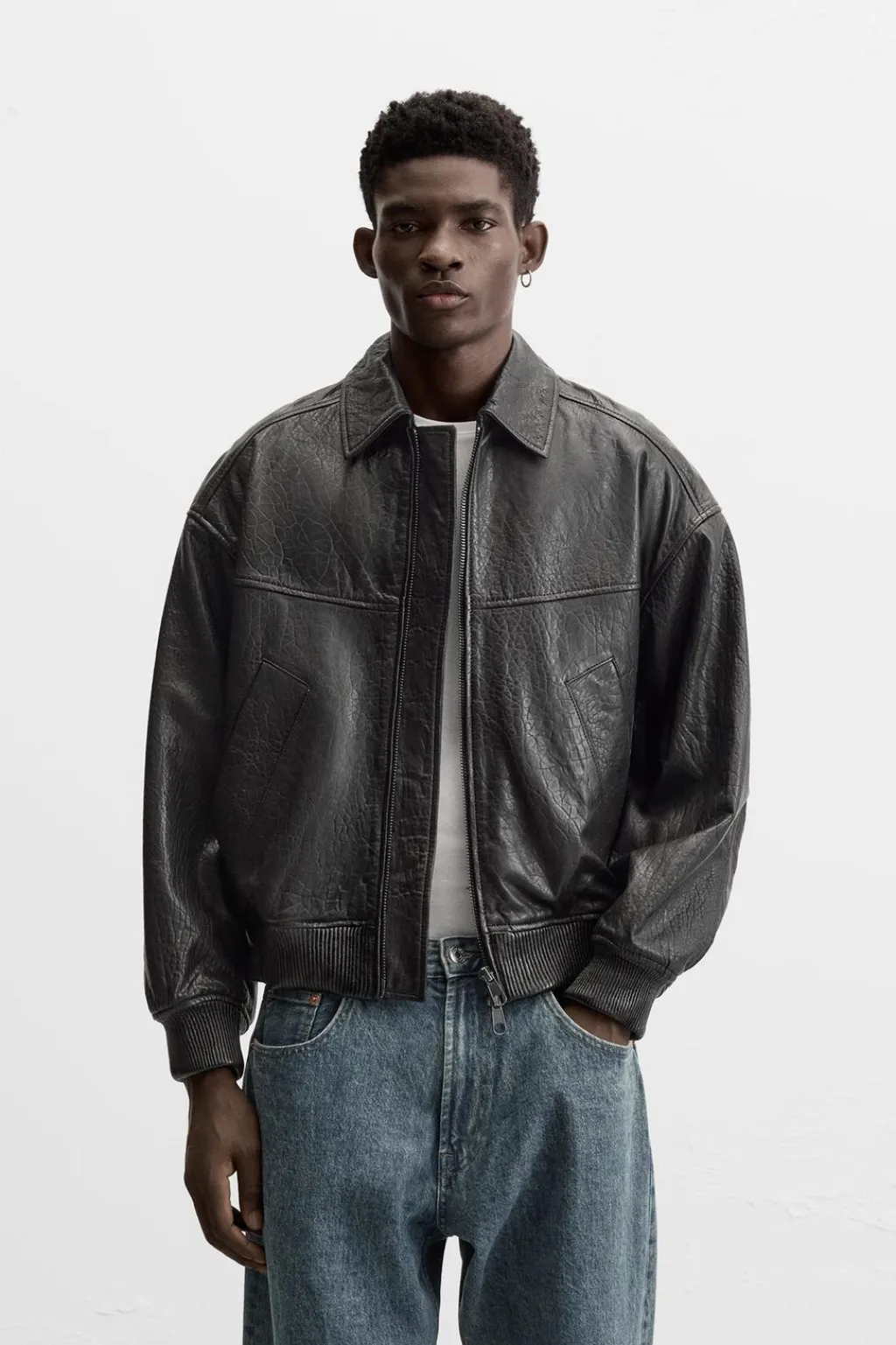 Cazadora relaxed fit confeccionada en piel con relieve irregular. Cuello solapa y manga larga. Bolsillos de vivo en cadera y detalle de bolsillo interior. Acabados en rib de piel. Cierre frontal de cremallera.