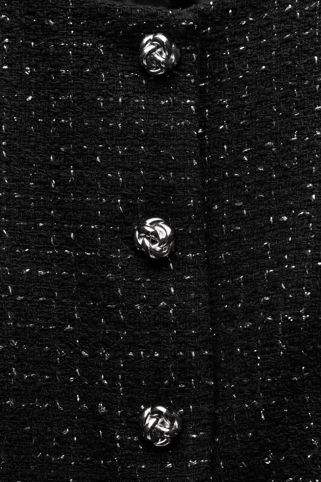 Chaleco de cuello redondo y manga sisa. Detalle de tejido con hilo metalizado. Cierre frontal con botones dorados con relieve.