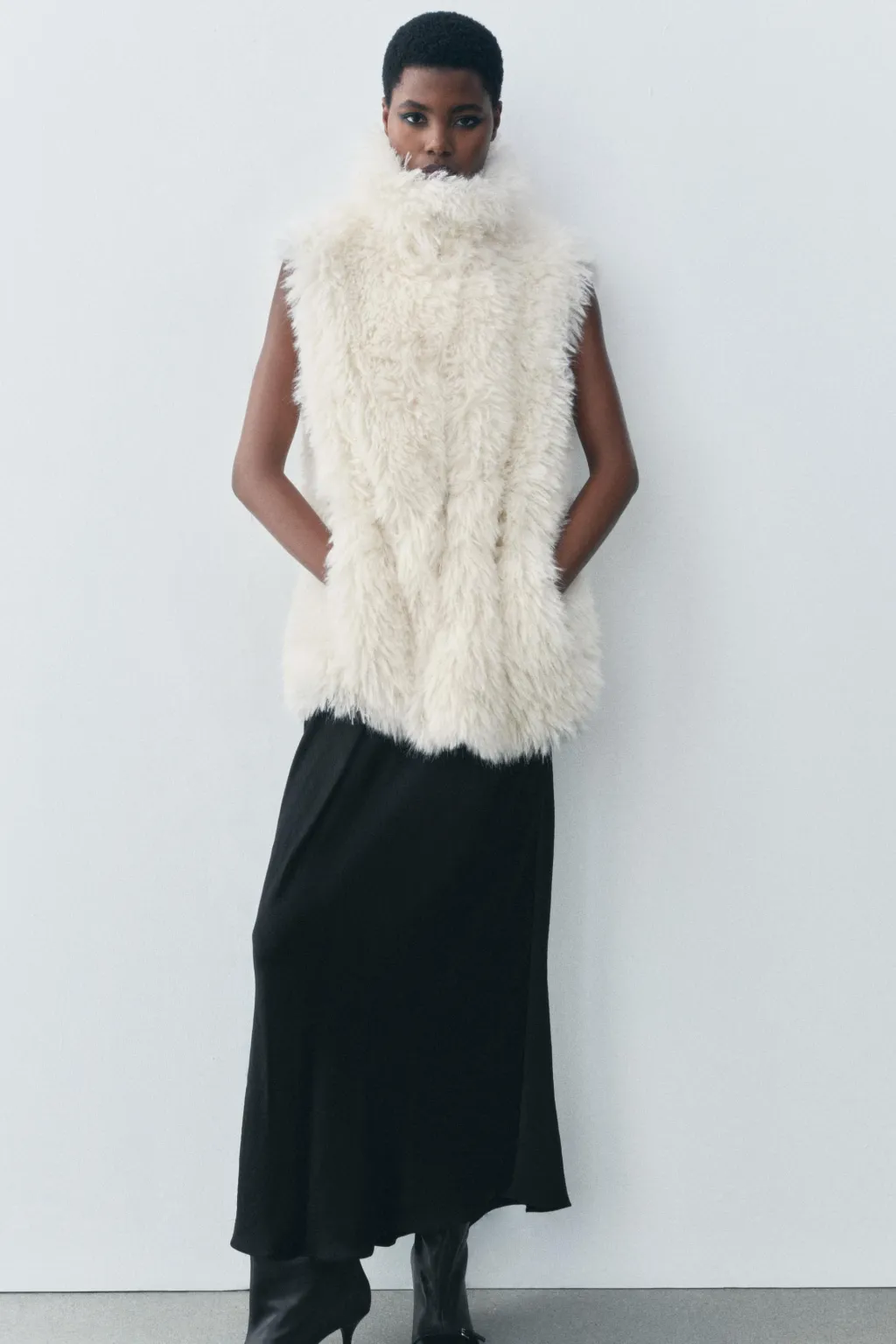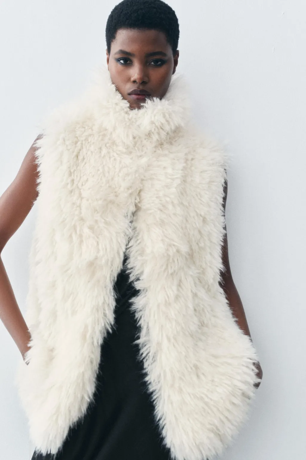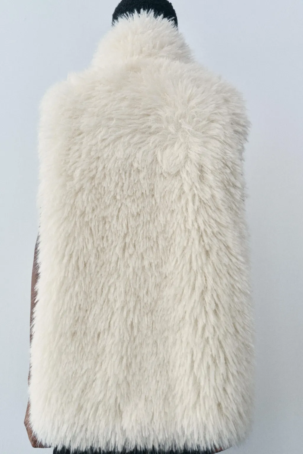 Chaleco de cuello alto y manga sisa. Bolsillos en delantero. Detalle de aplicación efecto pelo. Forro interior a tono.