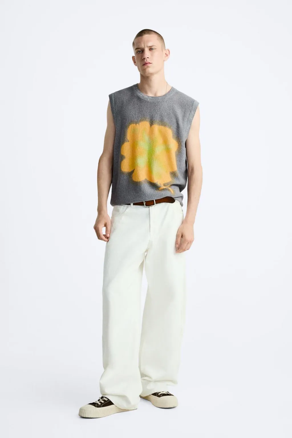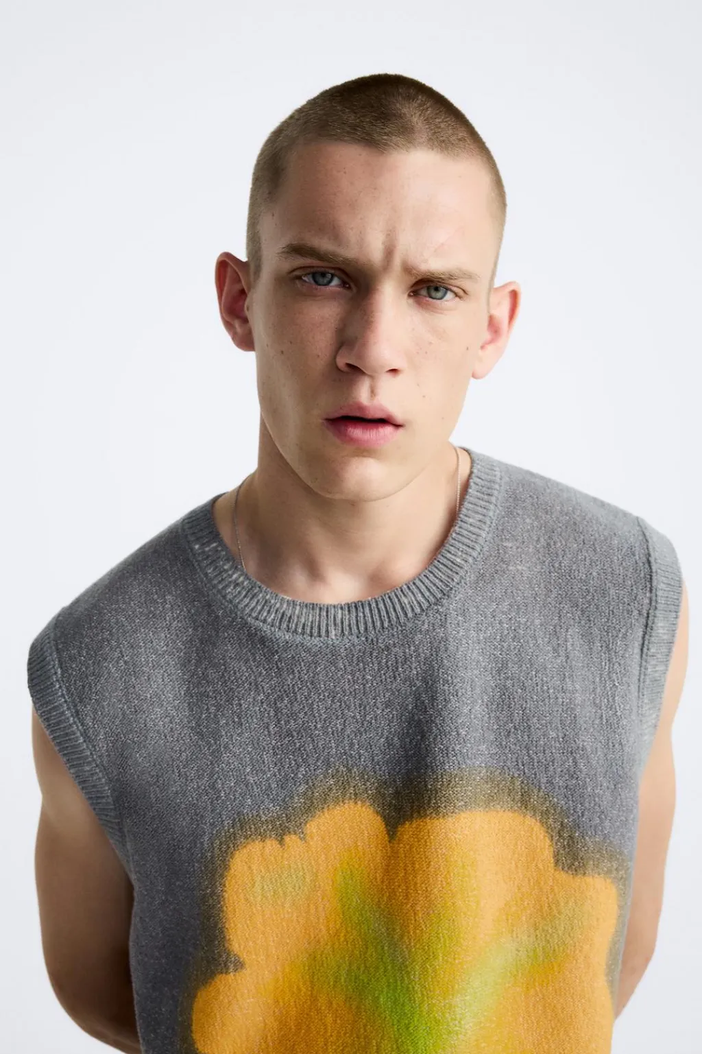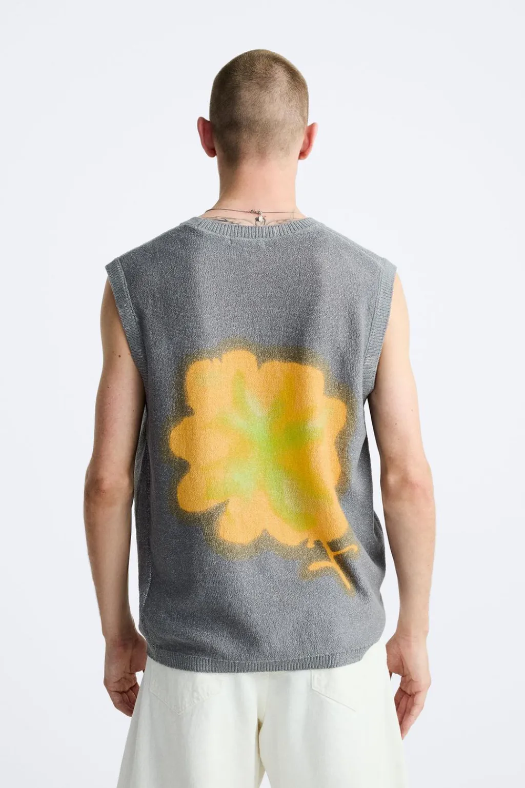 Chaleco relaxed fit tejido en hilatura con mezcla de algodón. Cuello redondo y manga sisa. Estampación efecto spray combinada a contraste en delantero y espalda. Acabados en rib.