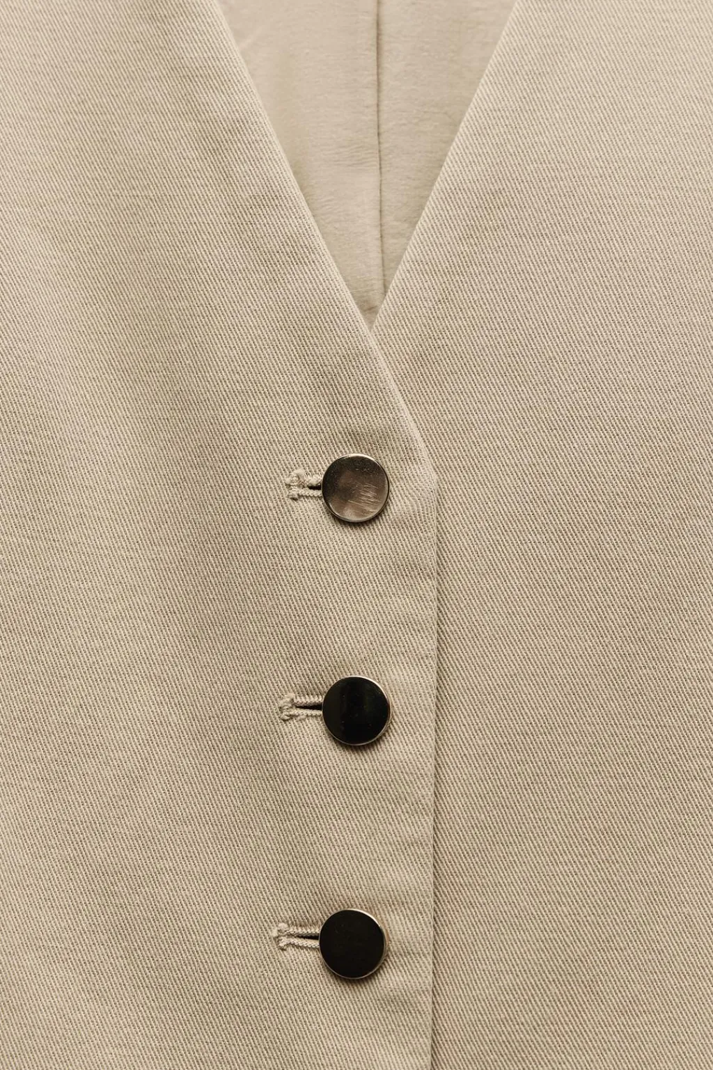 Chaleco de escote pico y manga sisa. Forro interior combinado a tono. Cierre frontal con botones metálicos