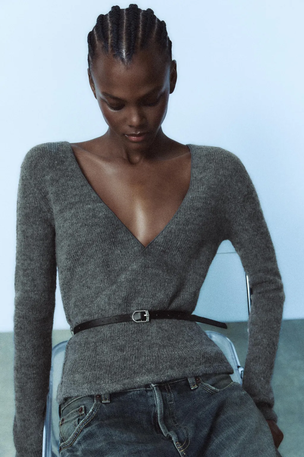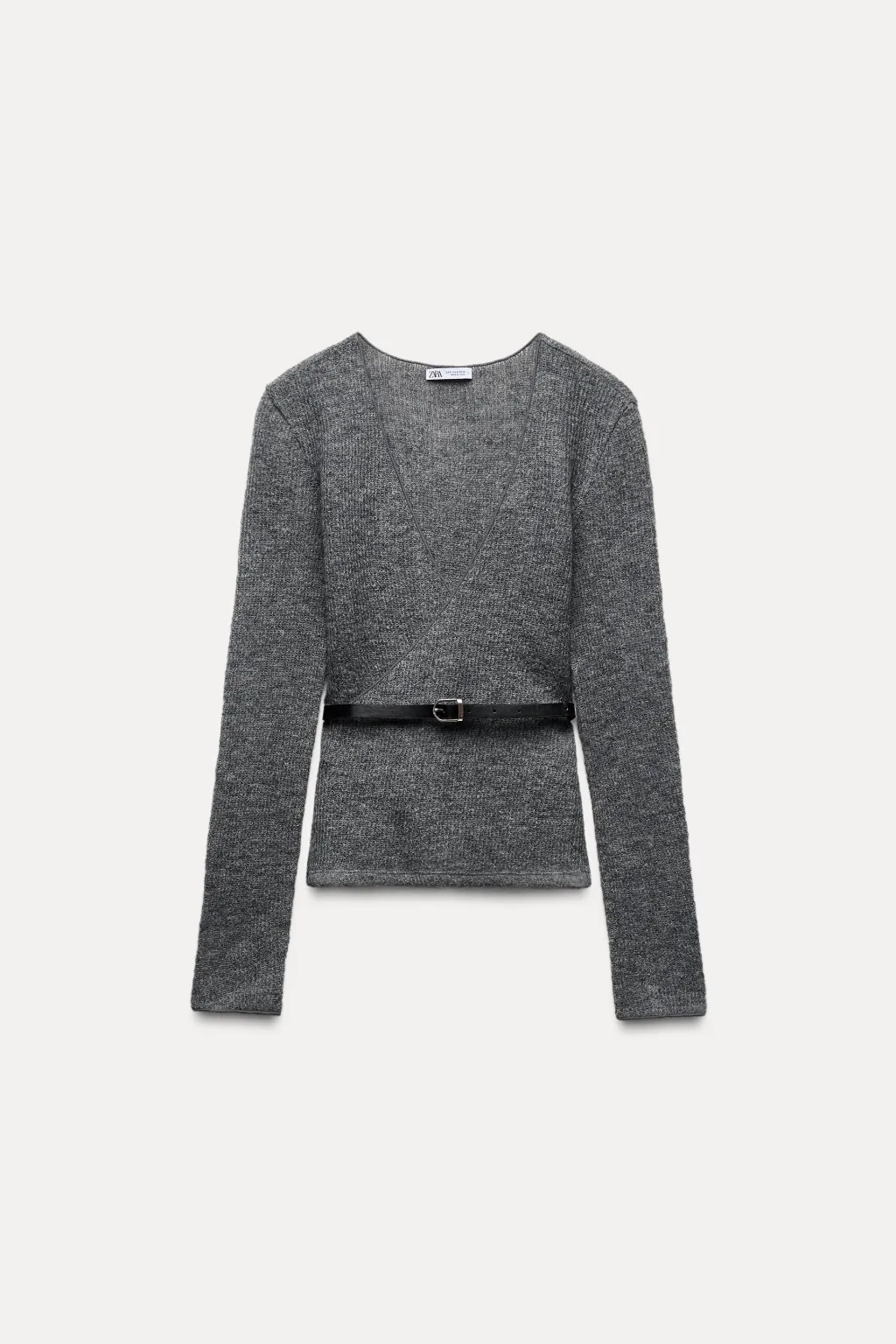 Chaqueta confeccionado con 10% de lana. Escote pico cruzado y manga larga. Cinturón con hebilla metálica combinado a contraste.