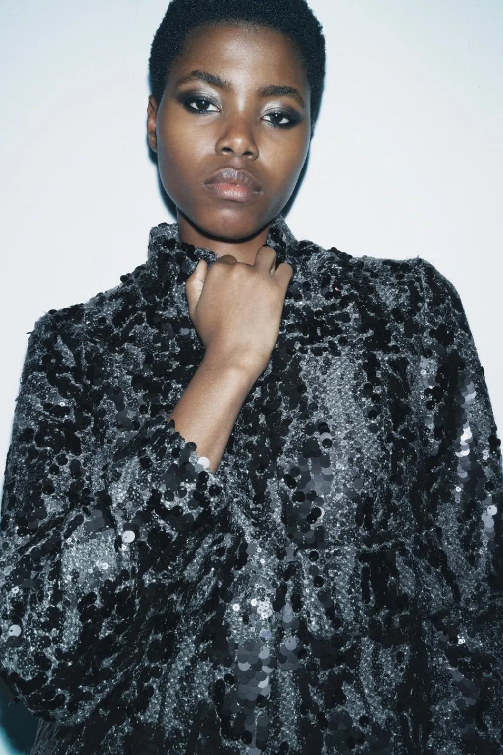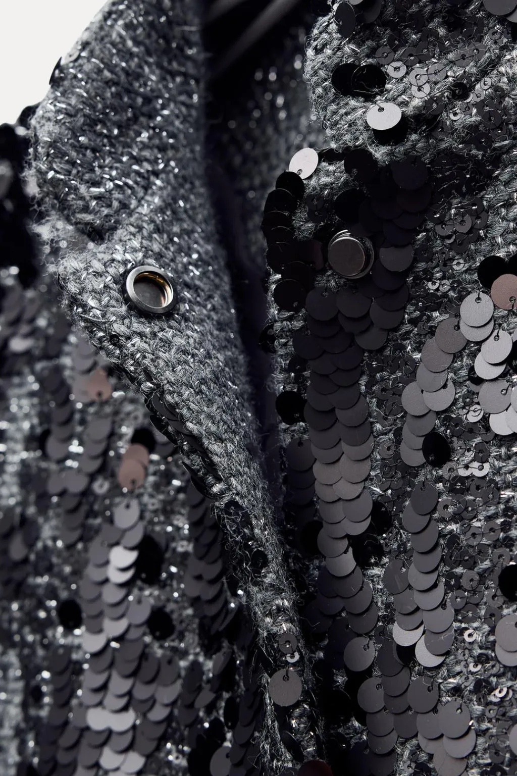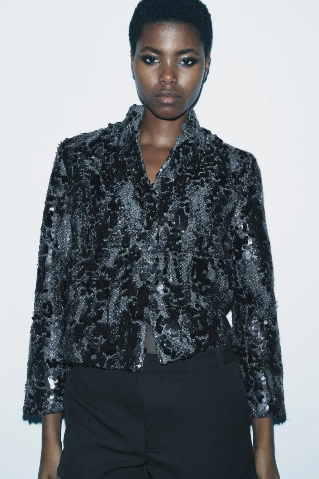 Chaqueta de cuello perkins y manga larga. Bolsillos con solapa en delantero. Detalle de aplicación de lentejuelas. Forro interior. Cierre frontal con cremallera oculta por solapa.
