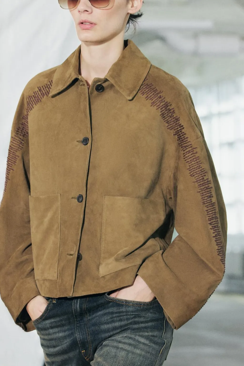Chaqueta realizada en piel 100%. Cuello solapa y manga larga acabada en línea evasé. Bolsillos de plastrón en delantero. Detalle de bordados a contraste. Forro interior. Cierre frontal con botones.