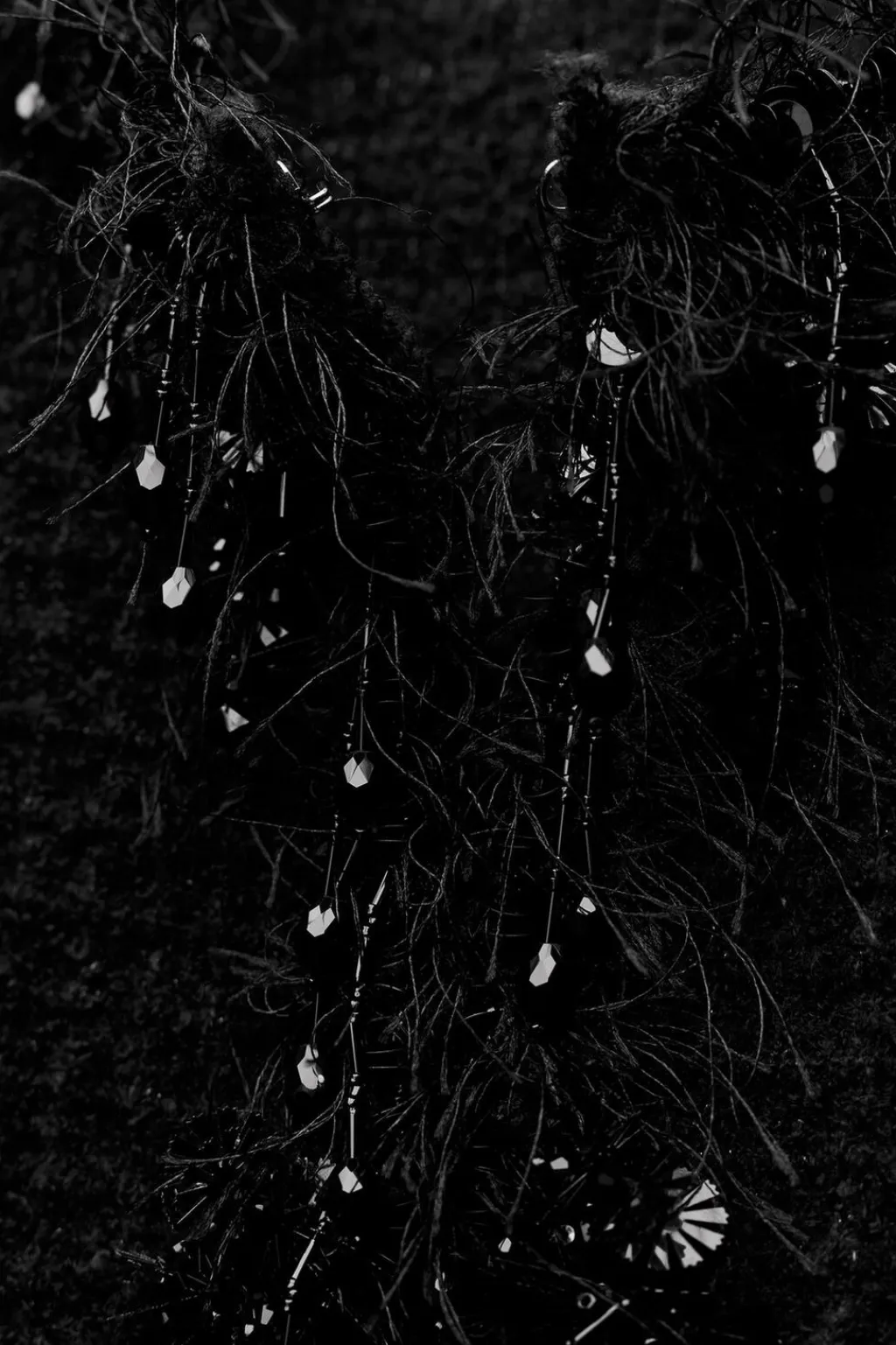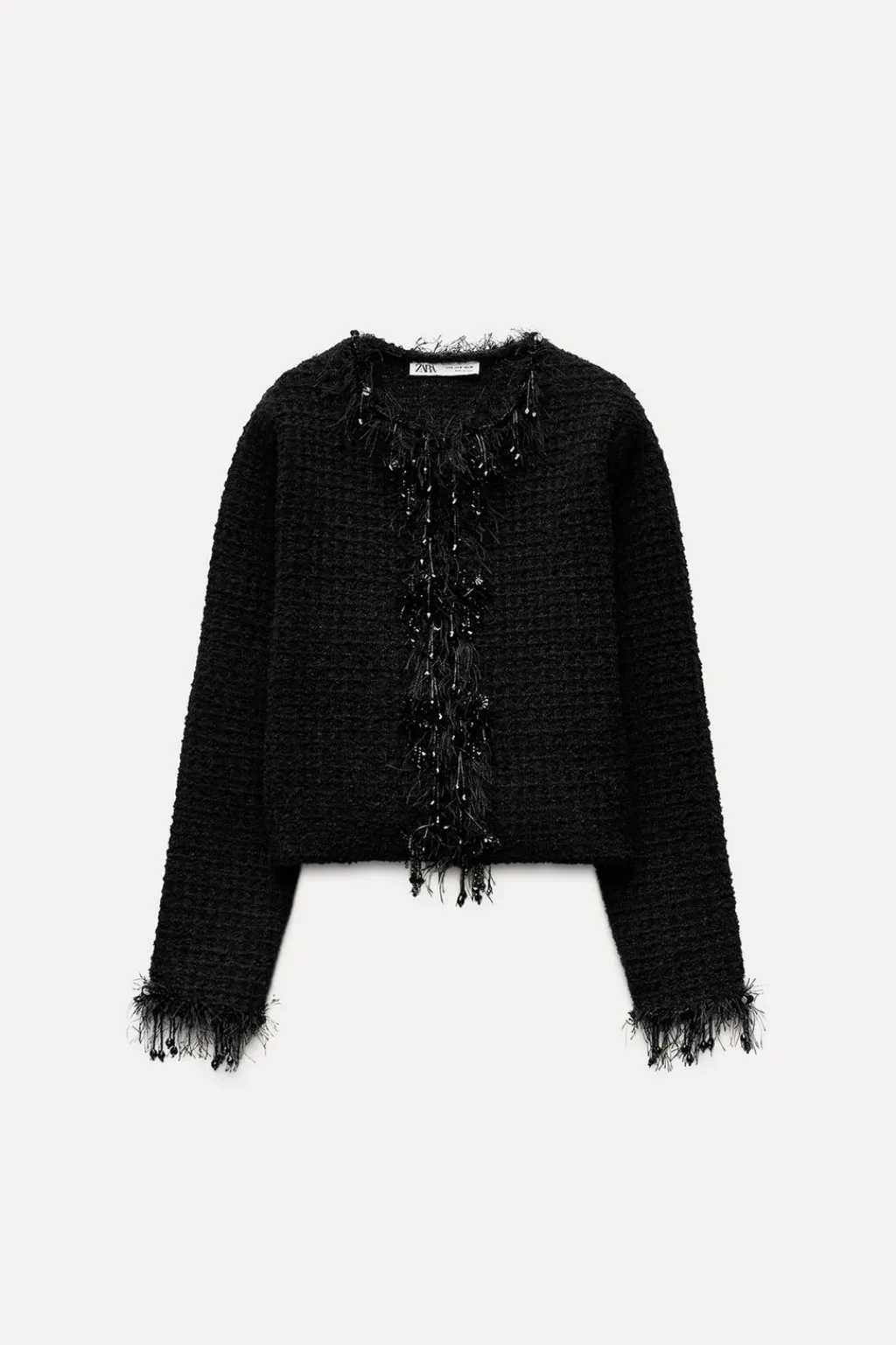 Chaqueta de punto con tejido en estructura. Cuello redondo y manga larga. Detalle de acabados desflecados con aplicación de flecos y abalorios. Cierre frontal con corchetes ocultos.