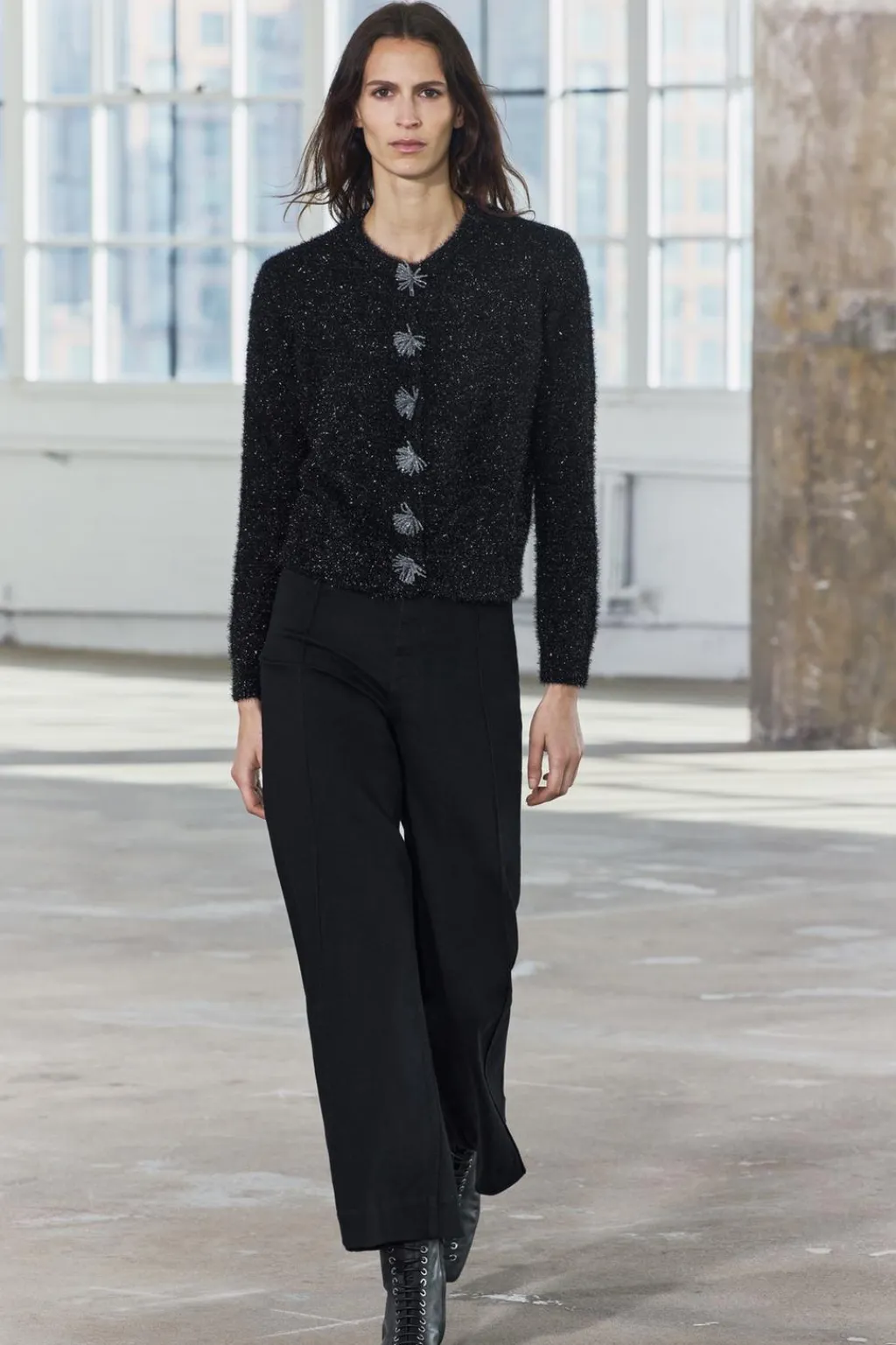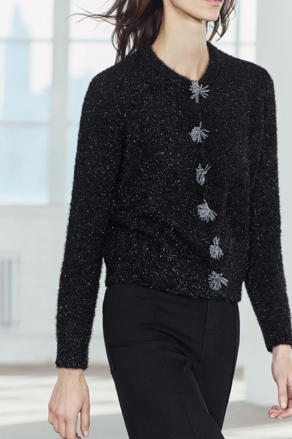 Chaqueta de cuello redondo y manga larga. Detalle de tejido con hilo metalizado. Cierre frontal con botones a presión con abalorios.