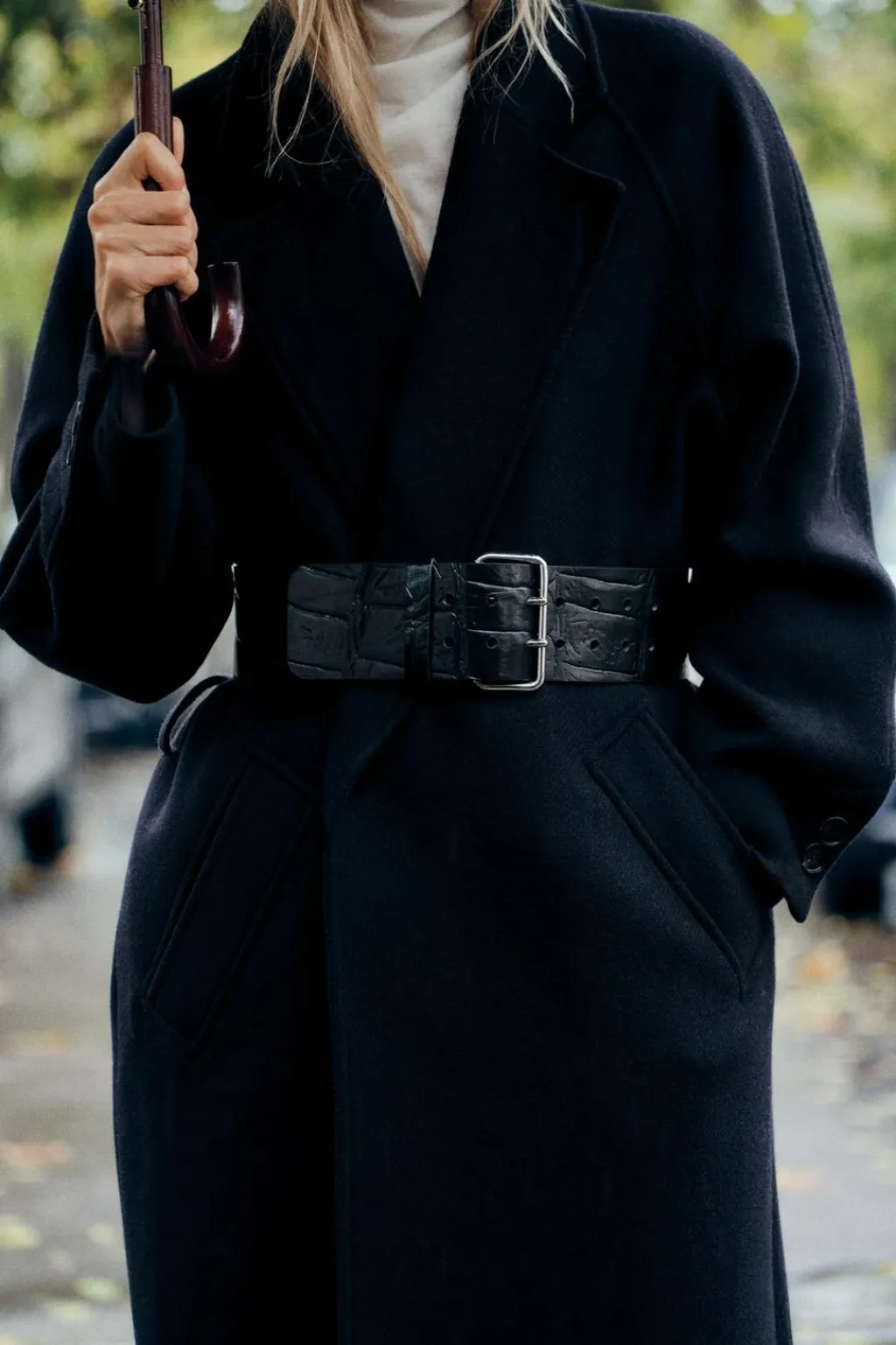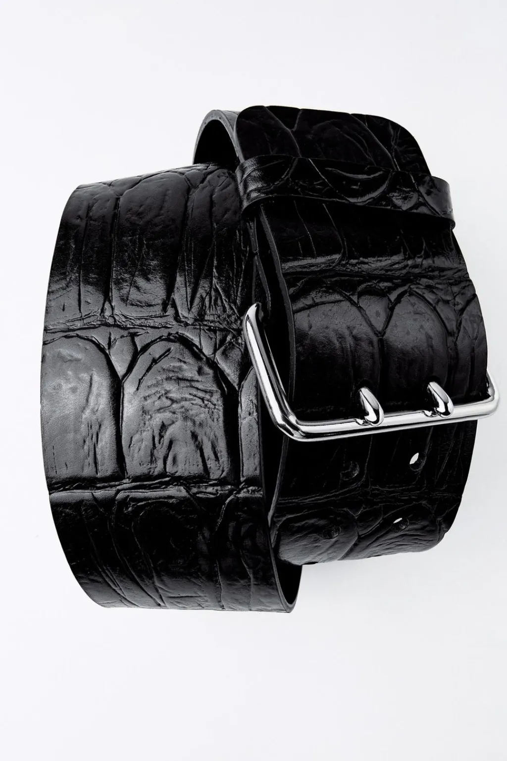 Cinturón de 7 cm de ancho realizado en piel grabado tipo cocodrilo. Hebilla metálica rectangular.