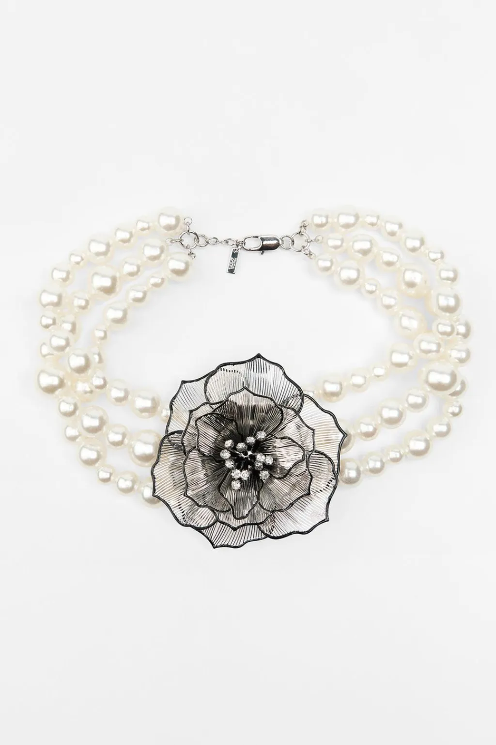 Collar de perlas en diferentes tamaños. Flor metálica en relieve con acabados esmaltados y aplicación de brillos. Cierre con mosquetón.