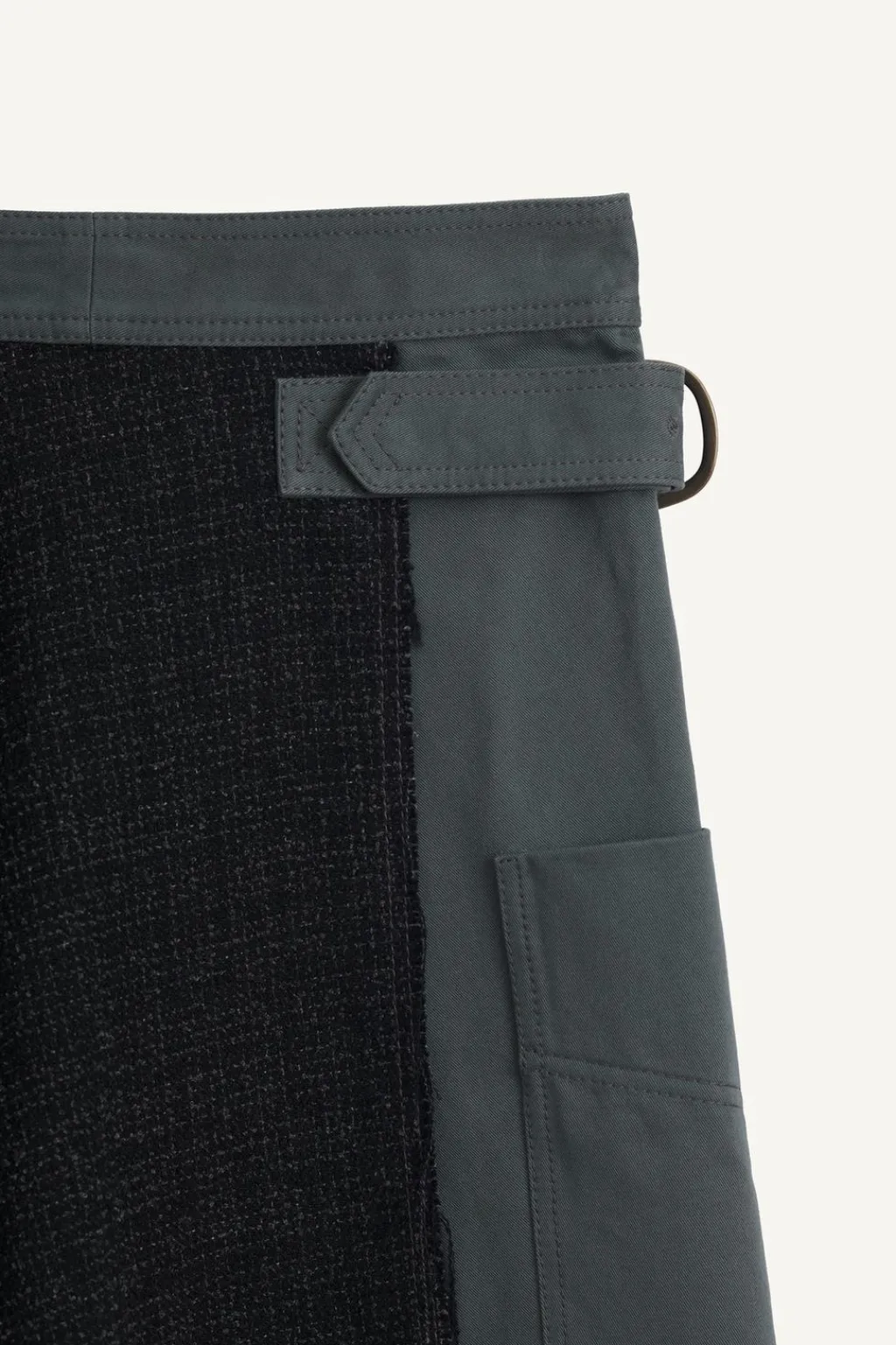 Falda corta de tiro medio confeccionada en tejidos combinados. Bolsillos en delantero. Bajo asimétrico acabado en línea evasé. Cierre frontal con botones y lateral con trabilla ajustable con hebilla metálica.