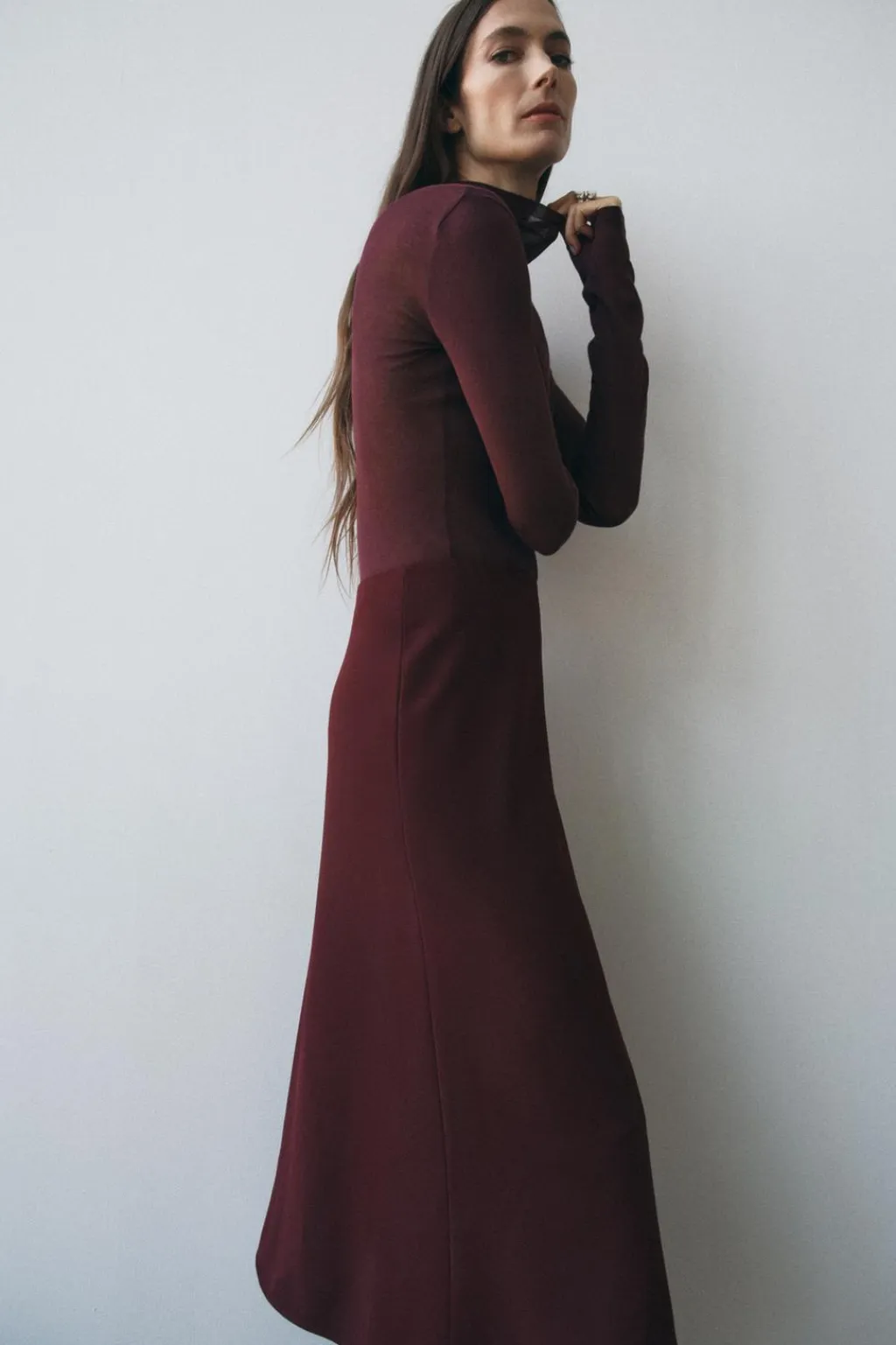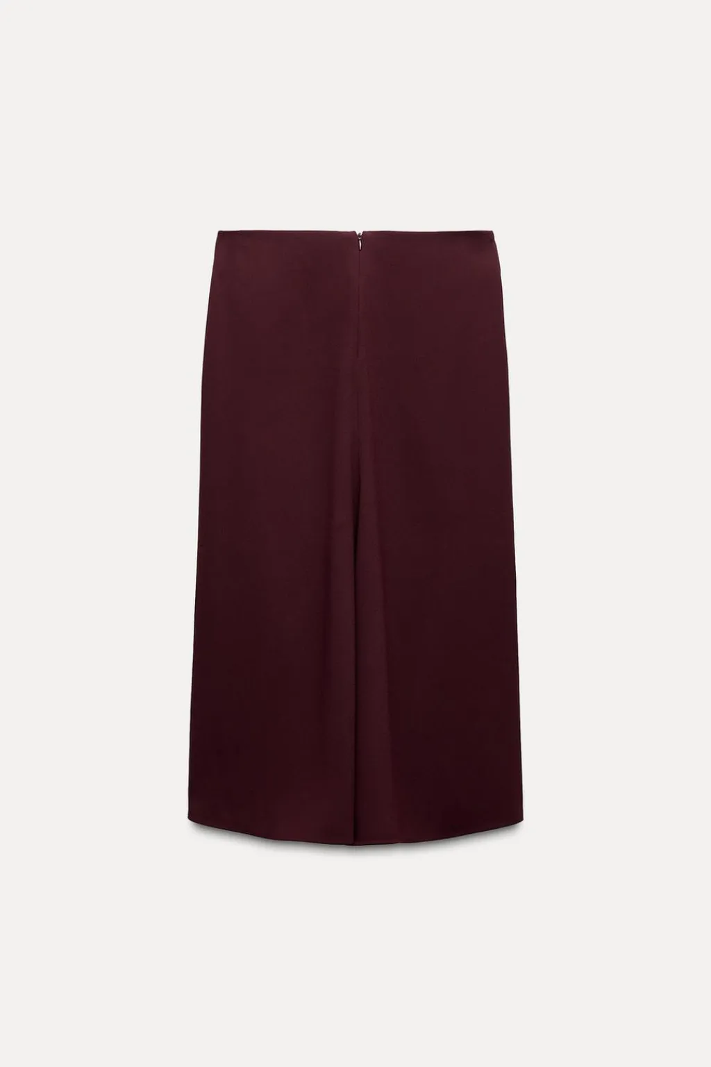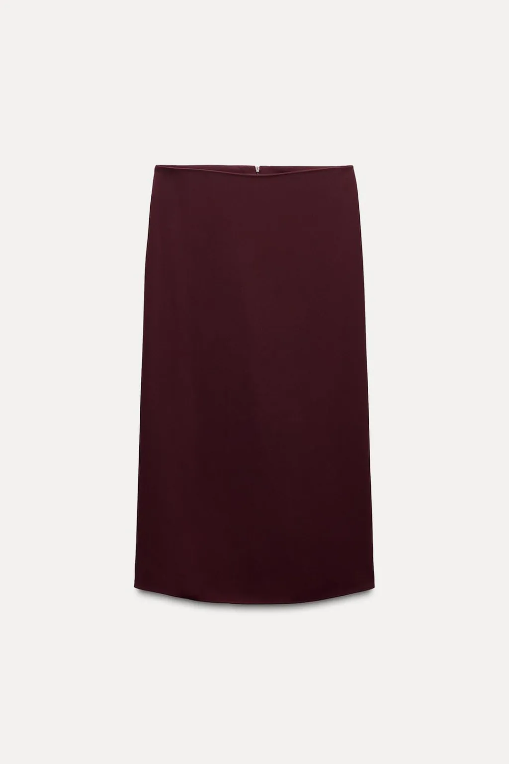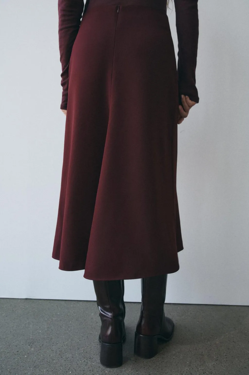 Falda midi de tiro medio. Bajo acabado con godet en espalda. Cierre con cremallera oculta en costura.
