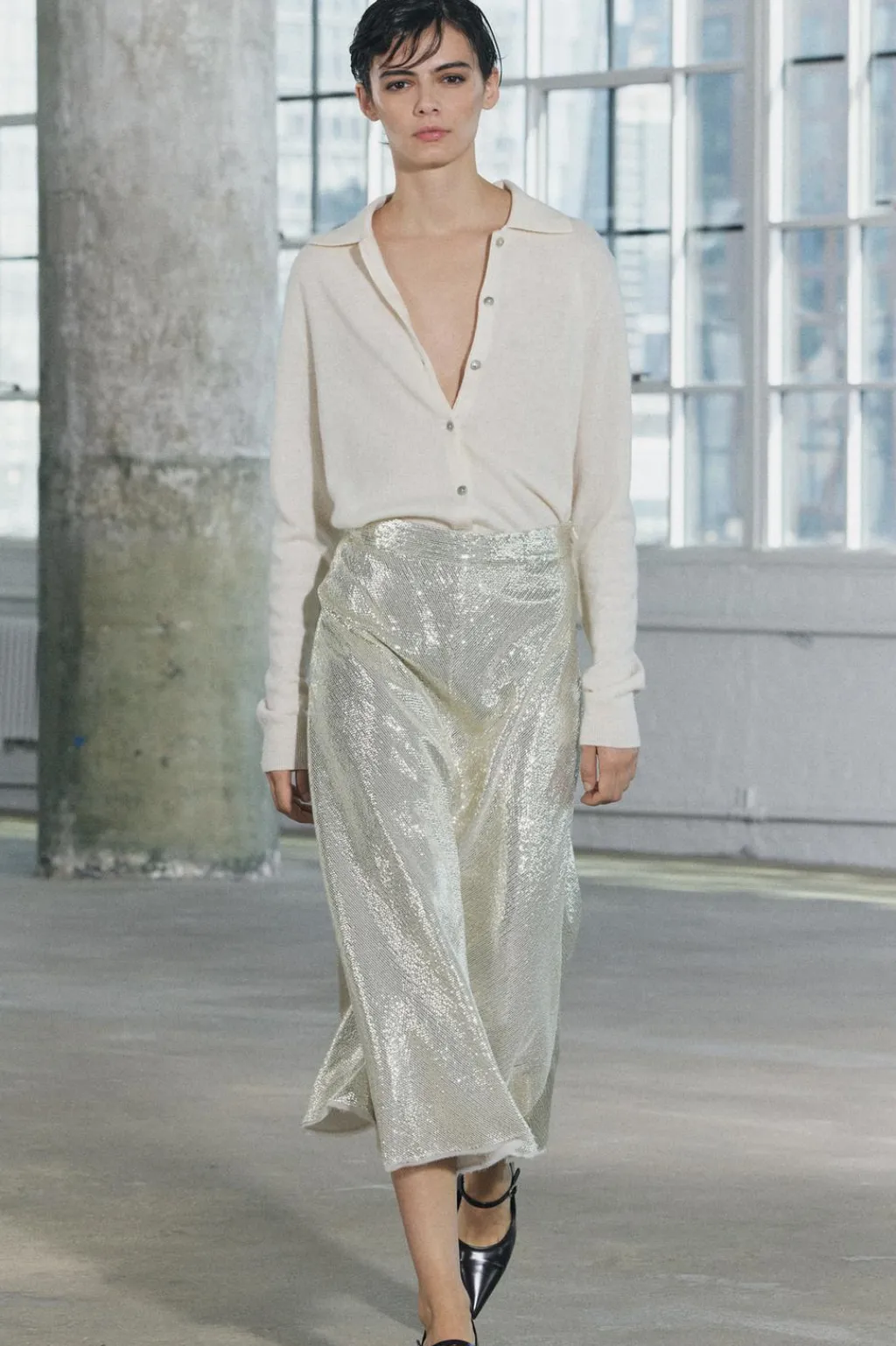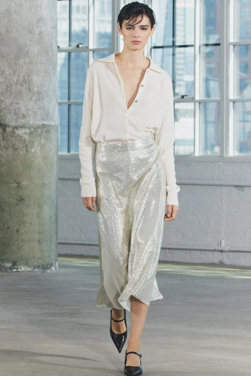 Falda midi de tiro medio medio. Detalle de aplicación de lentejuelas. Bajo acabado en línea evasé. Cierre con cremallera oculta en costura.