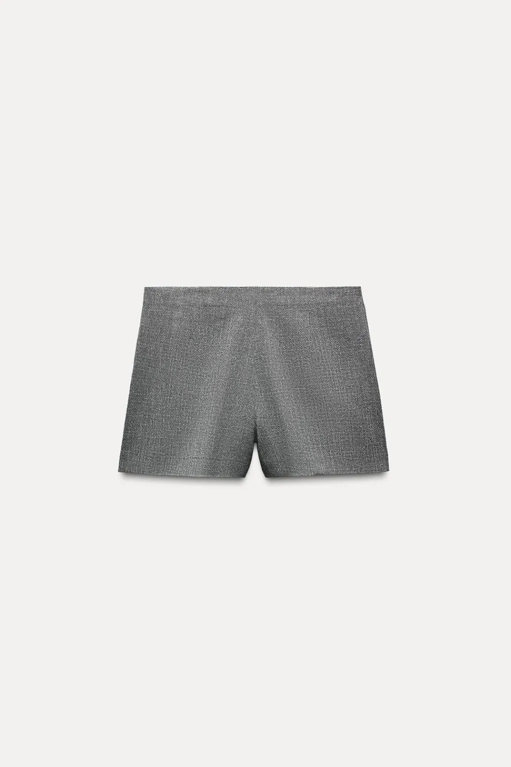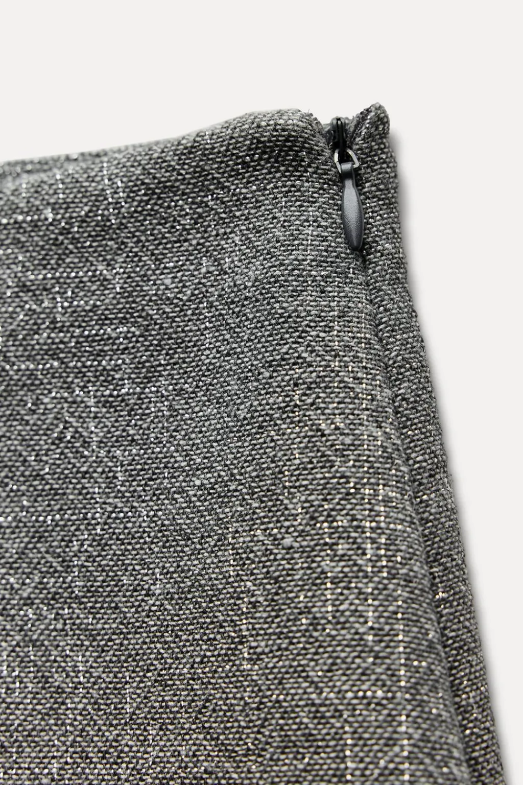 Falda de tiro alto y delantero cruzado con botón metálico con relieve. Detalle de tejido con hilo metalizado. Cierre lateral con cremallera oculta en costura.