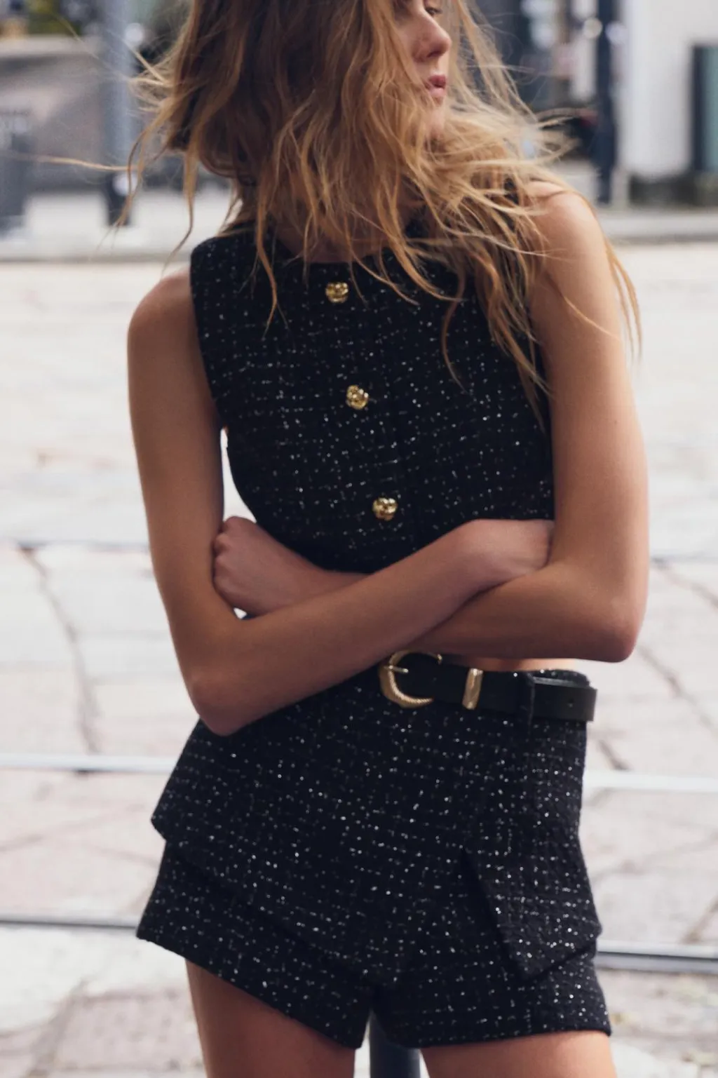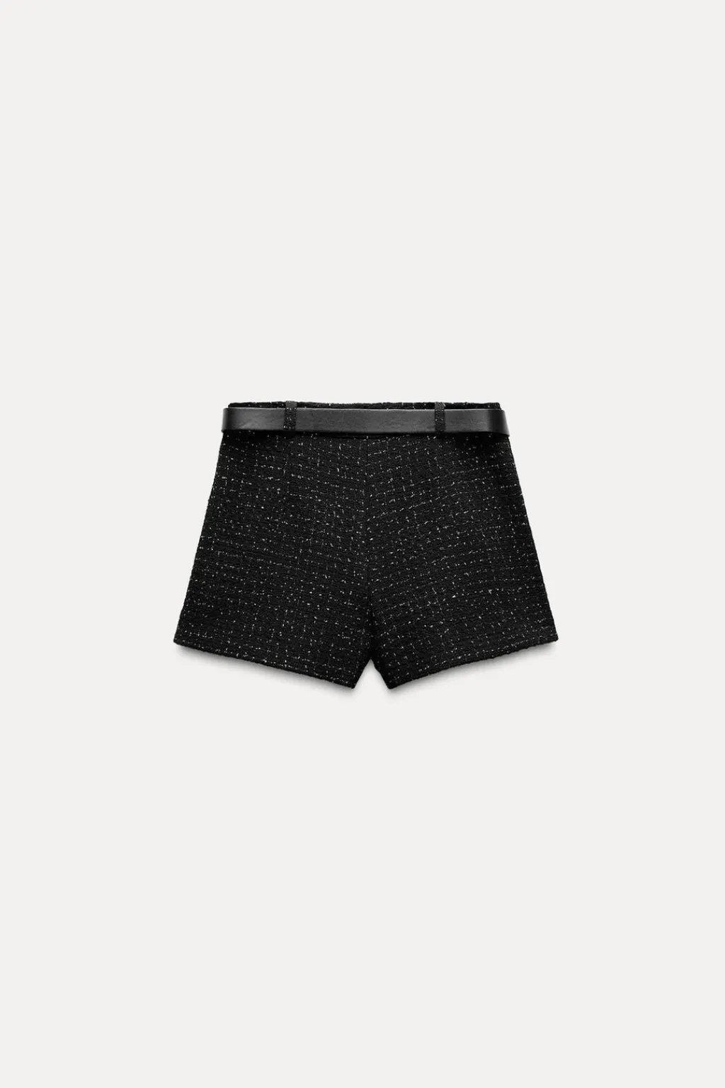 Falda pantalón de tiro alto con cinturón. Detalle de tejido con hilo metalizado. Cierre lateral con cremallera oculta en costura.