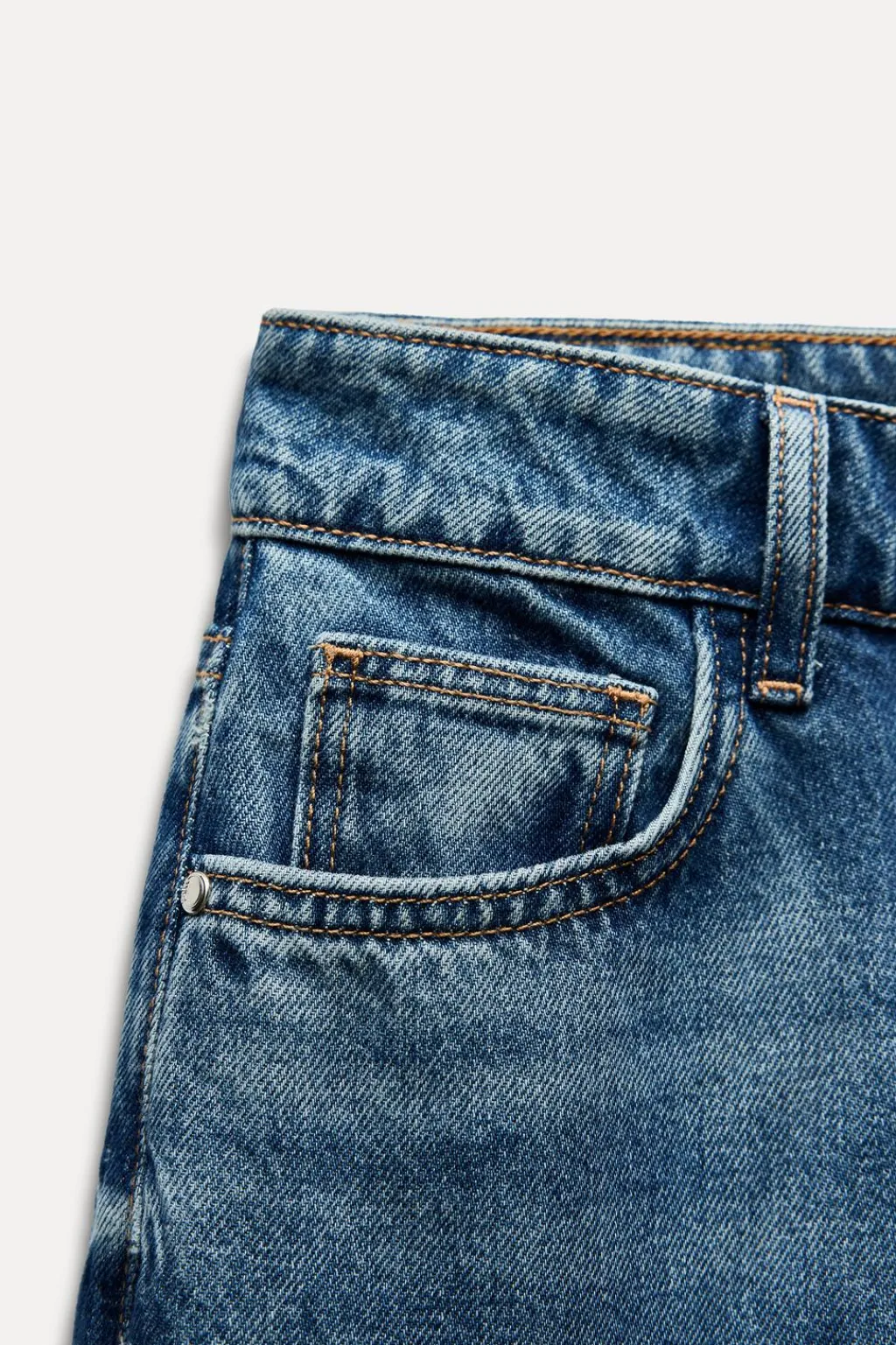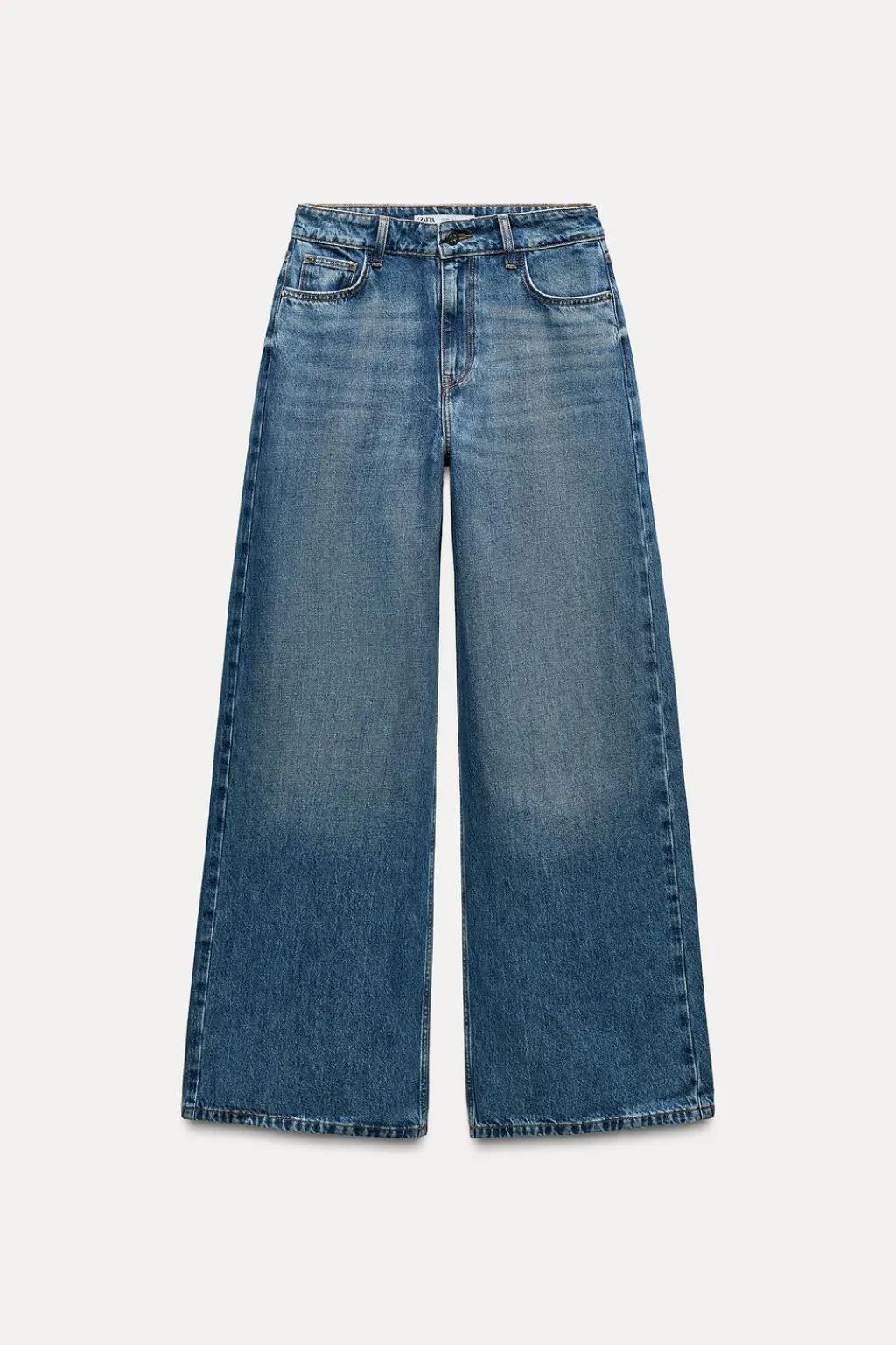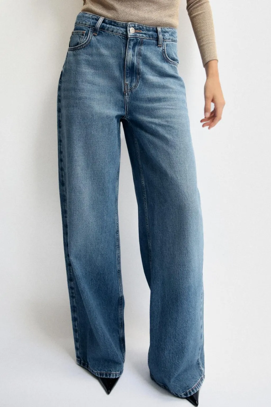 Jeans de tiro alto con cinco bolsillos. Efecto lavado. Pernera ancha. Cierre frontal con cremallera y botón.