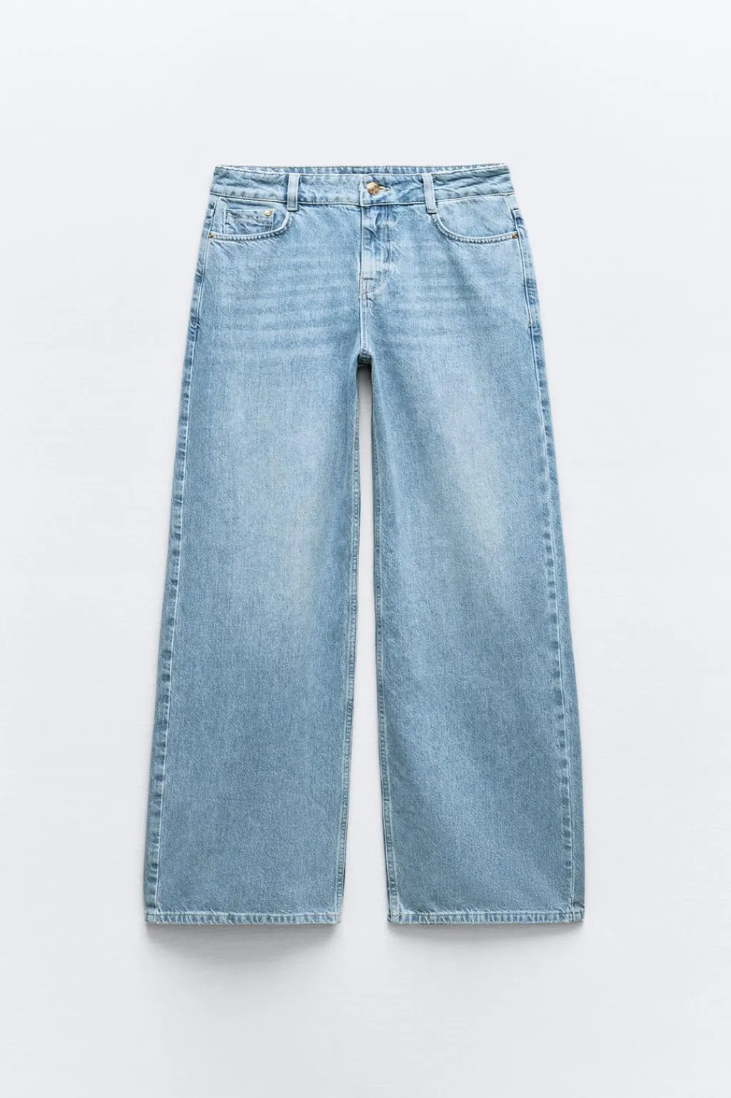 Jeans de tiro medio con cinco bolsillos. Pernera ancha y larga. Efecto lavado. Cierre frontal con cremallera y botón.
