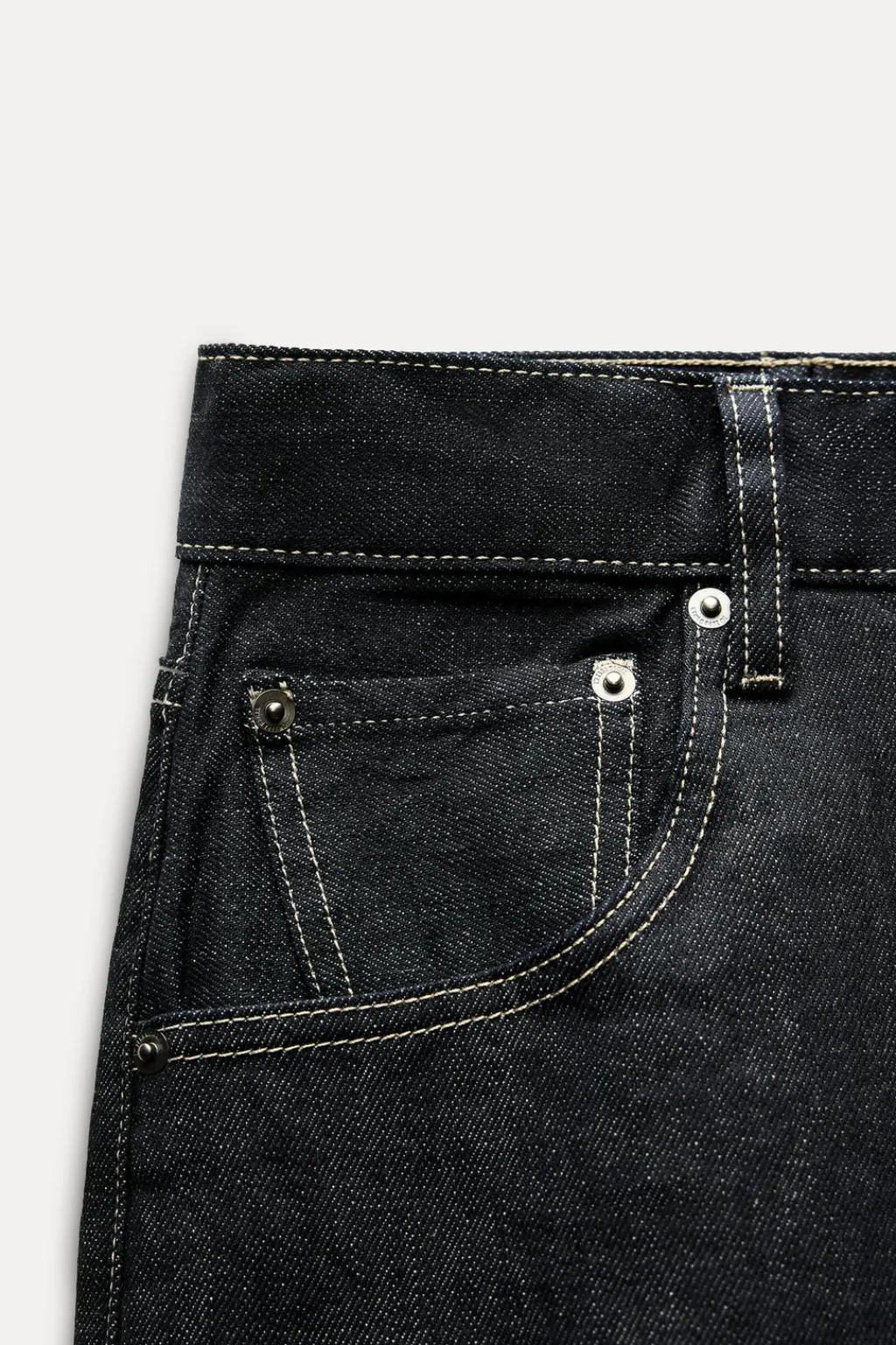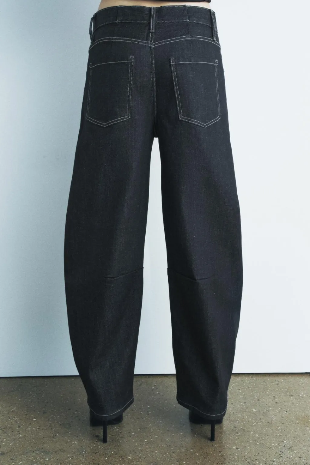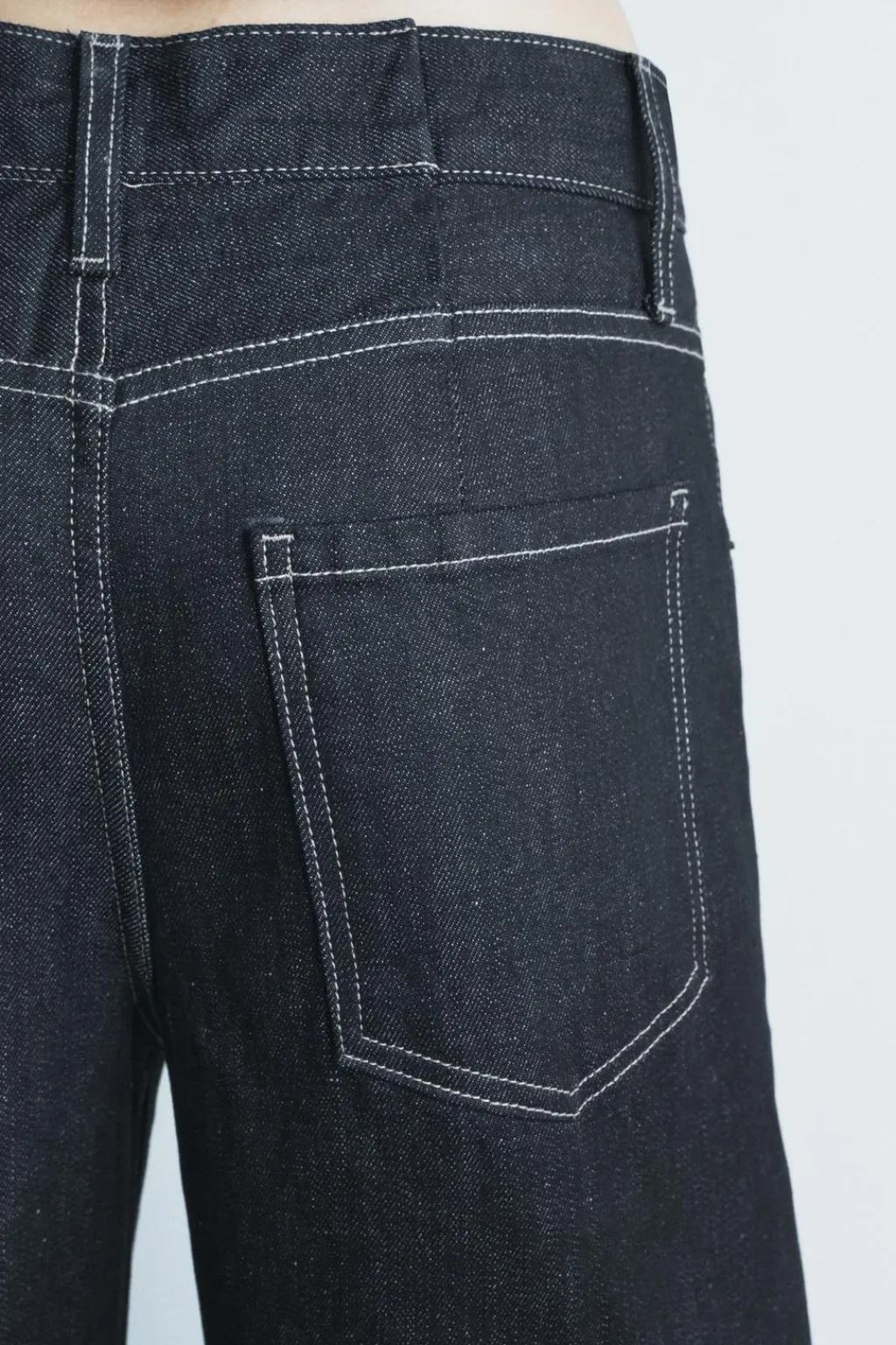 Jeans de tiro medio y cintura con trabillas. Cinco bolsillos. Detalle de pespuntes marcados a contraste. Pierna ancha. Cierre frontal con cremallera y botón.