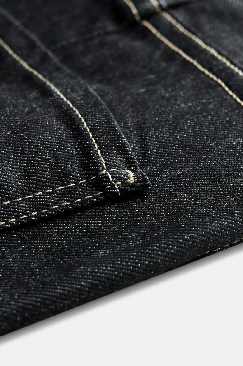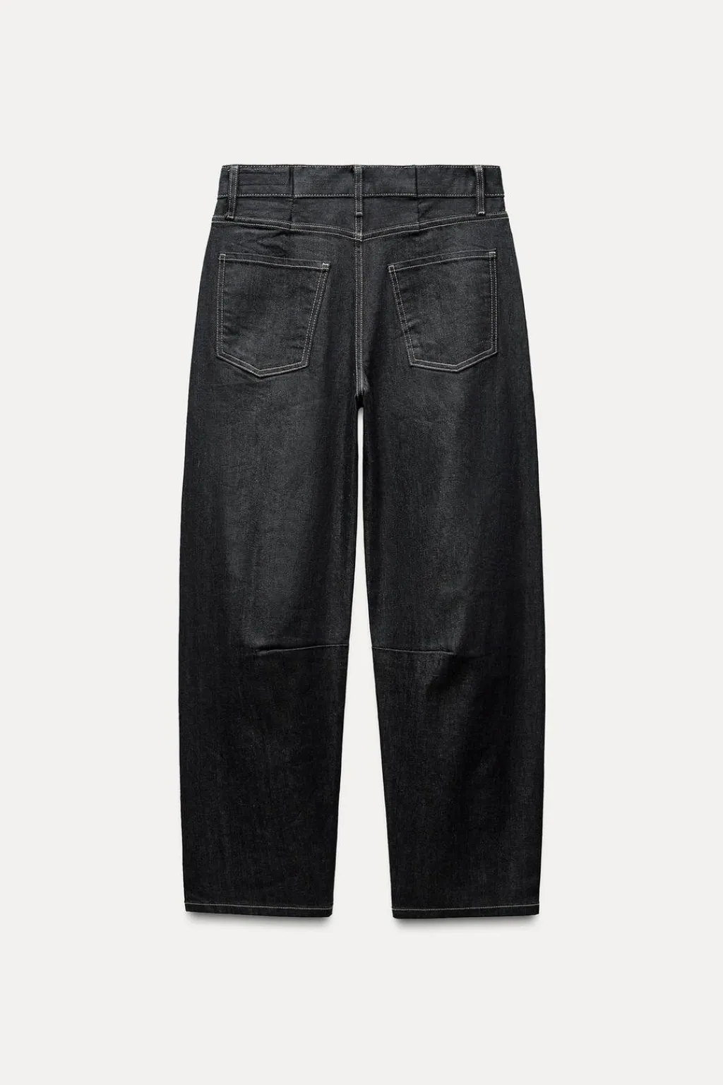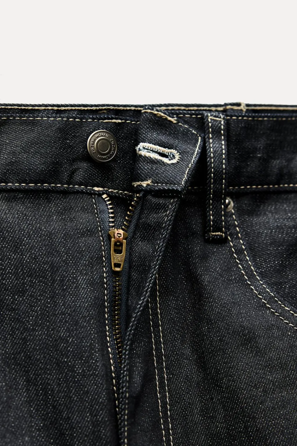 Jeans de tiro medio y cintura con trabillas. Cinco bolsillos. Detalle de pespuntes marcados a contraste. Pierna ancha. Cierre frontal con cremallera y botón.