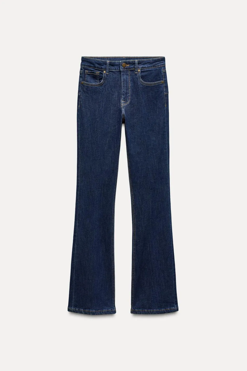 Jeans de tiro medio y cintura con trabillas. Cinco bolsillos. Bajo acabado en línea evasé. Cierre frontal con cremallera y botón.