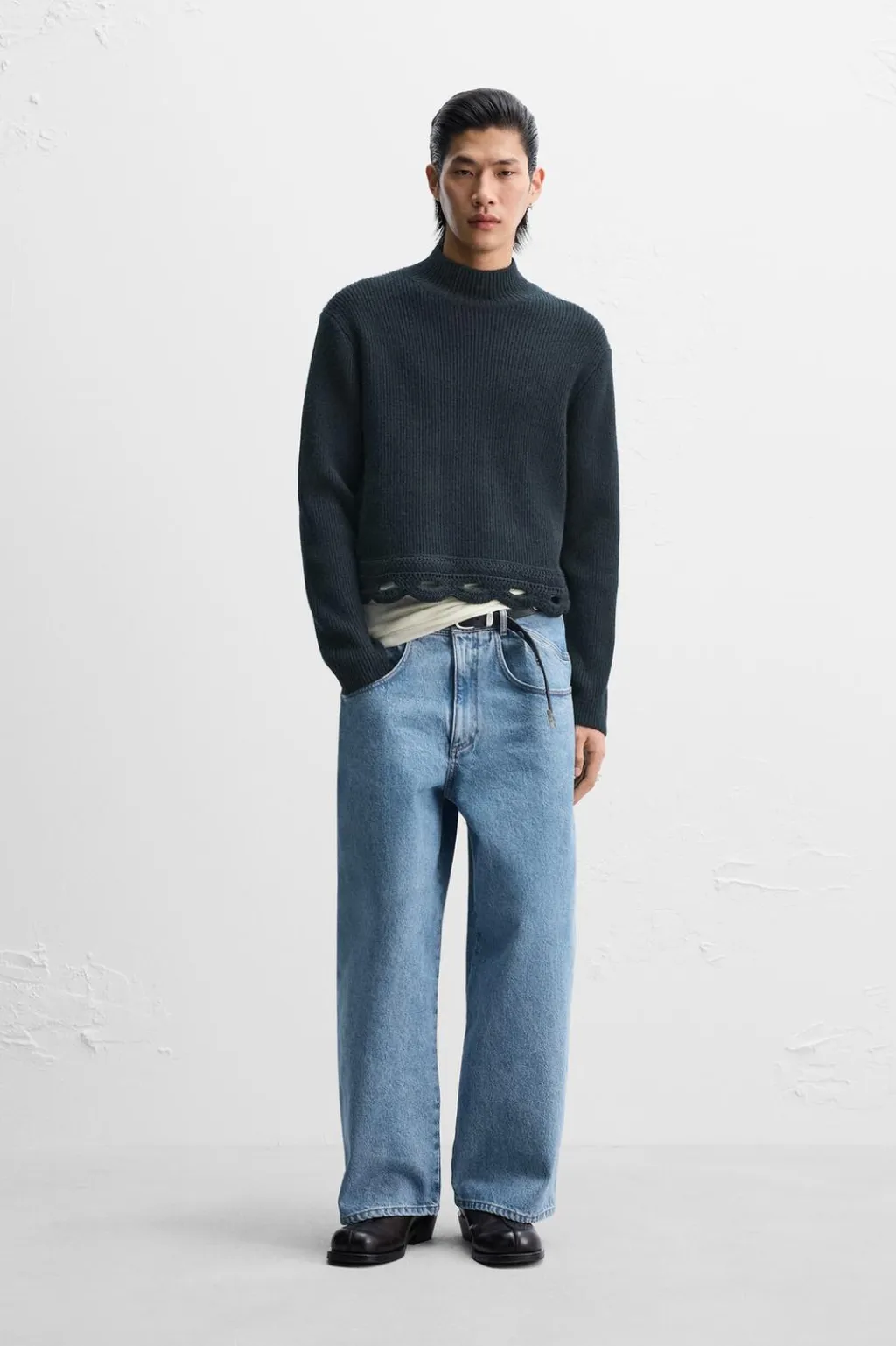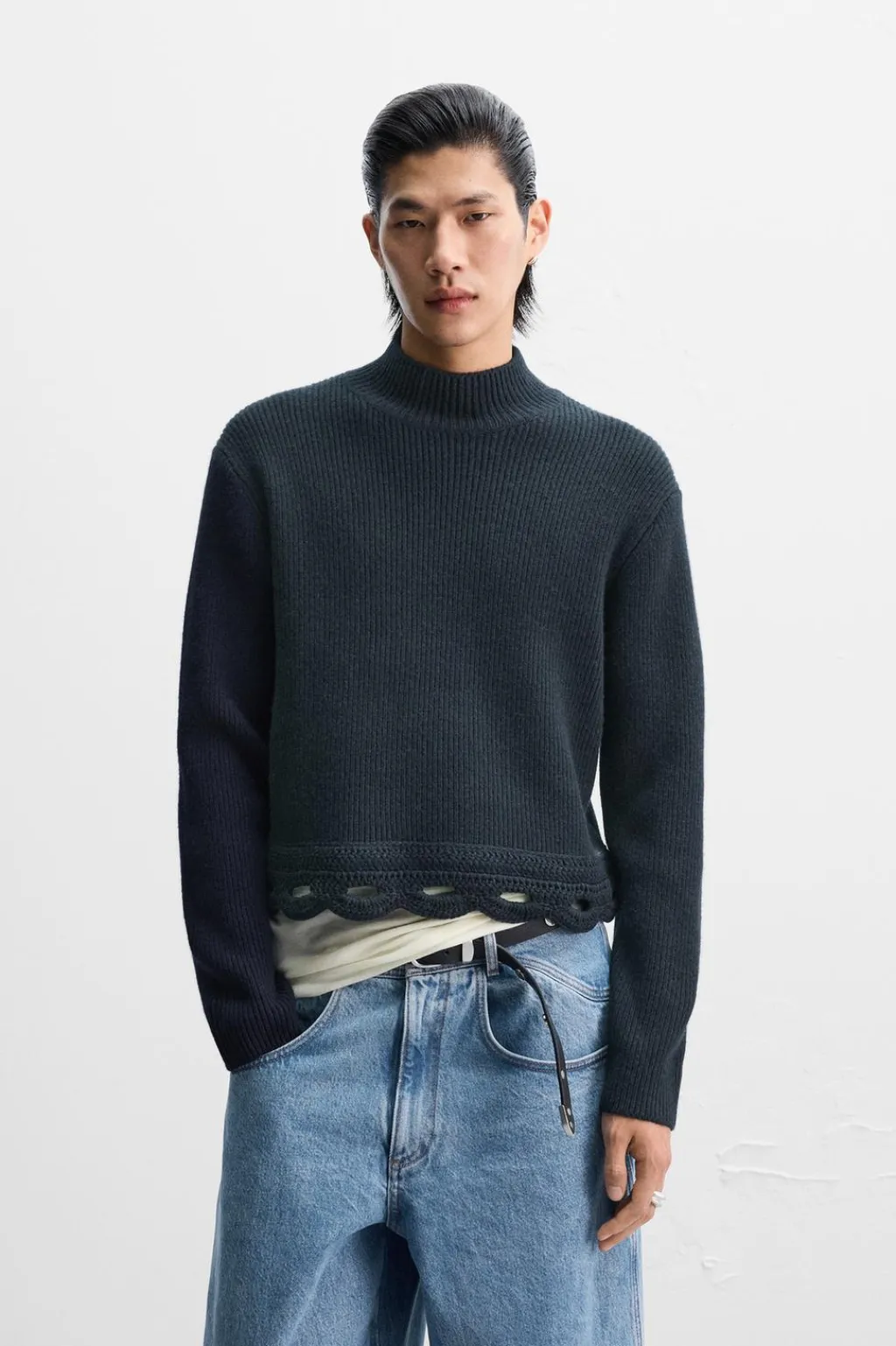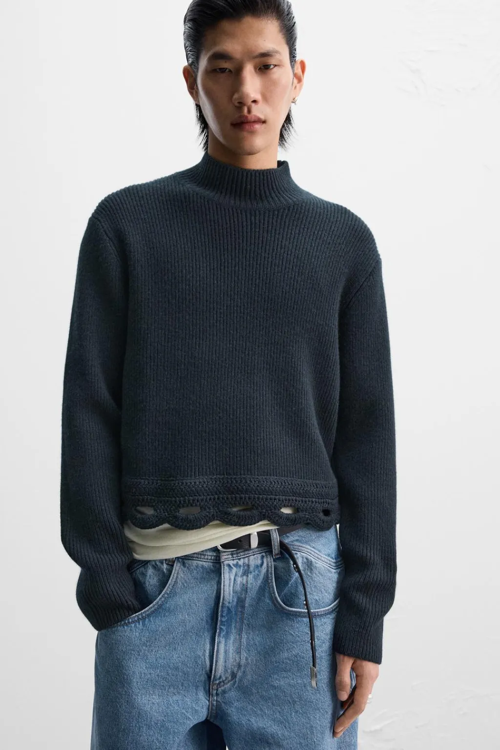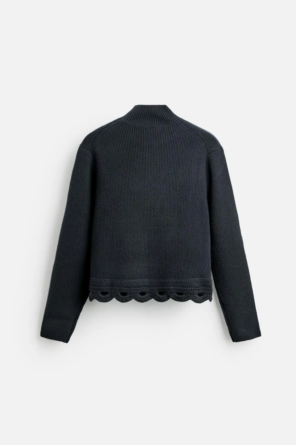Jersey cropped fit tejido en hilatura con mezcla de lana y yak. Cuello perkins y manga larga. Bajo acabado con crochet geométrico. Acabados en rib.