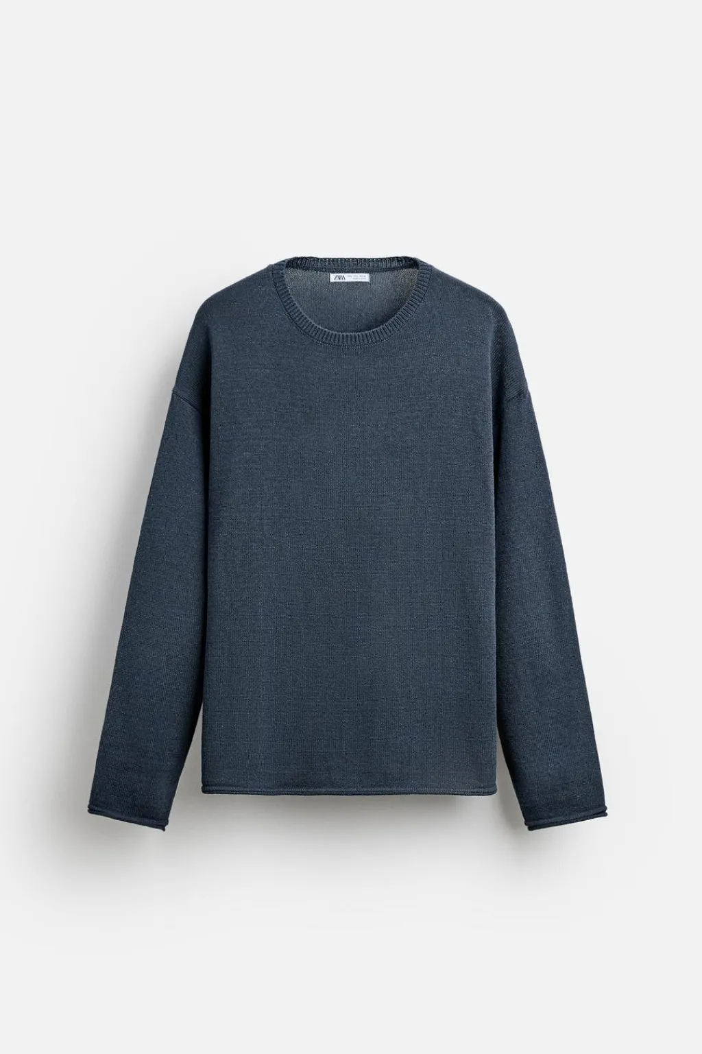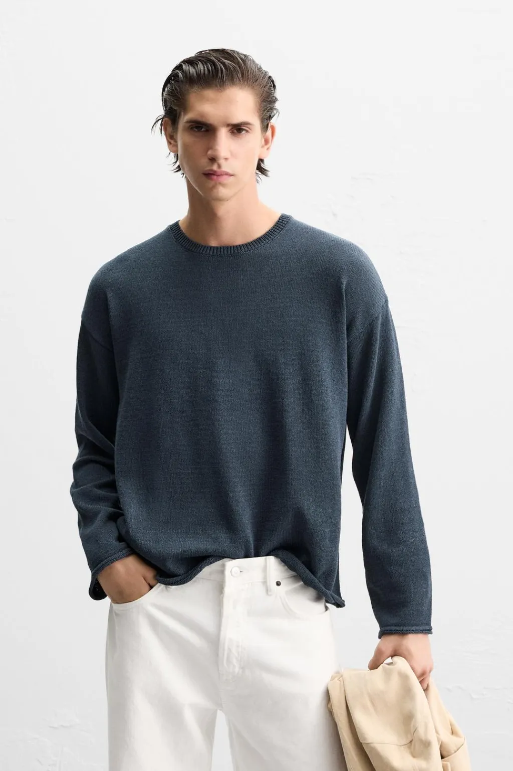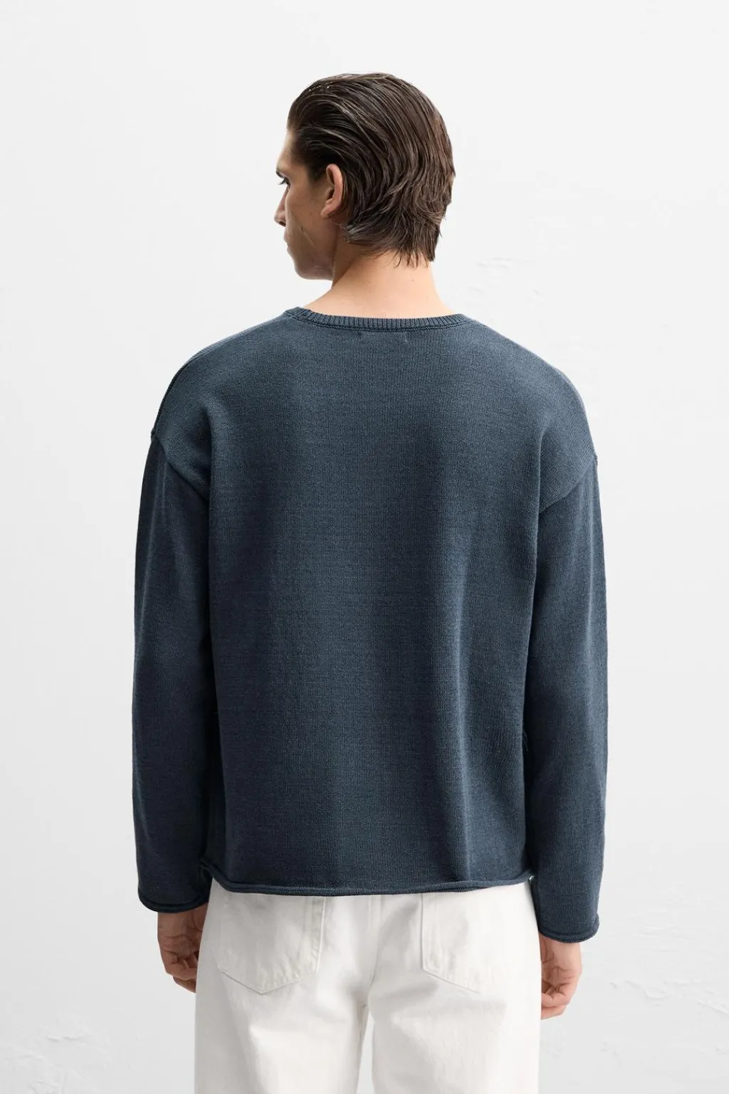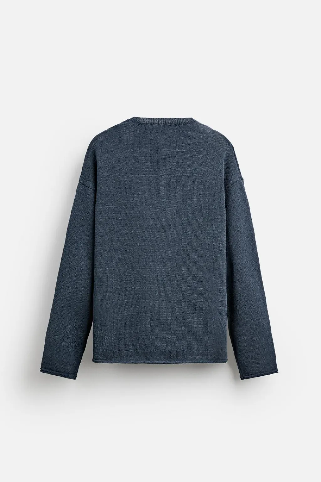 Jersey relaxed fit tejido en hilatura con textura rústica. Cuello redondo y manga larga. Acabados con relieve tubular.