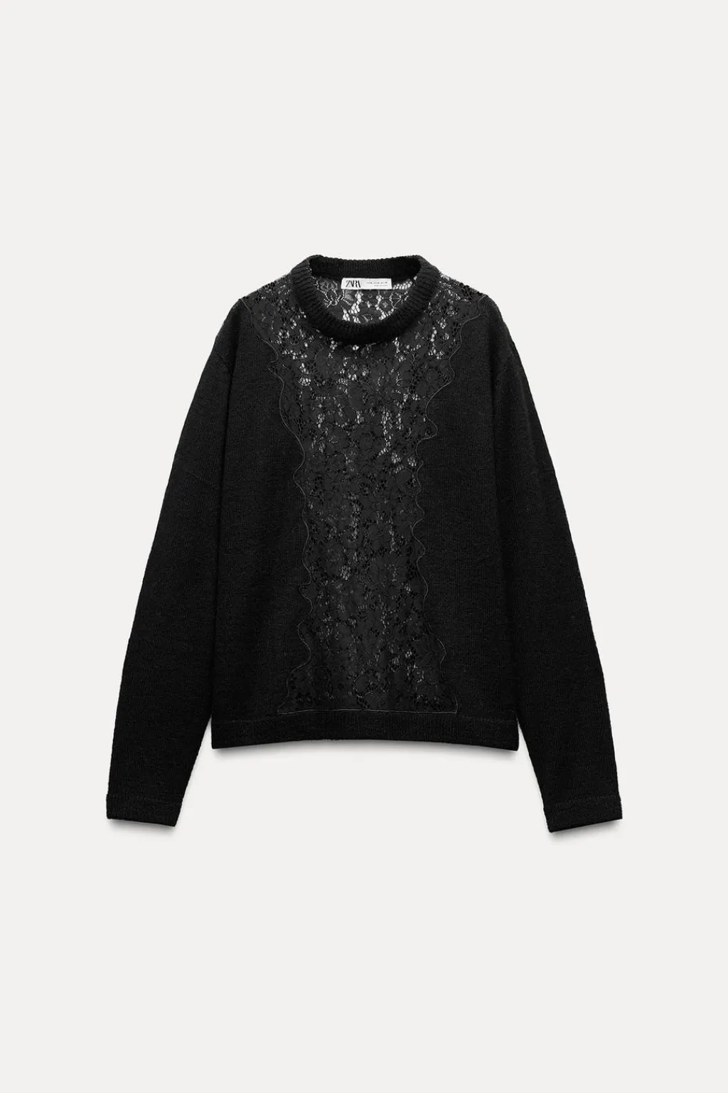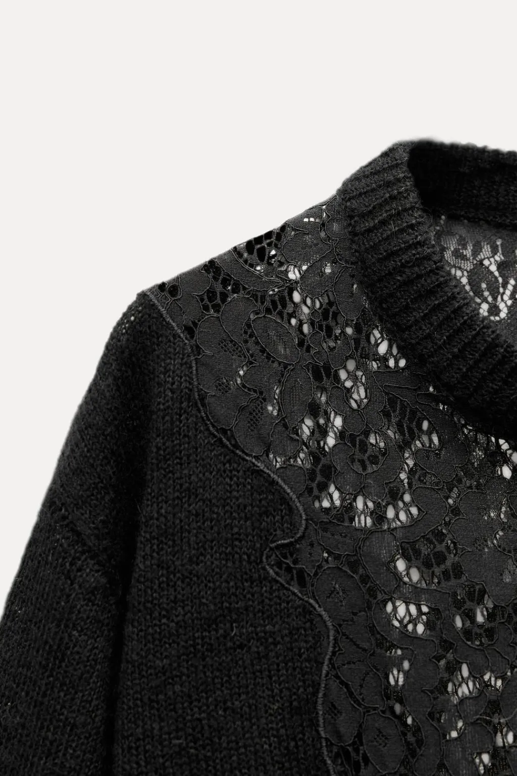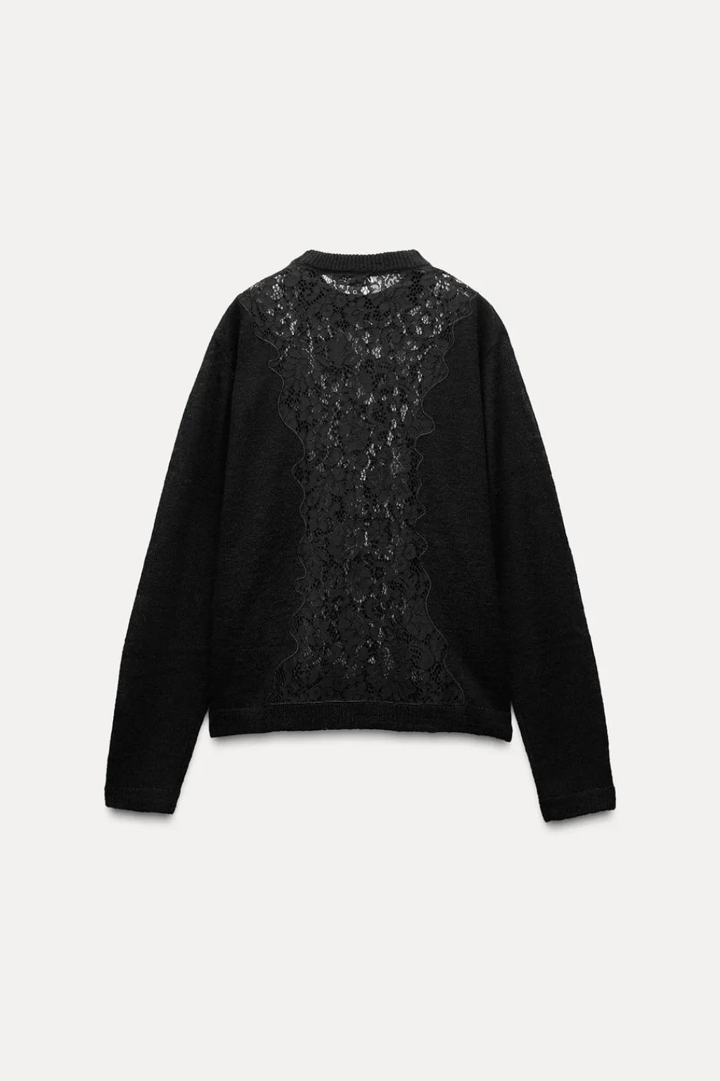 Jersey de cuello redondo y manga larga. Detalle de tejido combinado con encaje. Acabados en rib.