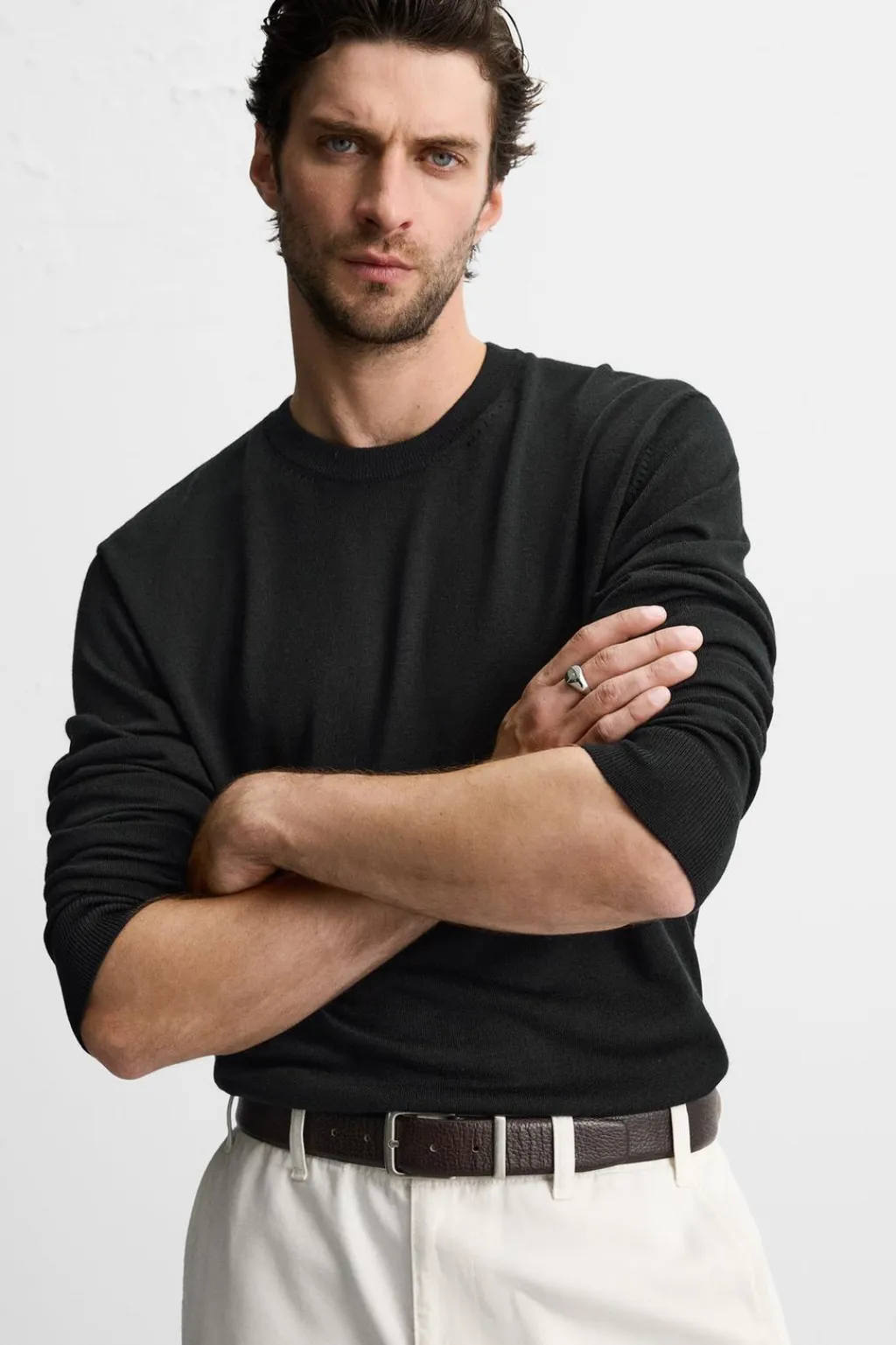 Jersey regular fit tejido en hilatura de lana merino. Cuello redondo y manga larga. Acabados en rib.
