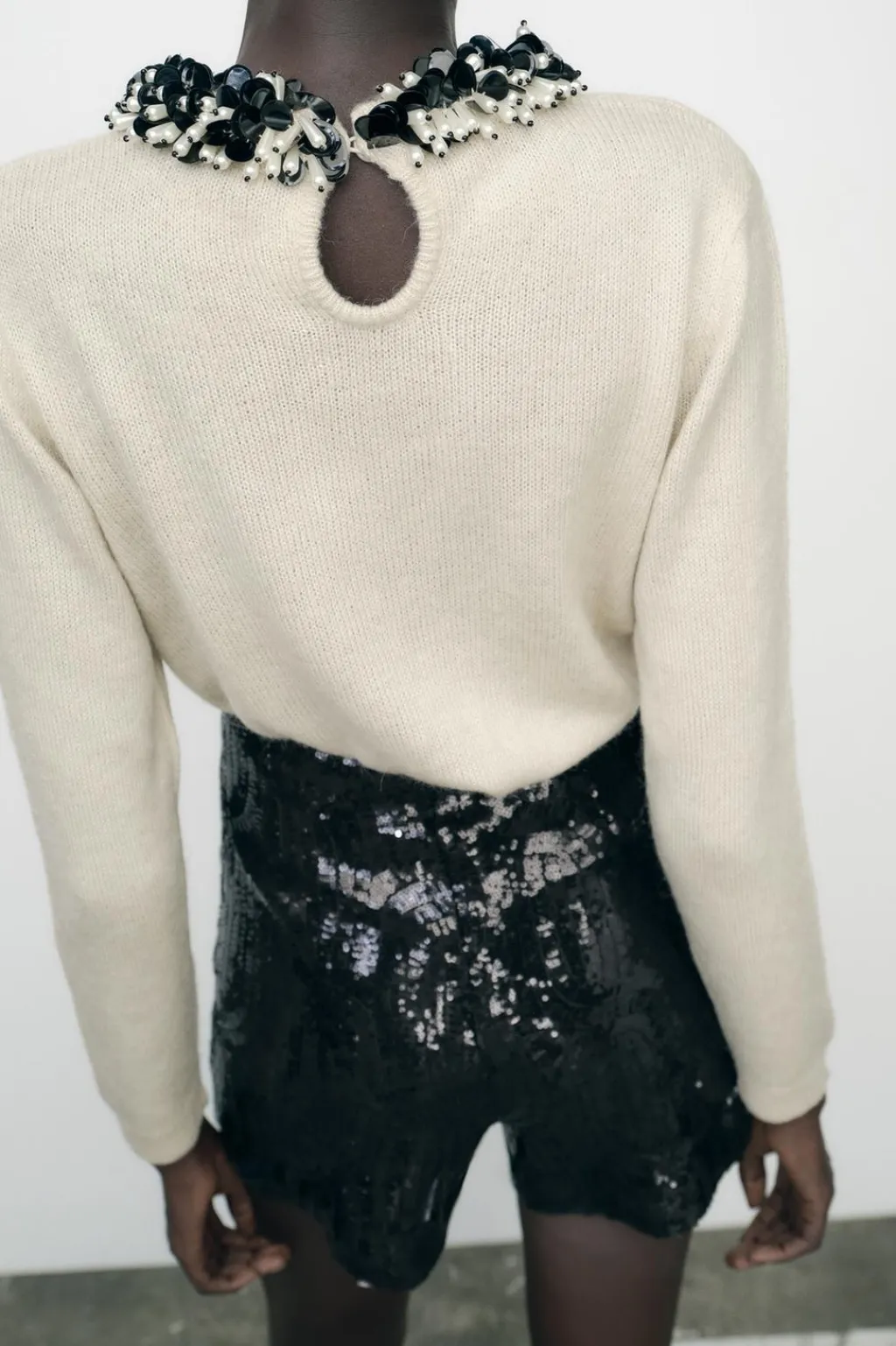 Jersey de punto liso con abalorios en el cuello y manga larga. Acabados en rib. Cierre en espalda con abertura y botón.