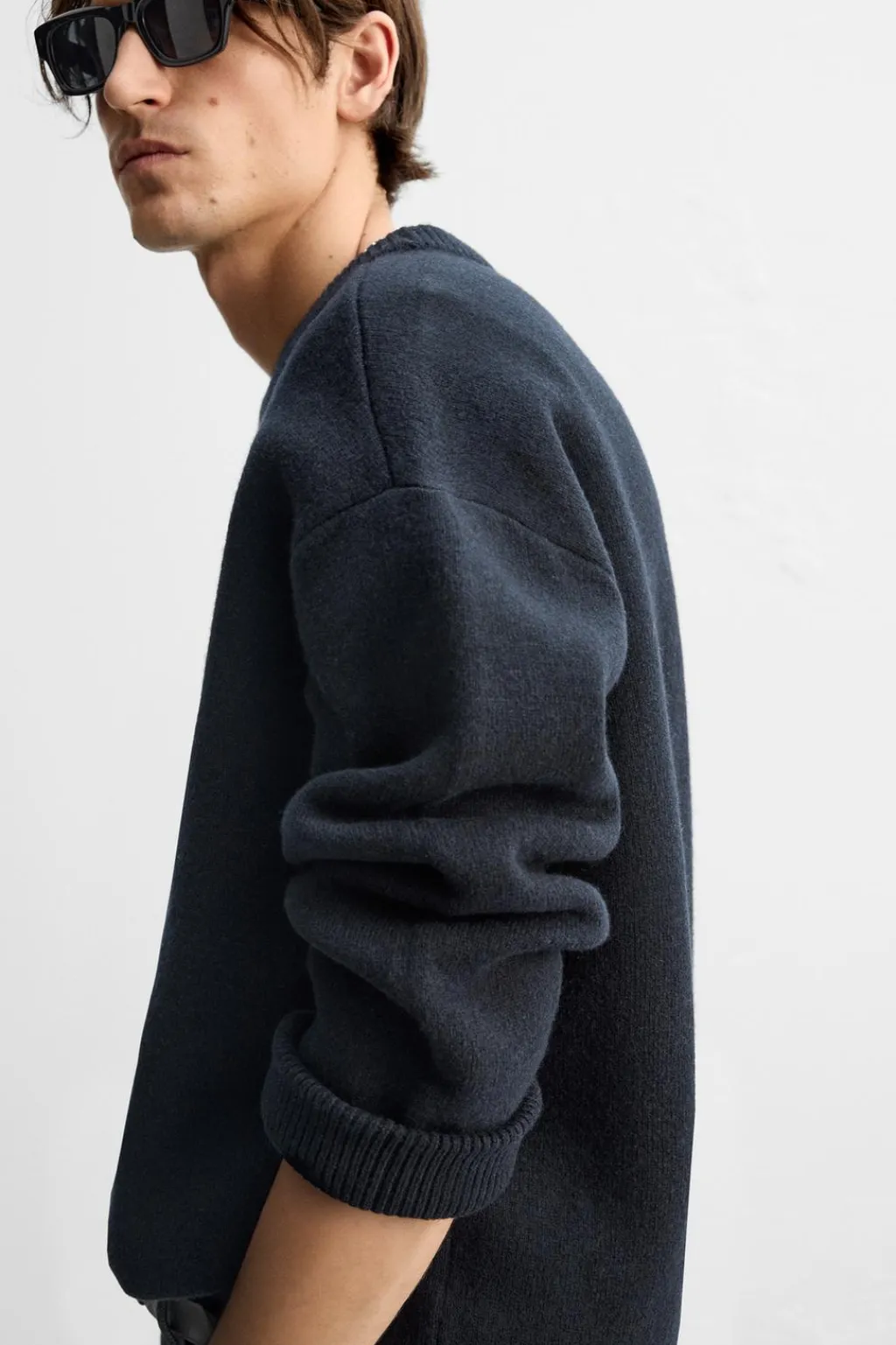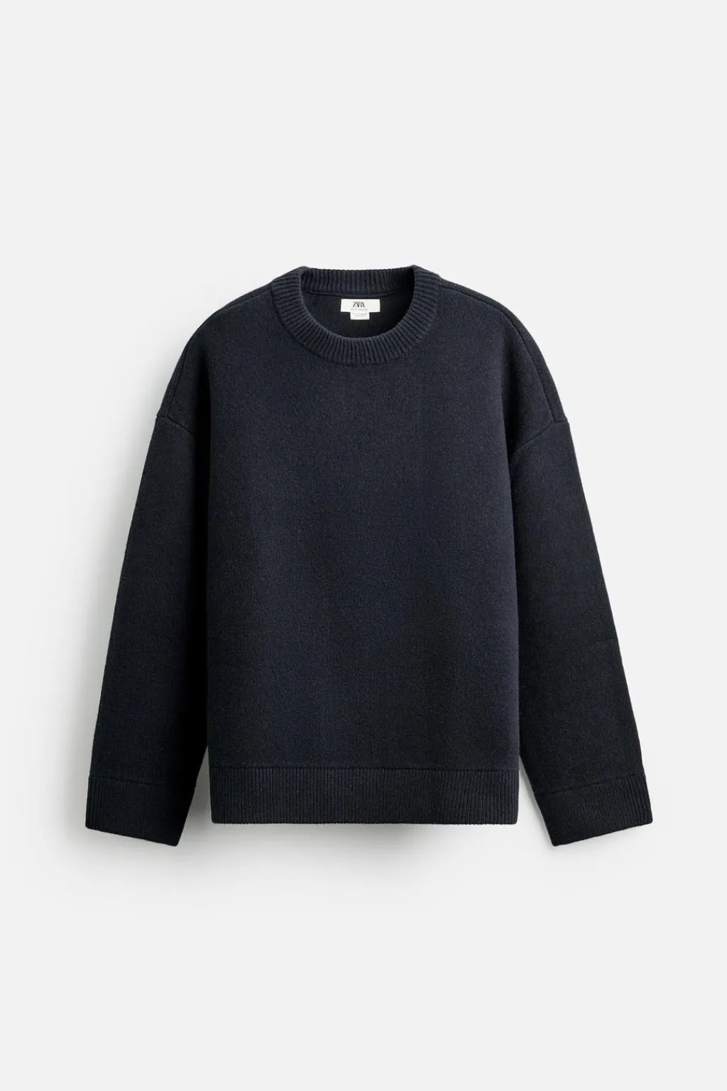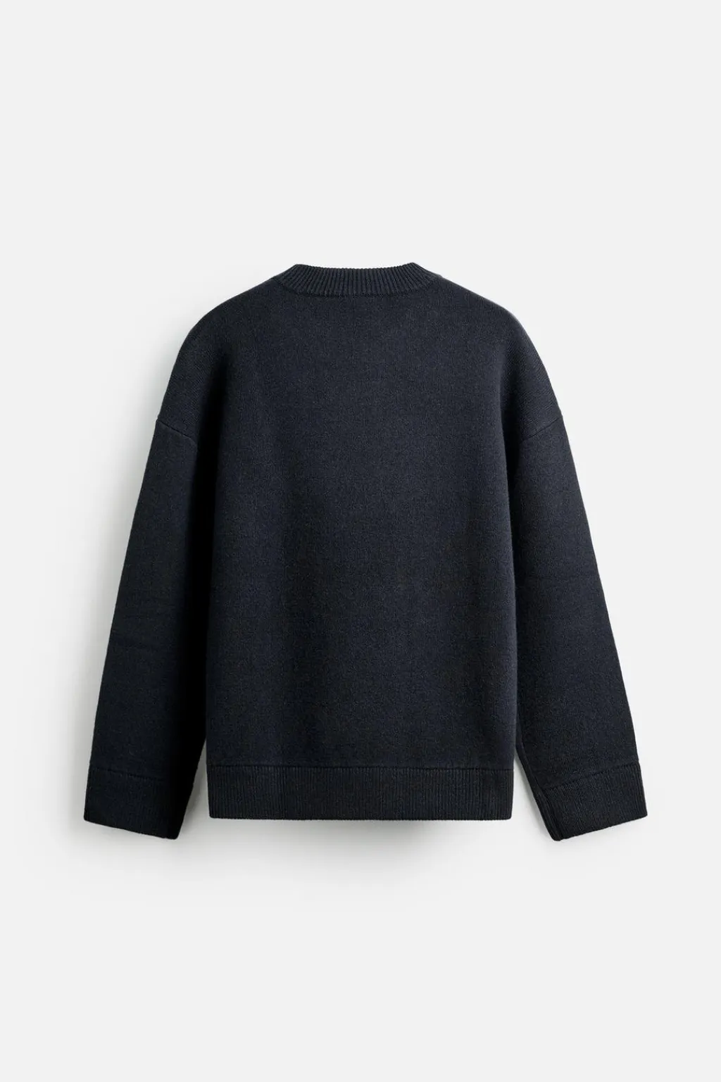 Jersey relaxed fit de punto compacto tejido en hilatura con mezcla de lana. Cuello redondo y manga larga. Acabados en rib.