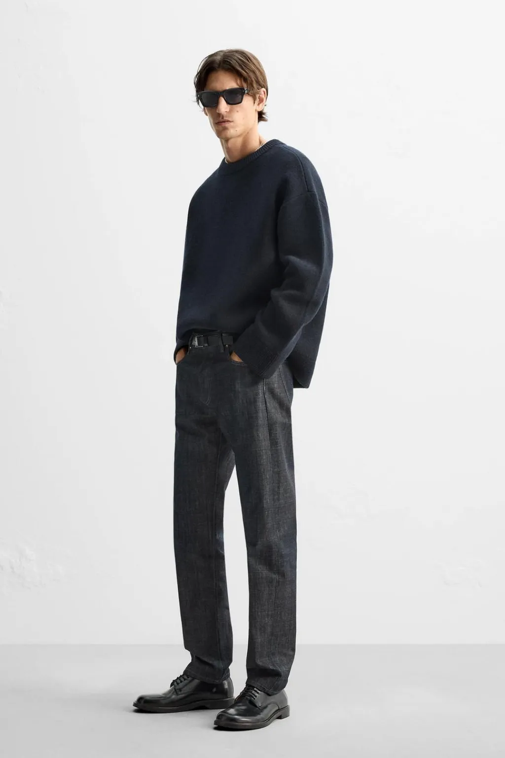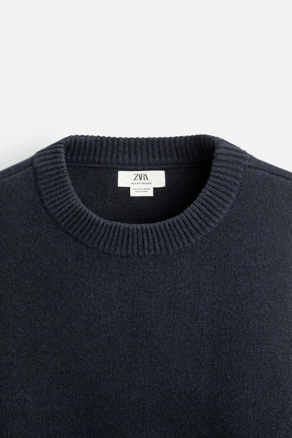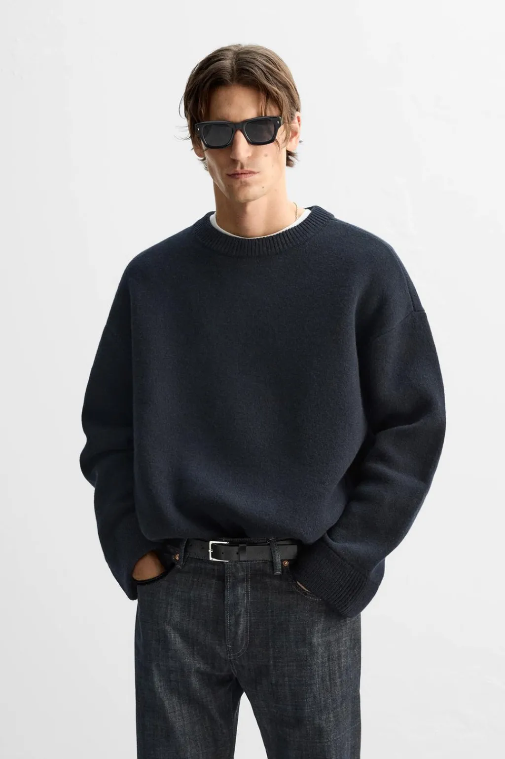 Jersey relaxed fit de punto compacto tejido en hilatura con mezcla de lana. Cuello redondo y manga larga. Acabados en rib.