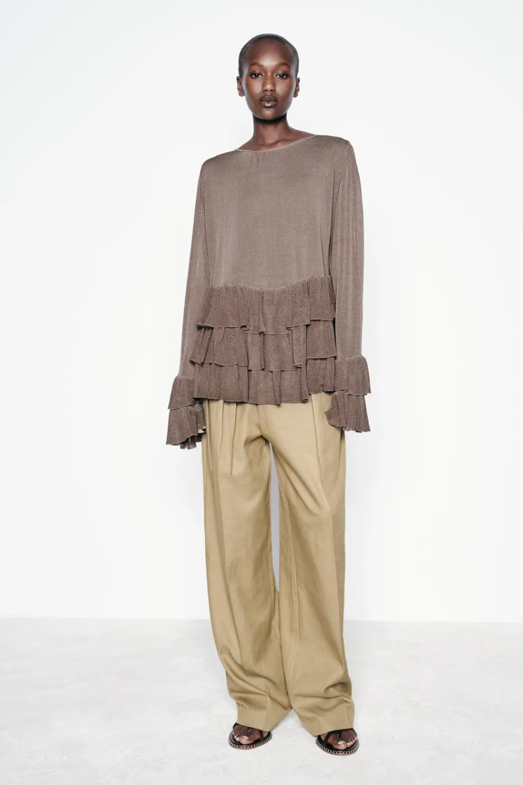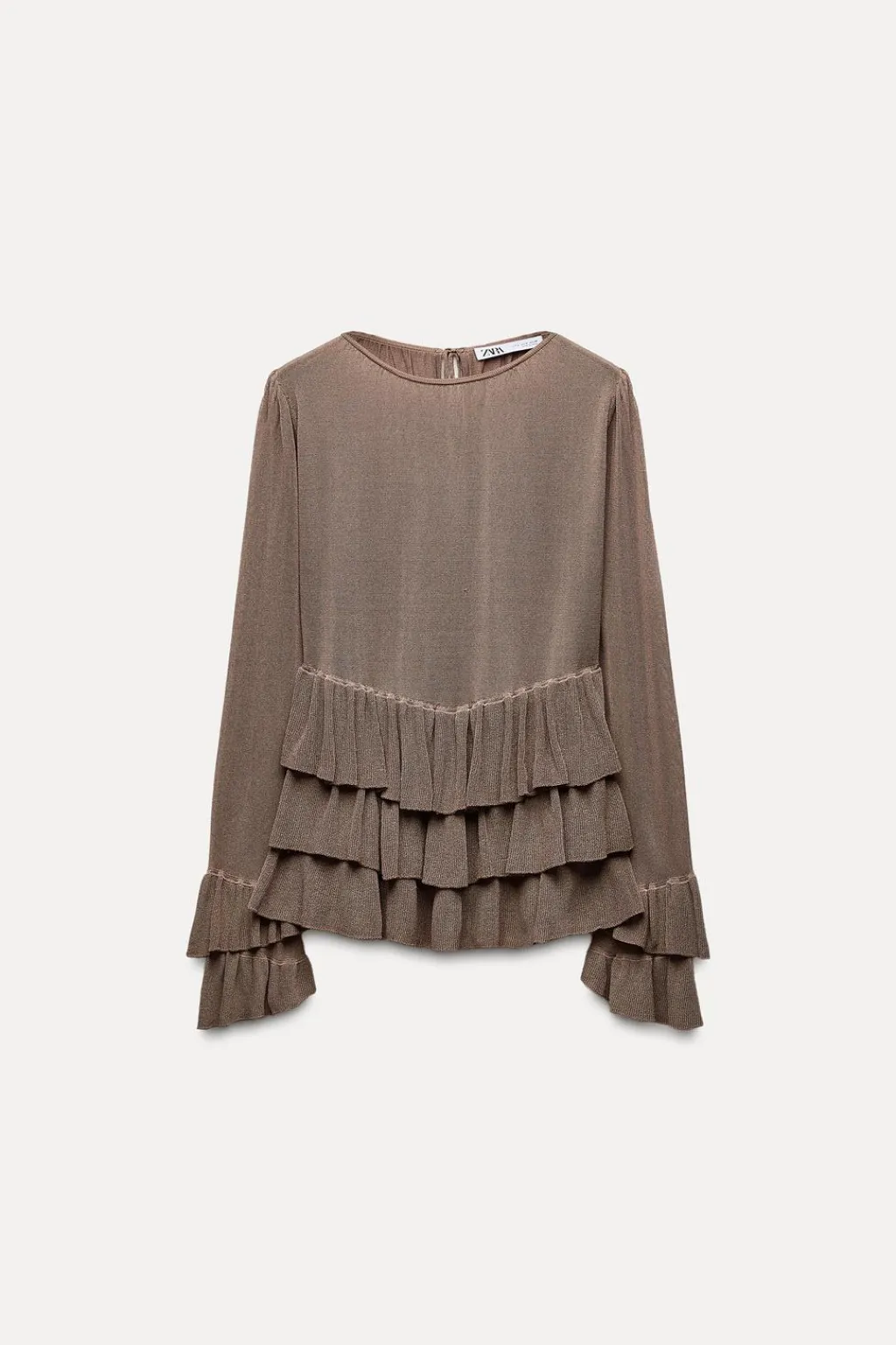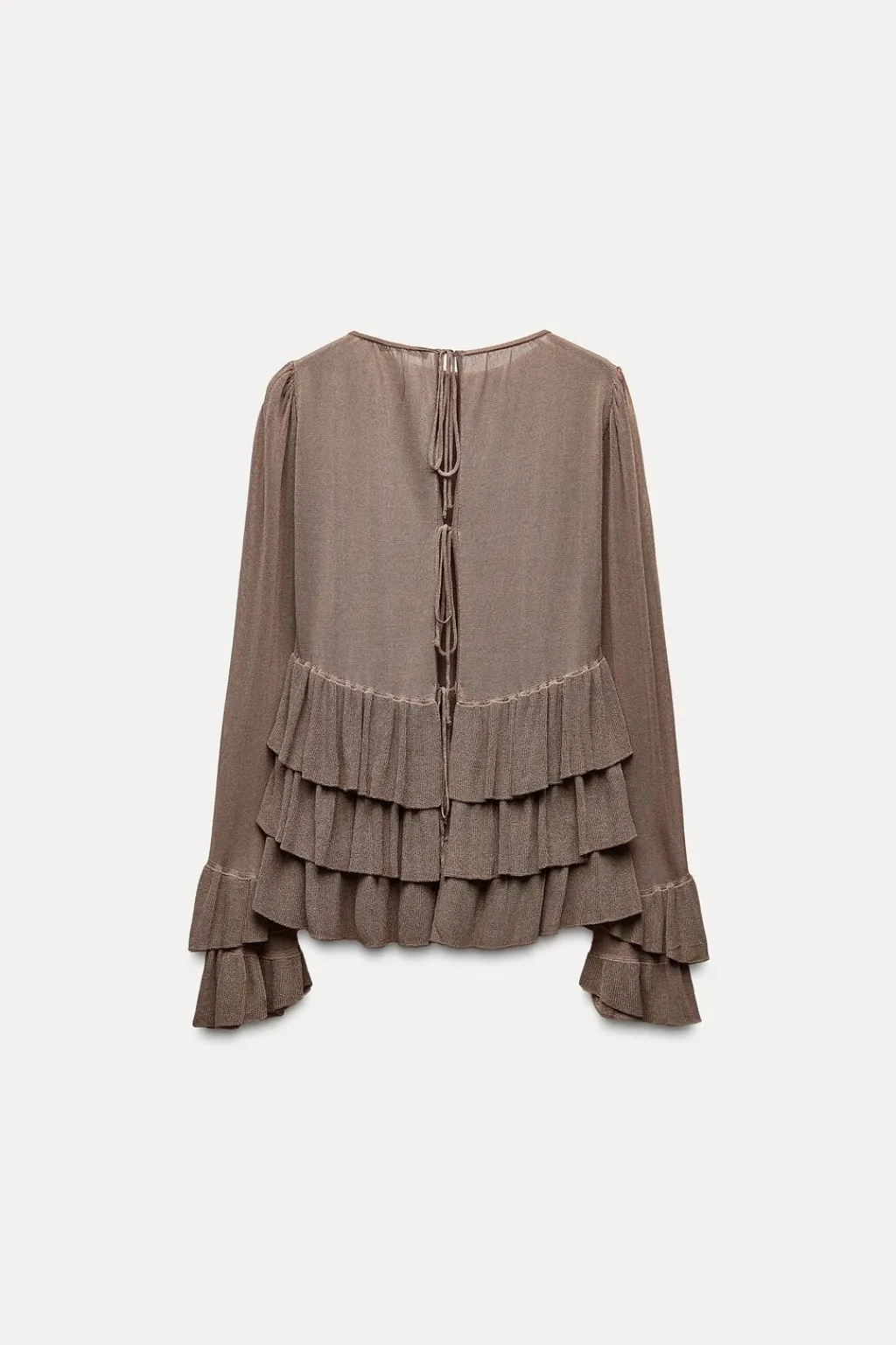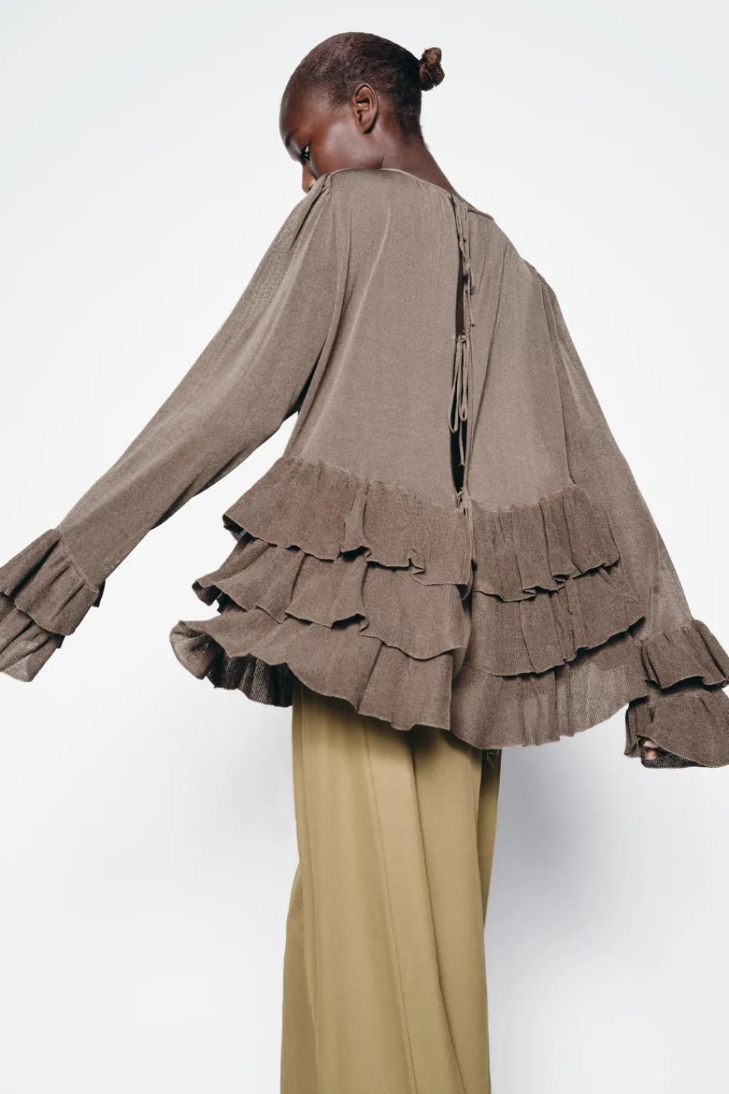 Jersey de punto fino con cuello redondo amplio y manga larga. Acabados con volantes. Cierre en espalda con lazos.