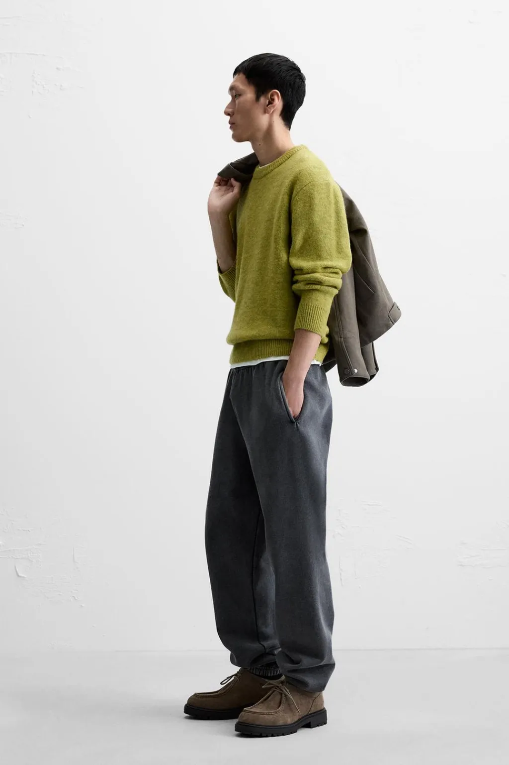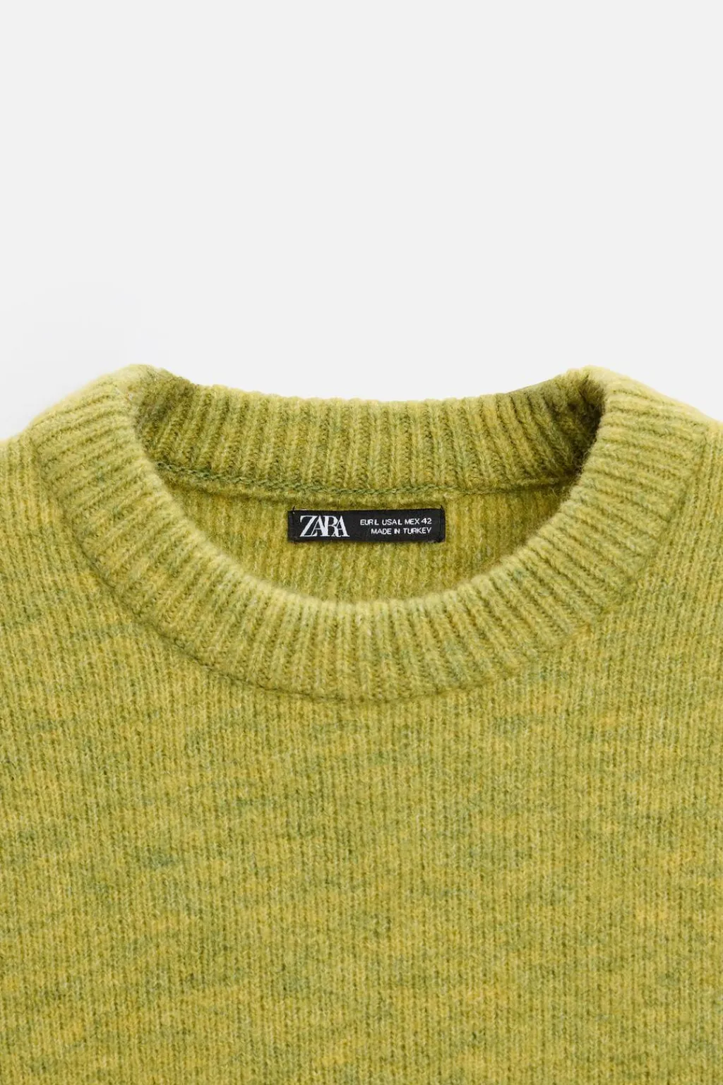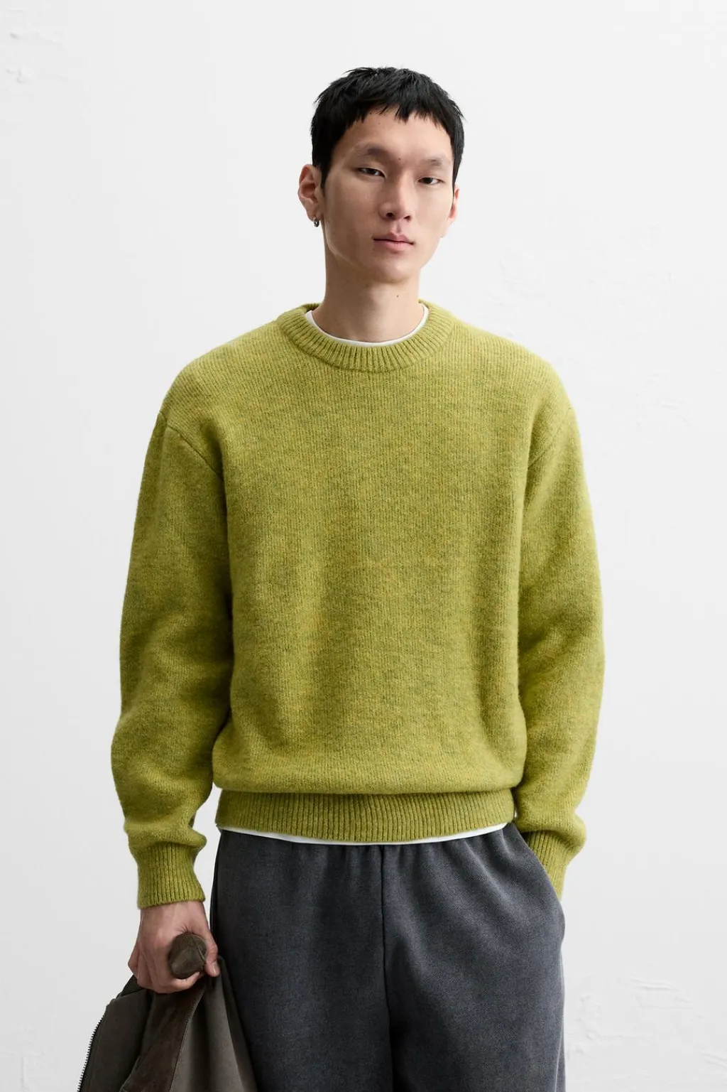Jersey relaxed fit tejido en hilatura con textura efecto pelo. Cuello redondo y manga larga. Acabados en rib