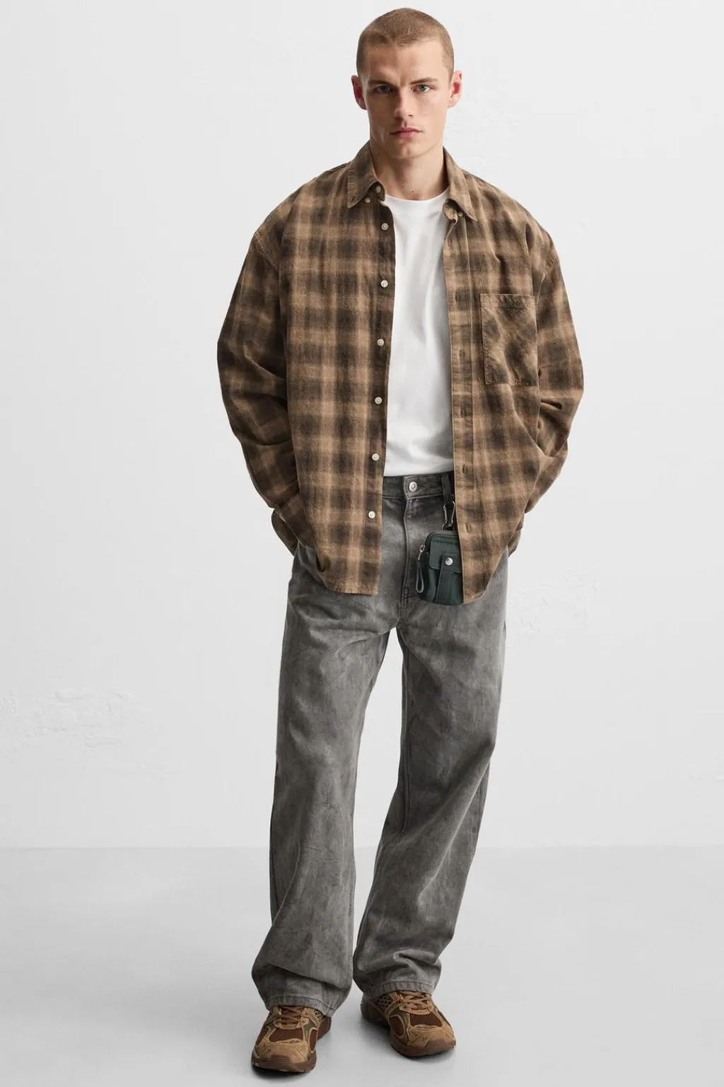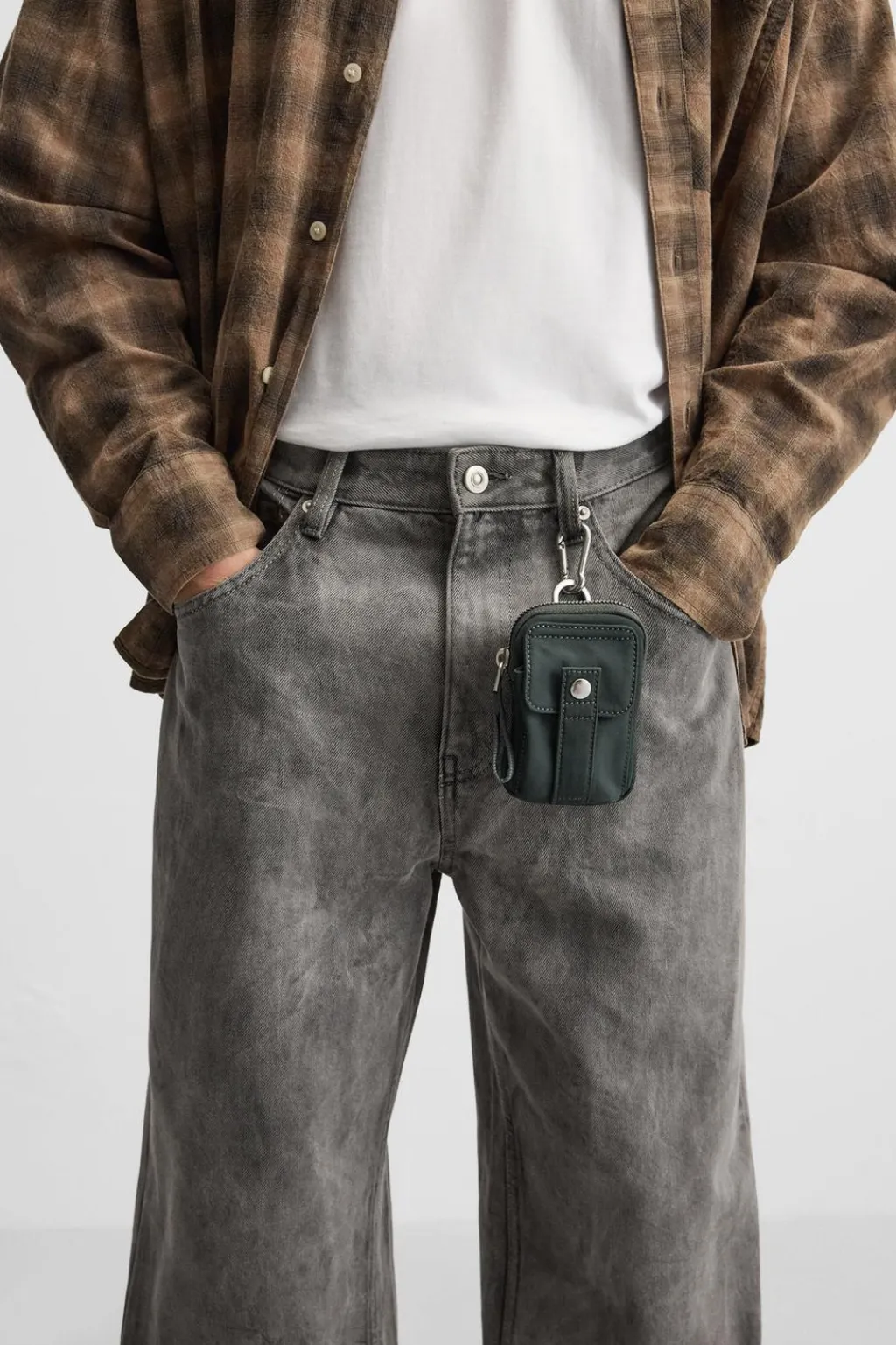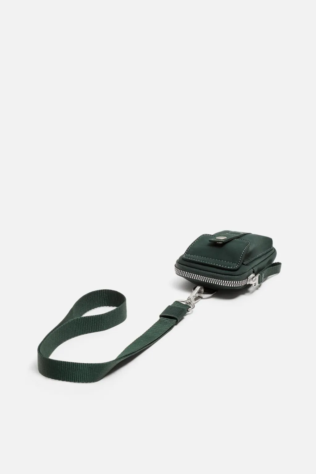 Mini bandolera confeccionada en tejido técnico. Compartimento principal con cierre mediante cremallera. El interior cuenta con un bolsillo plano. Parte frontal con bolsillo con cierre mediante botón a presión. Dispone de un cordón para llevar colgado. Además tiene una anilla y ganchos metálicos.