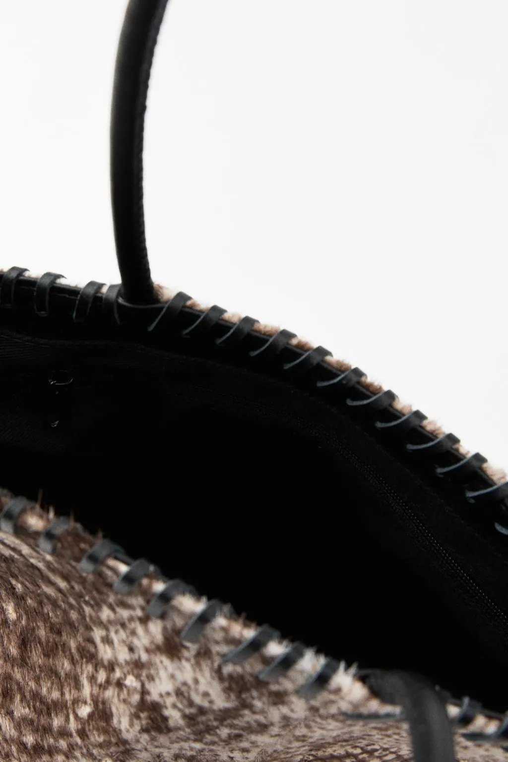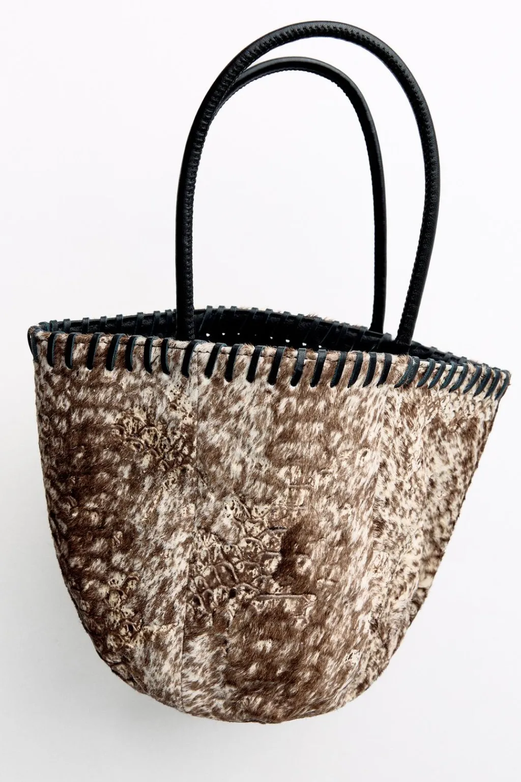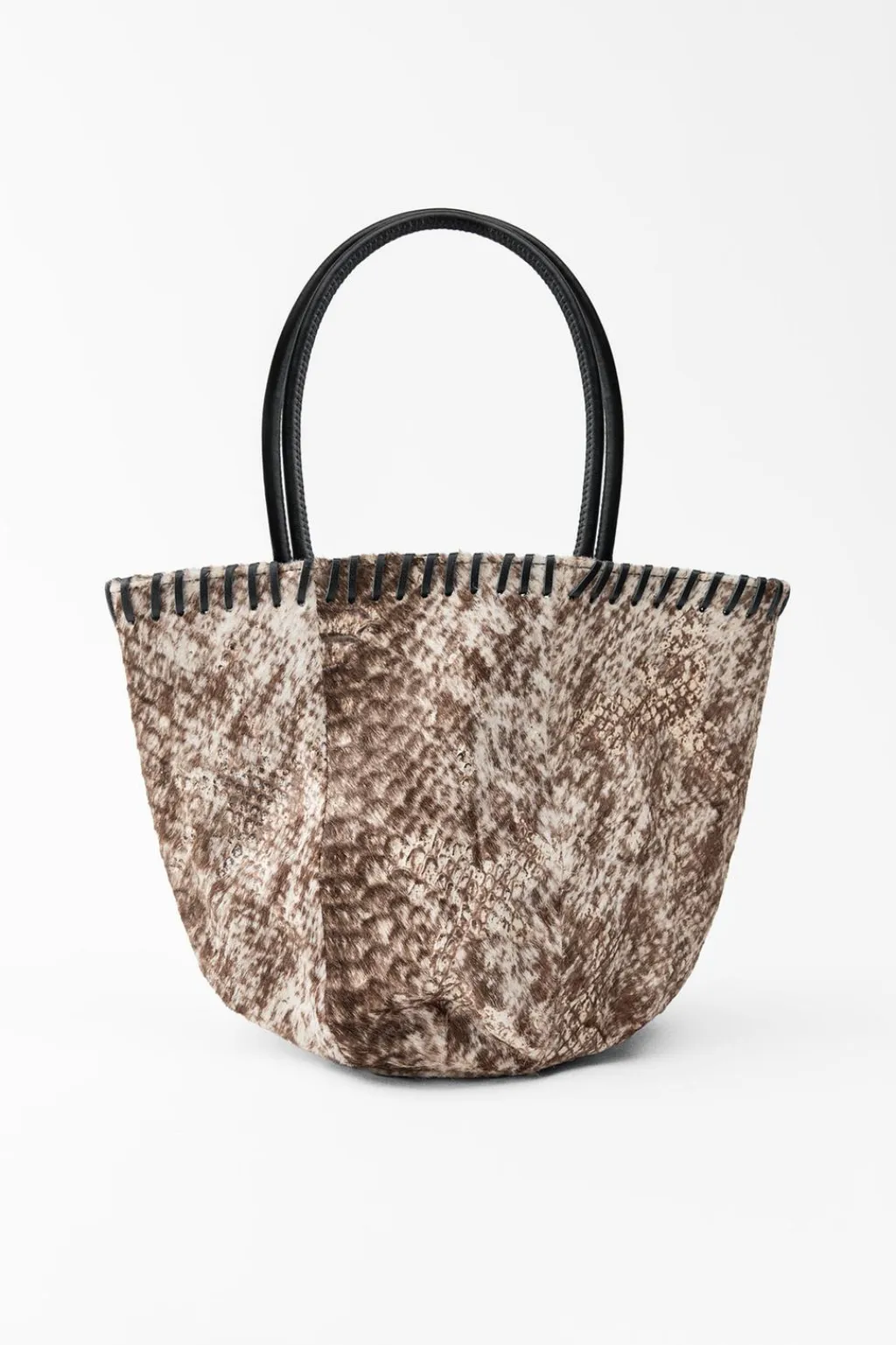 Bolso estampado formato mini saca realizado en piel 100%. Asas de mano y costuras a contraste.