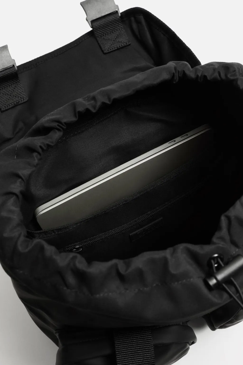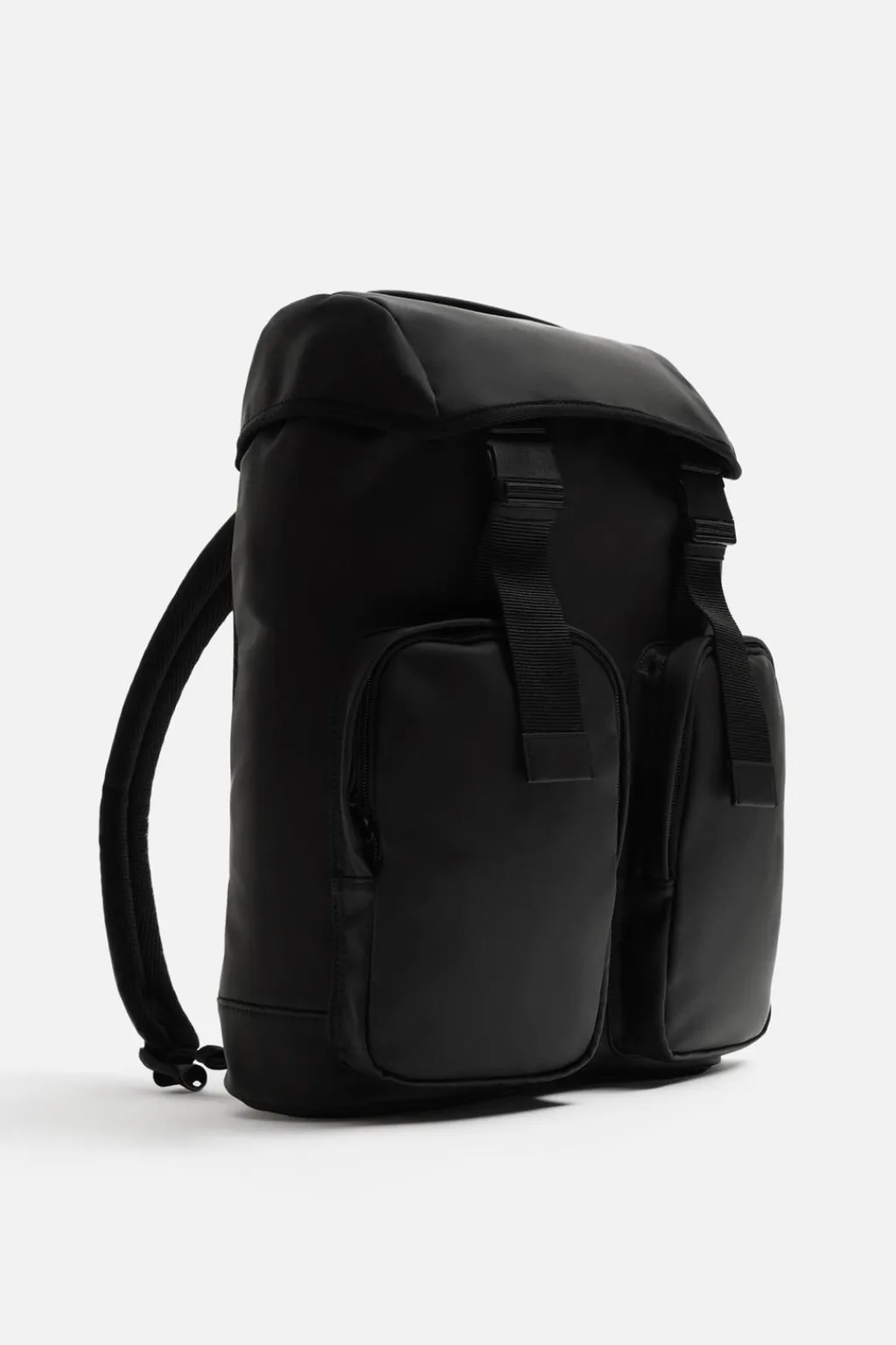 Mochila multibolsillos de acabado engomado. Compartimento principal con solapa, fruncido y cierre con doble hebilla de liberación rápida. En su interior dispone de un compartimento para dispositivos electrónicos de hasta 13 pulgadas y de un bolsillo con cierre mediante cremallera. Parte frontal con dos bolsillos laterales con cierre mediante cremallera. Dispone de un asa de mano y dos asas de hombro ajustables. La parte trasera está acolchada y es transpirable para favorecer el confort durante su uso.